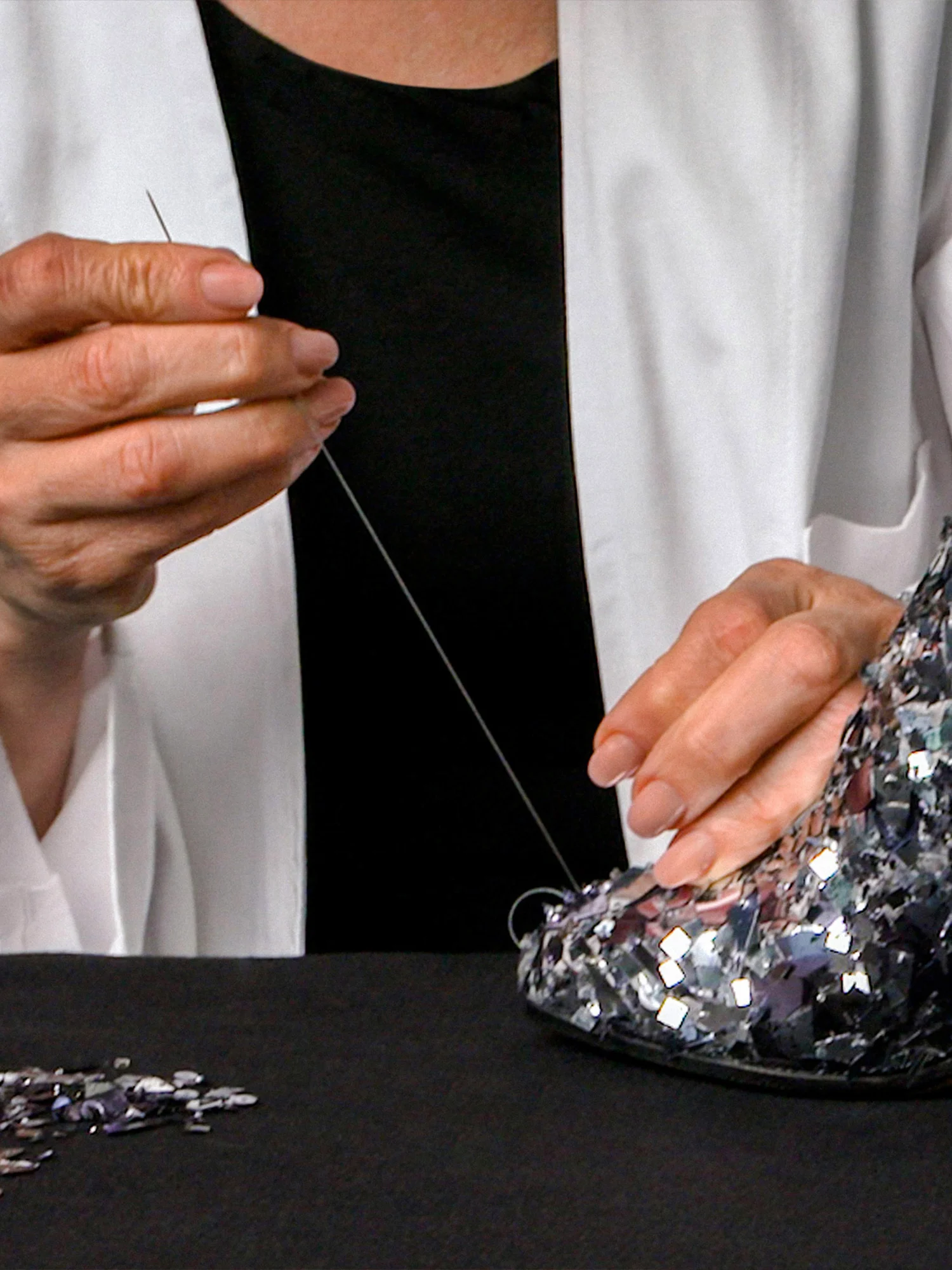 近日,Maison Margiela 推出了全新 TABI COLLECTOR’S SERIES 企划,首款产品为 Tabi Broken Mirror Embroidery。该系列以标志性鞋款 Tabi 为主题,通过新的技法和材质重新诠释品牌的精神与美学,将于每年推出一款限量版产品。首款作品灵感源自 2015 秋冬 Artisanal 系列中的「Broken Mirror」图案,采用三维方式重新诠释,展现出「光的反射」和「金属银色的世界观」。鞋面采用银色涂层皮革,经过裂纹处理,并手工刺绣超过 8,000 颗透明玻璃珠、亮片及激光切割的金属配件,最终呈现出破碎玻璃表面的独特纹理。