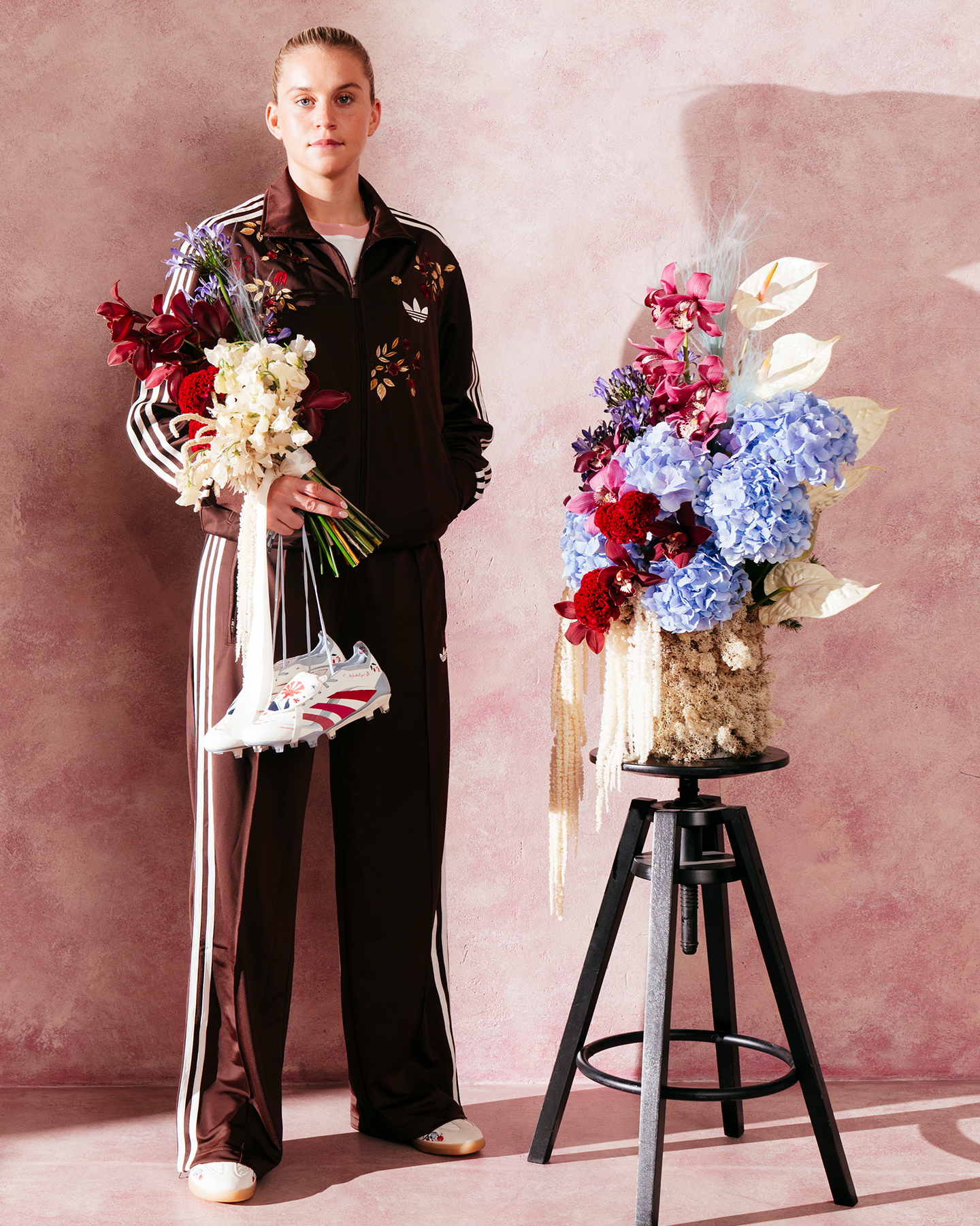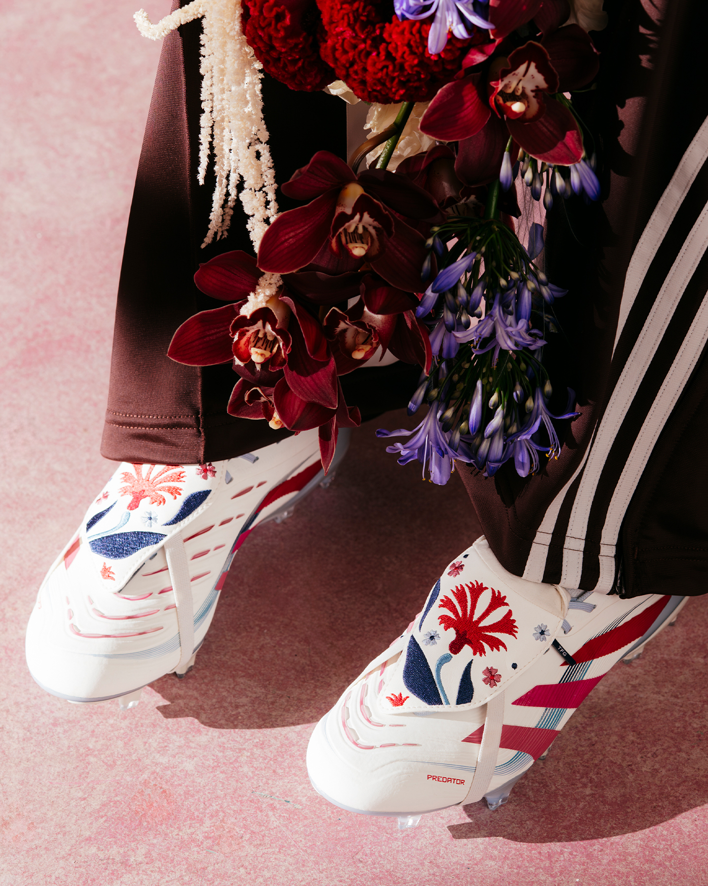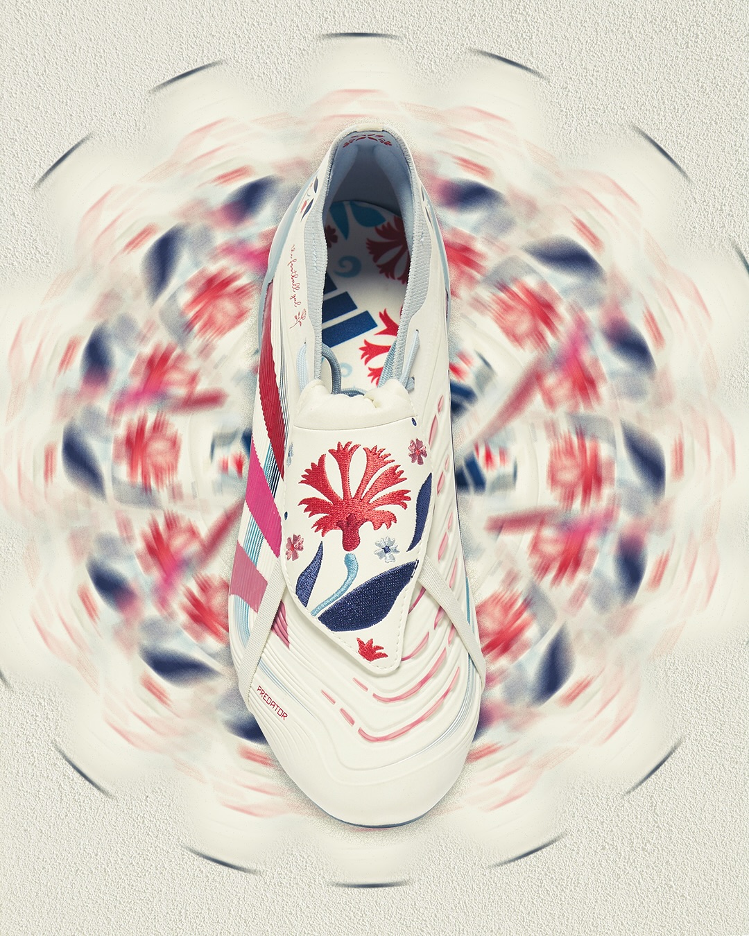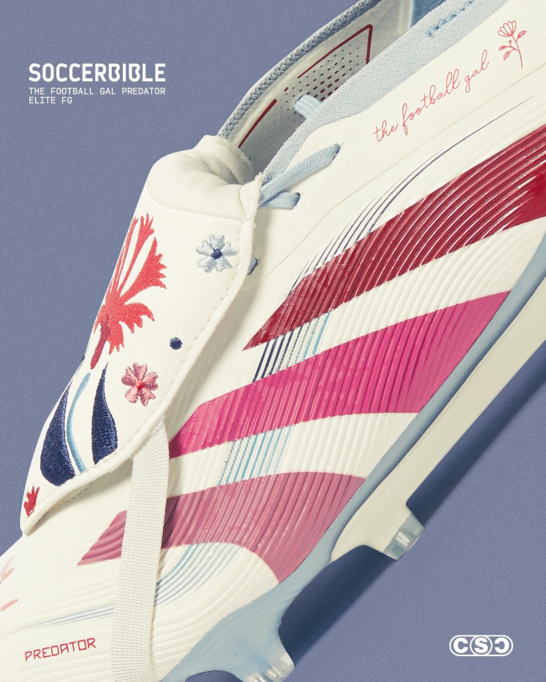 adidas 与伦敦的一名足球迷艺术家 The Football Gal 合作推出特别版 Predator TFG 足球鞋,融合了艺术性、个性与性能,以简洁的白色鞋面为基底,鞋钉、鞋带和鞋跟处点缀着柔和的蓝色细节,红粉渐变的三条纹为设计注入活力,搭配灵感源自康乃馨的花卉图案。鞋舌上饰有该艺术家打造的刺绣花朵图案,鞋帮处带有 The Football Gal 的标志性 Logo,呈现出精致的手工美感。adidas Predator TFG x The Football Gal 联名款足球鞋即将通过指定零售商和线上商店发售。