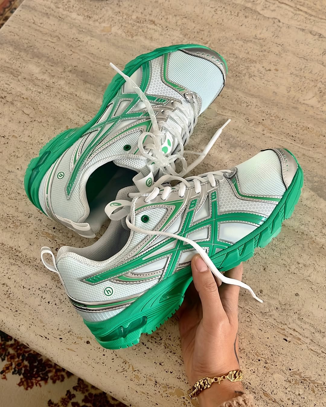 hidden.ny 与 ASICS 联手打造特别合作款 GEL-DS TRAINER 14「Dawn」配色,鞋款曾在今年 10 月底在 ComplexCon Las Vegas 2025 上首次亮相,如今定档在 11 月 7 日以及 21 日进行发售。以当代街头服饰和数字时代怀旧情怀为视角,重新诠释了 GEL-DS TRAINER 14 这款千禧跑鞋。「Dawn」采用白色鞋面为基底,融入 hidden.ny 标志性的翠绿色调,并增添了多个银色细节。ASICS 的跑鞋性能依然出色,包括轻盈的网眼鞋面、支撑性鞋面覆层以及品牌标志性的 GEL 缓震系统,带来舒适穿着体验。