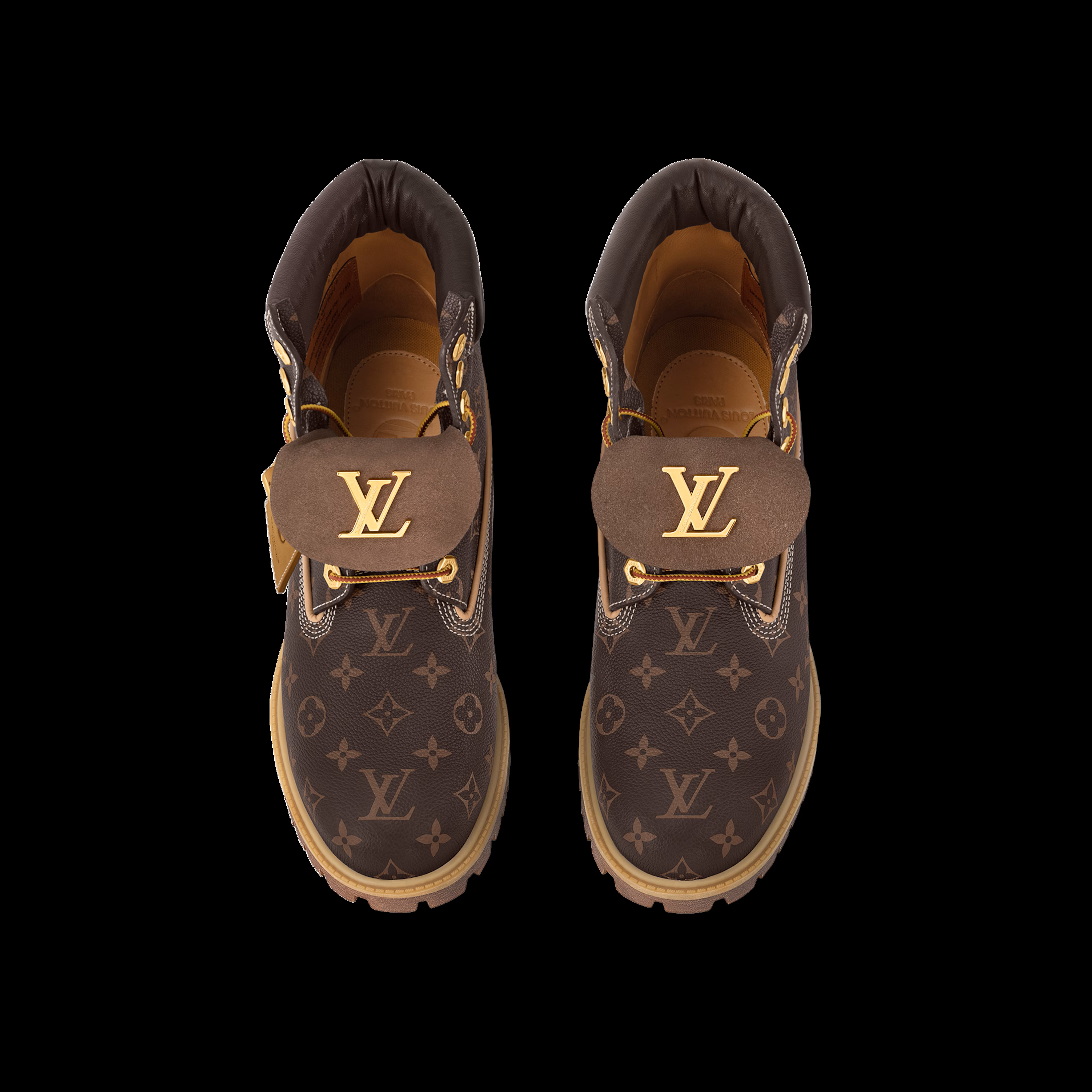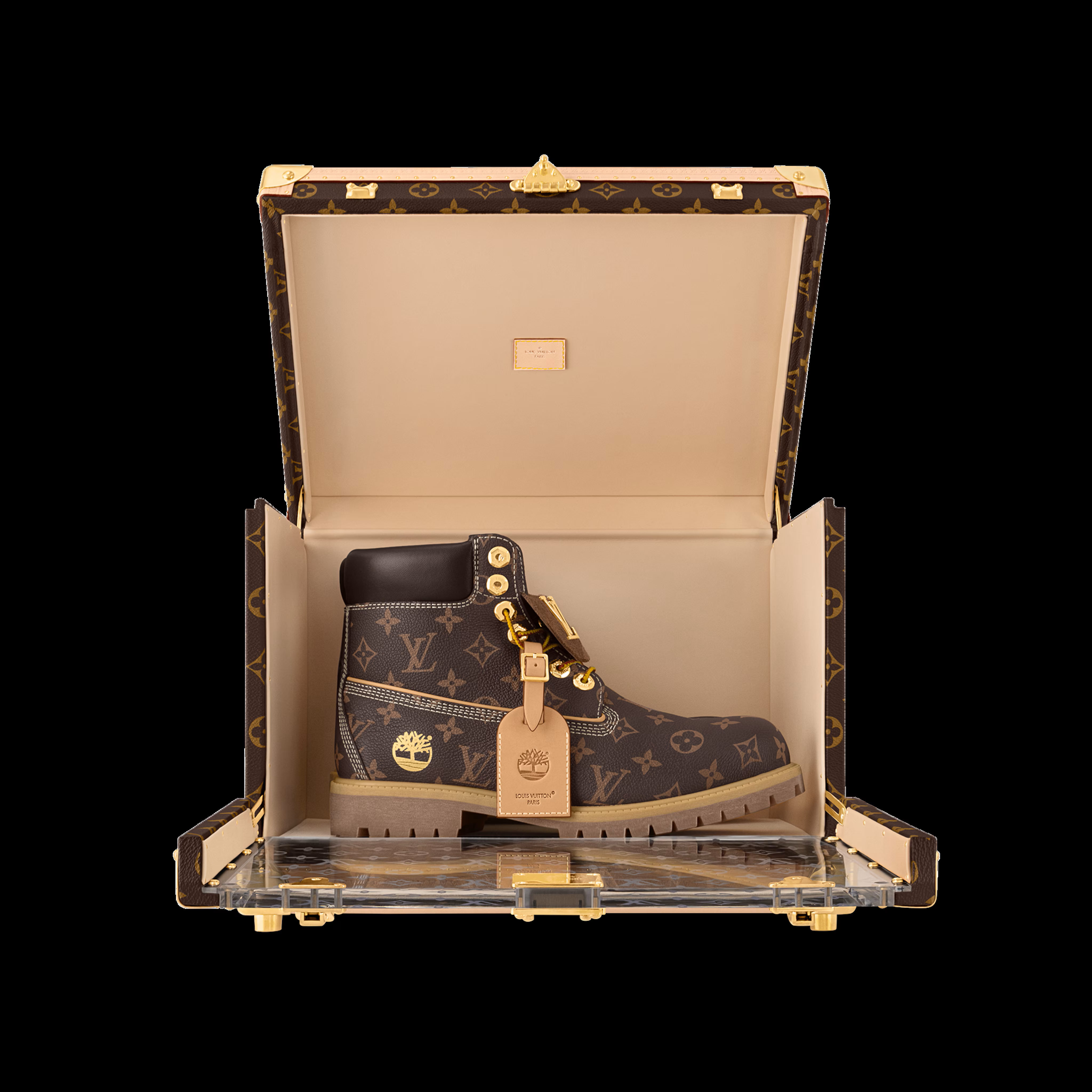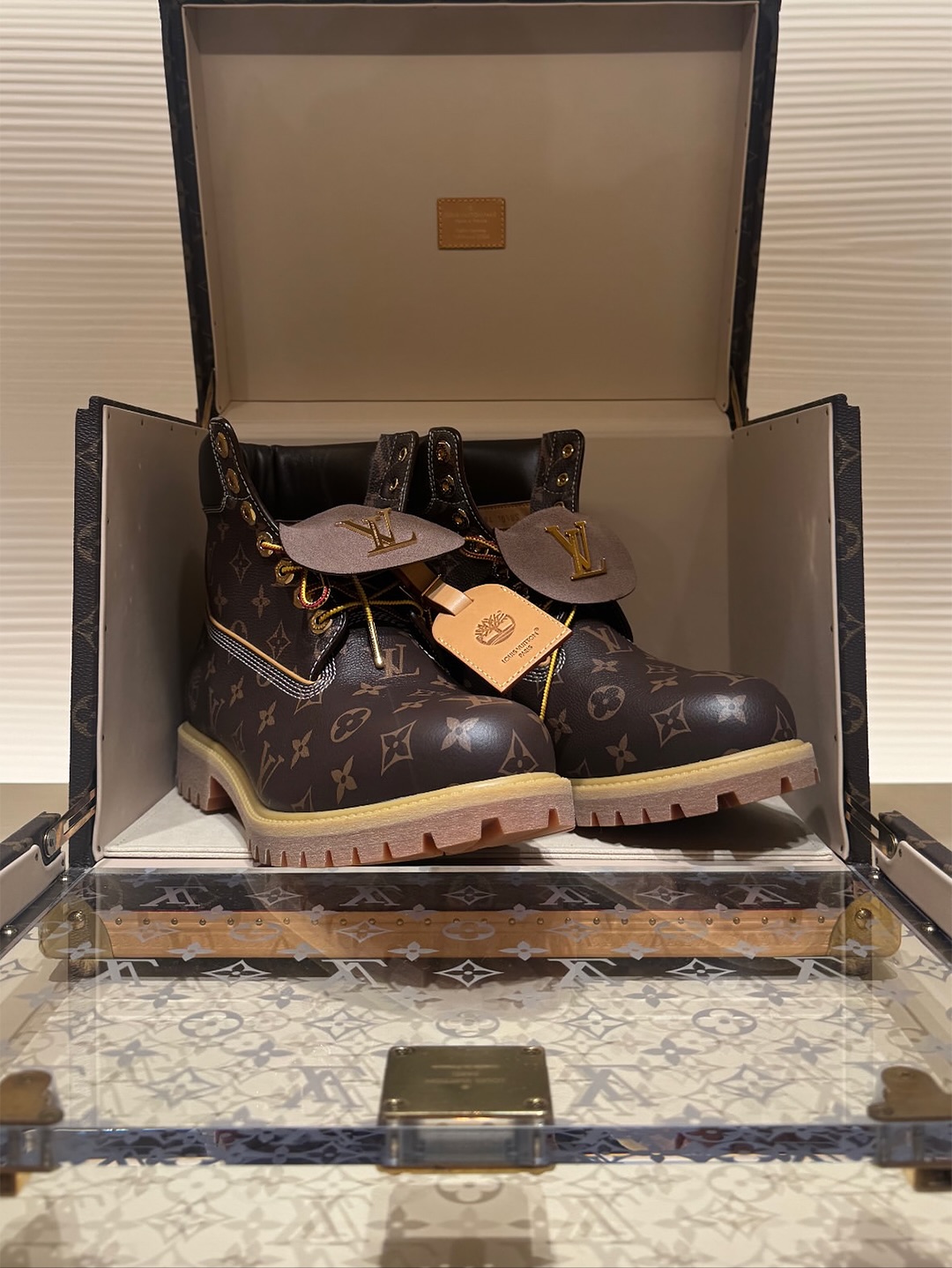 Pharrell Williams 设计的 LV x Timberland 6 英寸靴款以 LOUIS VUITTON 的奢华工艺重新诠释了这款经典型号。近期发布的这款全新的非凡之作限量发行 50 双,每双均有独立编号,由 LOUIS VUITTON 标志性的 Monogram 粒面小牛皮在意大利手工定制而成。鞋舌上的 LV 首字母缩写以及鞋带孔等细节装饰均使用 18K 黄金制造。配有采用了 Monogram 的硬质包装盒,以天然皮革饰边和 Monogram 有机玻璃打造。由于预计的发售价高达 85,000 美元,该联名鞋款在网络上引起热议。