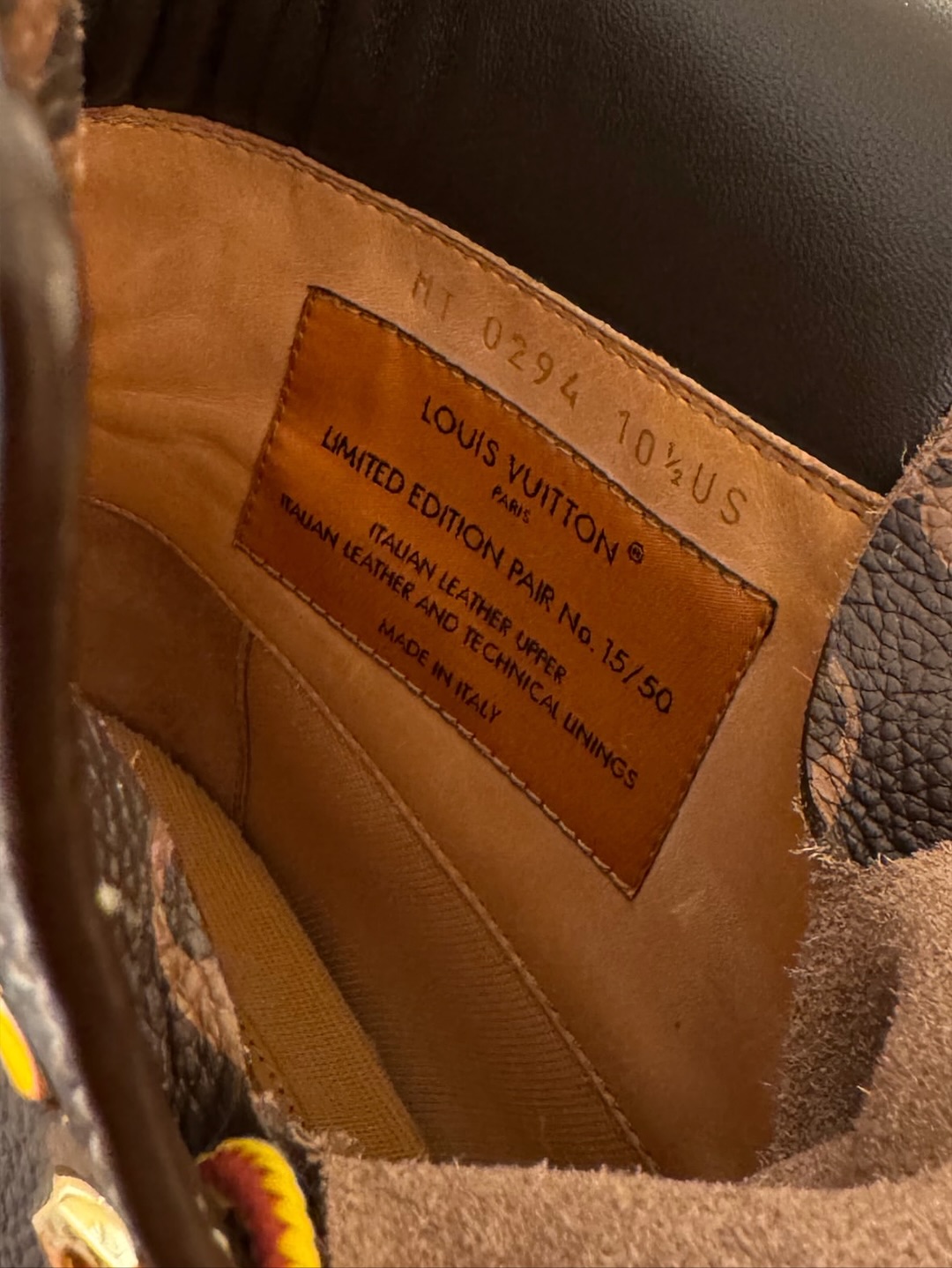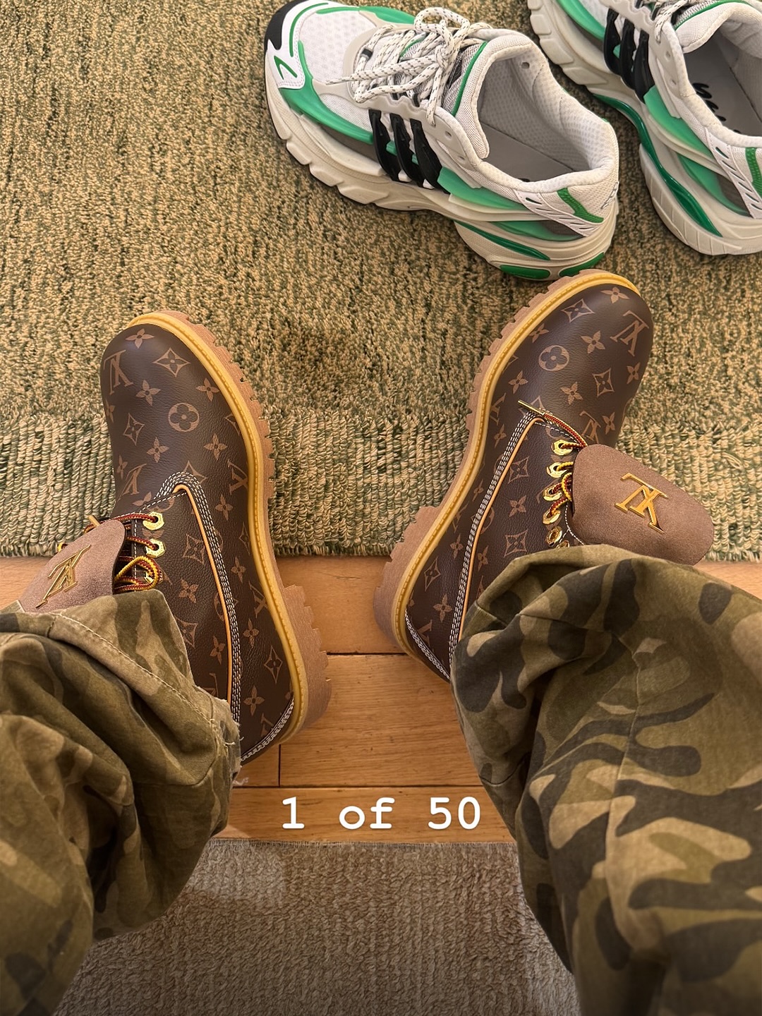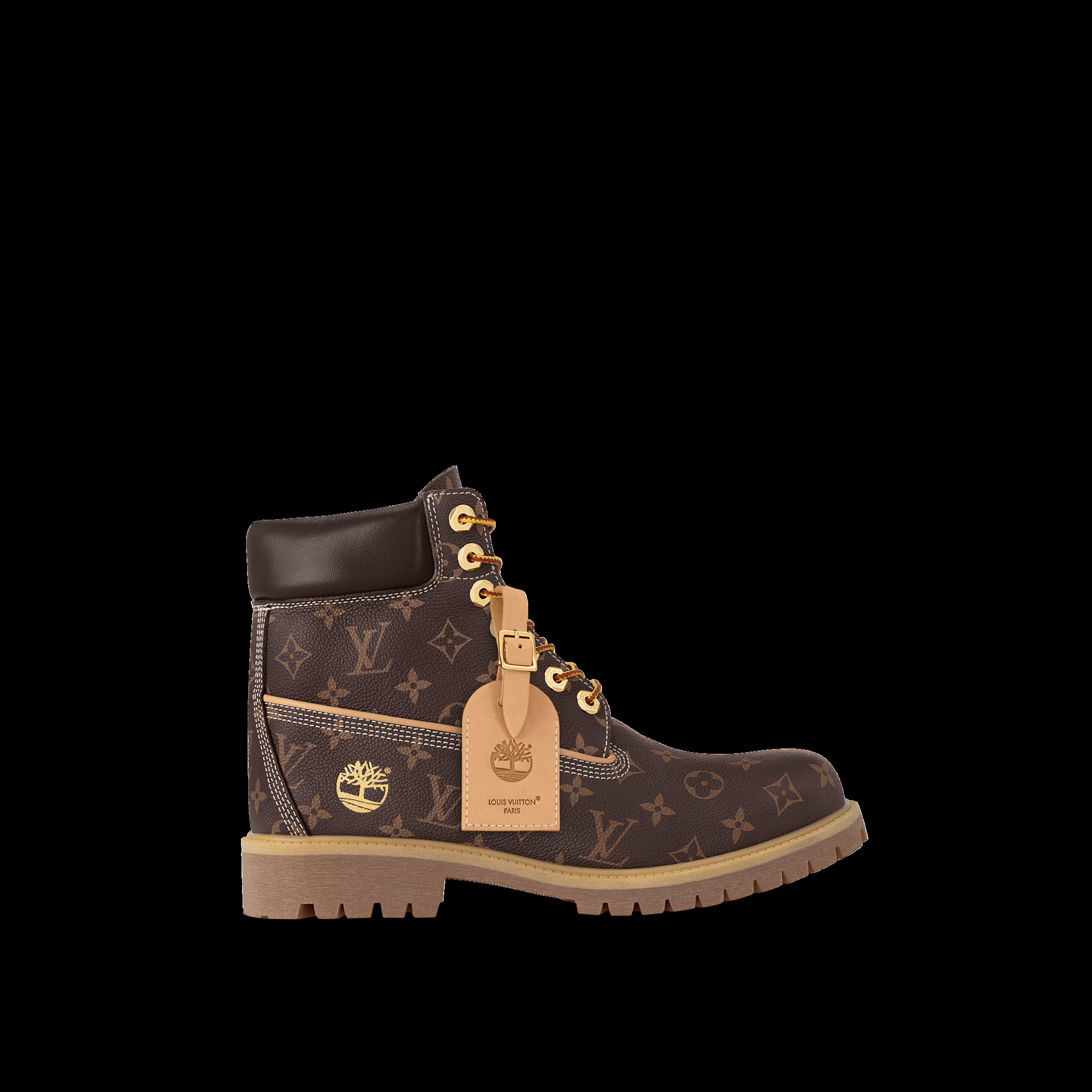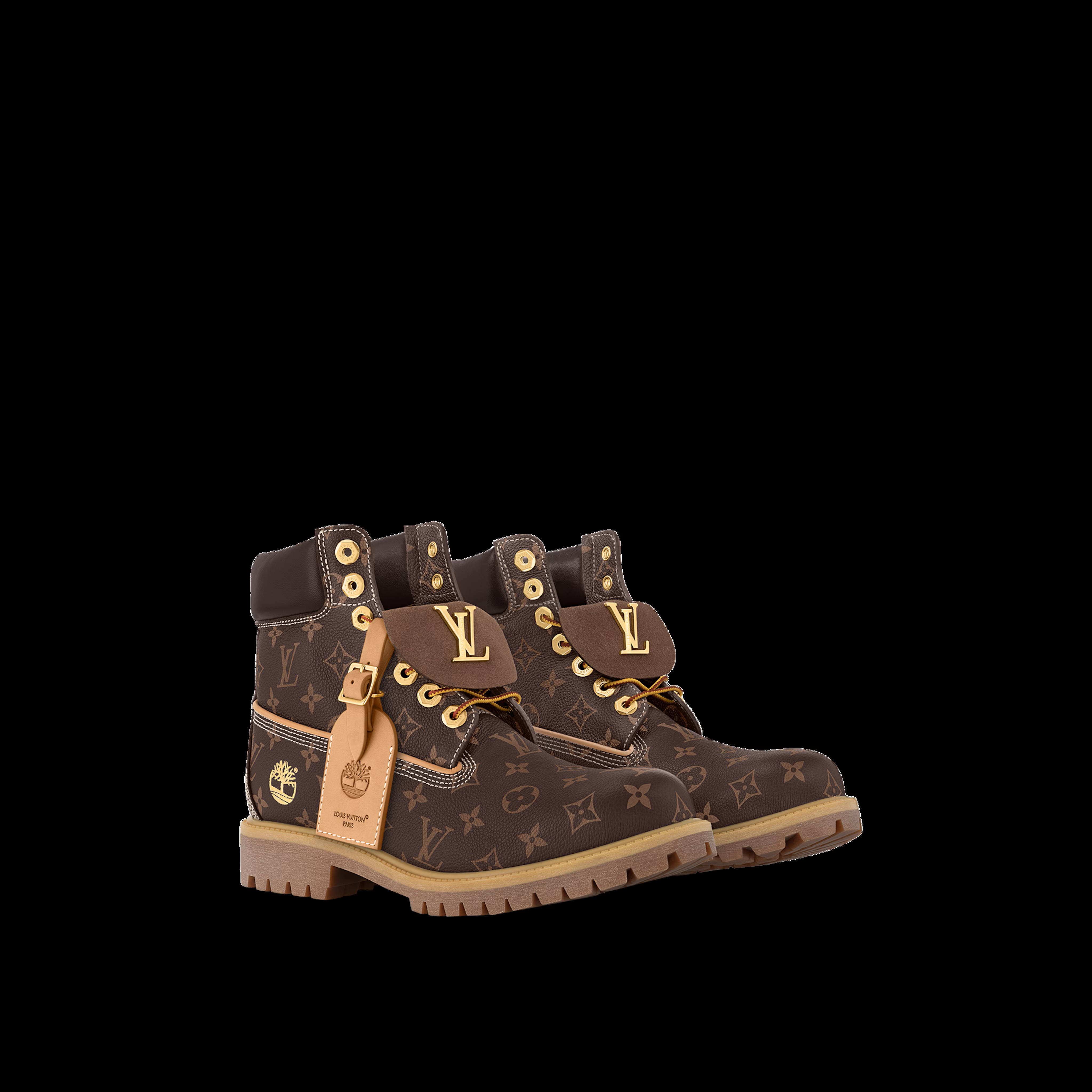 Pharrell Williams 设计的 LV x Timberland 6 英寸靴款以 LOUIS VUITTON 的奢华工艺重新诠释了这款经典型号。近期发布的这款全新的非凡之作限量发行 50 双,每双均有独立编号,由 LOUIS VUITTON 标志性的 Monogram 粒面小牛皮在意大利手工定制而成。鞋舌上的 LV 首字母缩写以及鞋带孔等细节装饰均使用 18K 黄金制造。配有采用了 Monogram 的硬质包装盒,以天然皮革饰边和 Monogram 有机玻璃打造。由于预计的发售价高达 85,000 美元,该联名鞋款在网络上引起热议。