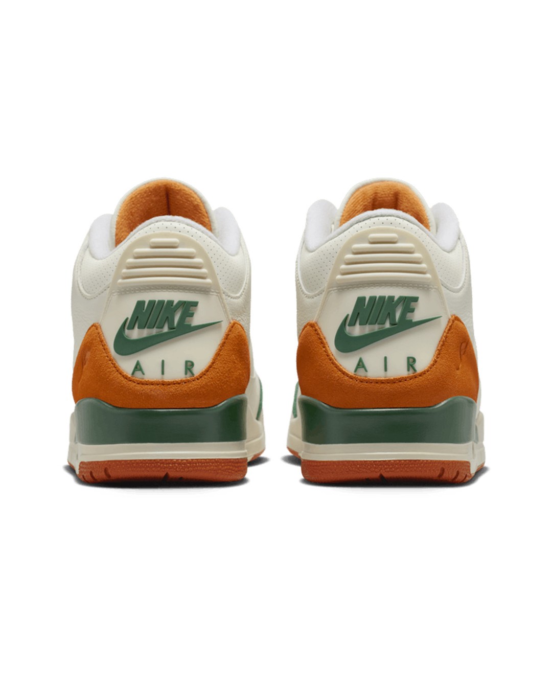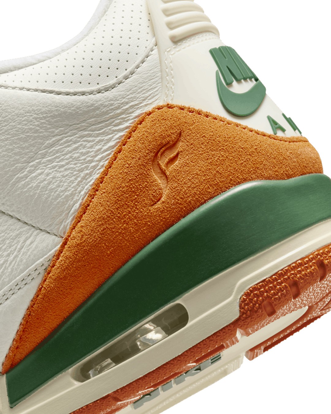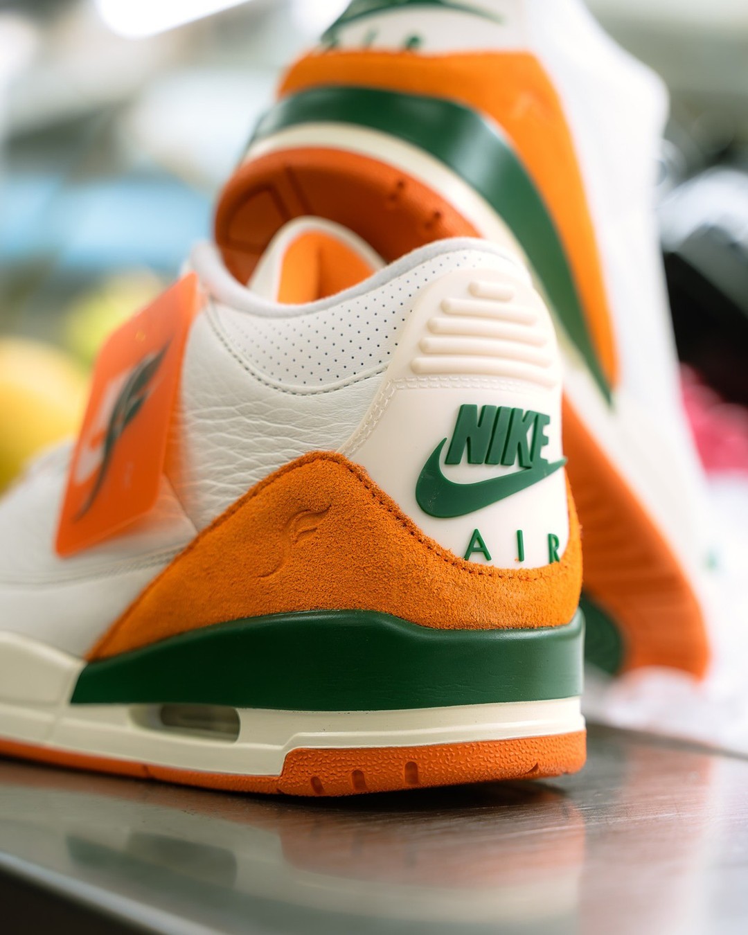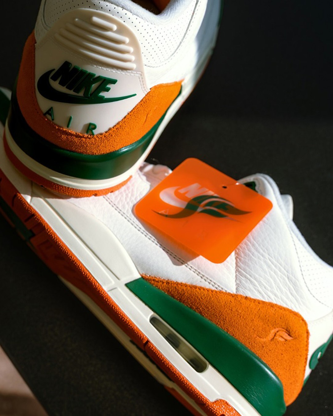 来自迈阿密的精品店 SoleFly 再度携手 Jordan Brand 推出联名款 Air Jordan III「Fruits Of Our Labor」,向佛罗里达当地文化致意。这双特别配色以迈阿密飓风队(Miami Hurricanes) 的代表色为核心,将标志性的绿色与橙色融入麂皮覆层、中底以及后跟的 Nike Air 标识之中,并在鞋身加入压印的 SoleFly 标志,与温润的米白色皮革形成鲜明对比,呈现独特的地区风格气质。目前,该鞋款的抽签活动已正式开启,定价为 225 美元,并将于 12 月 5 日 正式发售。