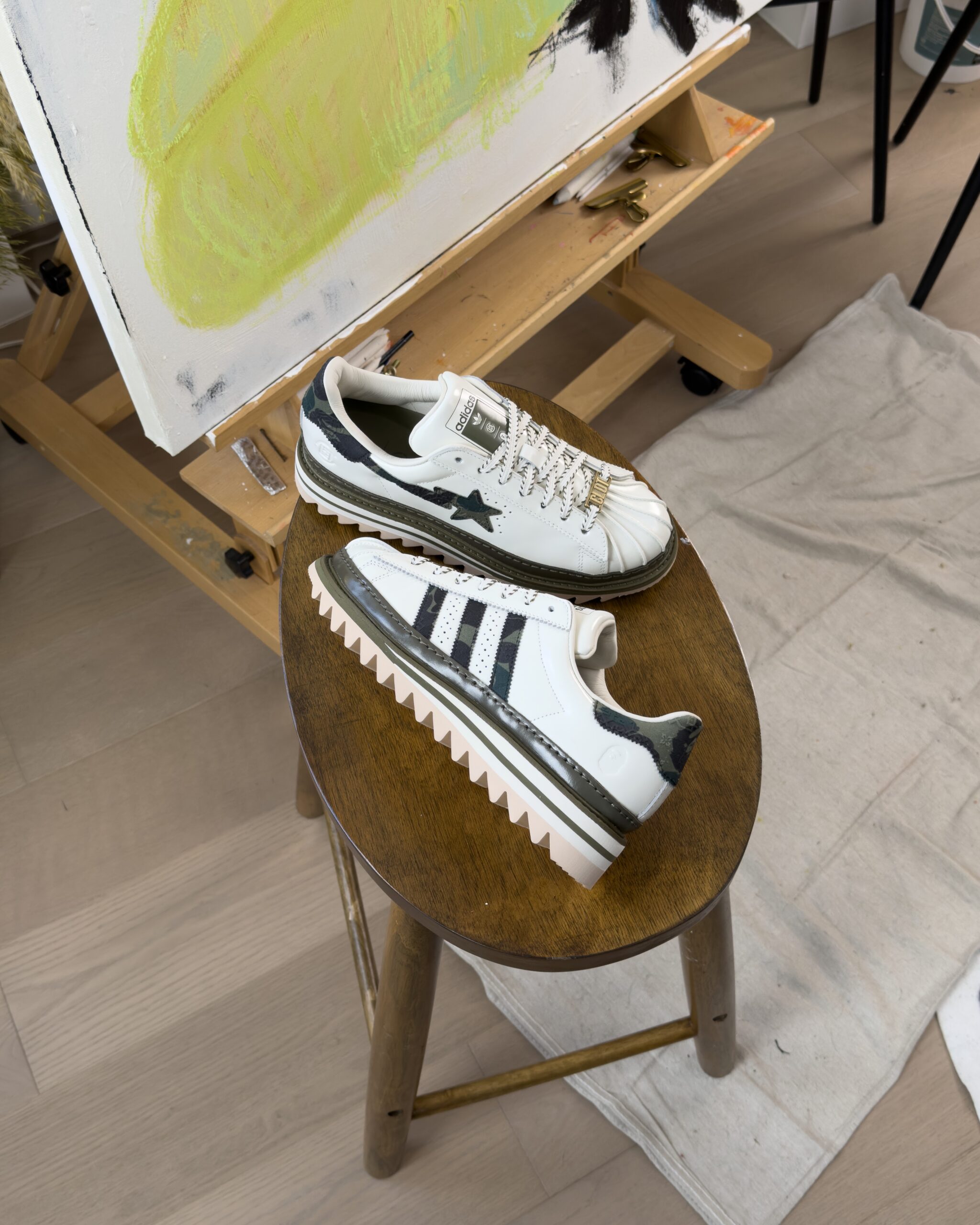 本次推出的核心是一款重新设计的 Superstar 运动鞋,由陈冠希将经典鞋型转化为高端前卫的设计。这双三方联名 Superstar 采用米白色高品质皮革鞋面打造,辅以立体压纹细节,橄榄色工装风格的点缀进一步增添实用主义气质。BAPE® 的 1st Camo 迷彩与 CLOT 的丝绸纹理相融合,覆盖于 adidas 三条纹、BAPE® Sta 标识与后跟之上,形成极具辨识度的视觉焦点。同时,沙色波纹外底配合锯齿状结构,使 Superstar 的轮廓焕然一新,突破传统印象。