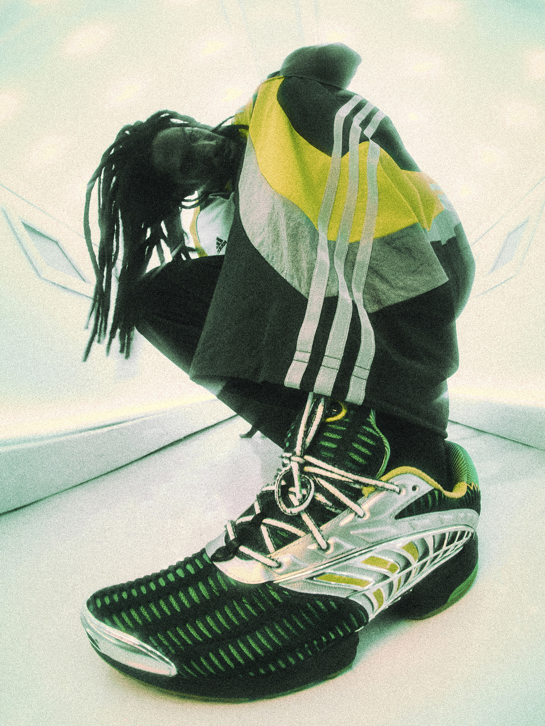 鞋款方面聚焦于两双经典轮廓:Climacool 2 与 Taekwondo Mei。Climacool 2 诞生于 2003 年,作为初代 Climacool 的升级版,以未来感透气系统更新了鞋型。此次 Brain Dead 为其注入独特美学,采用金属质感透气孔、反光绿色网眼与黄色点缀。Taekwondo Mei Brain Dead 则采用黑色鞋面搭配白色条纹与米白色外底,简约复古。