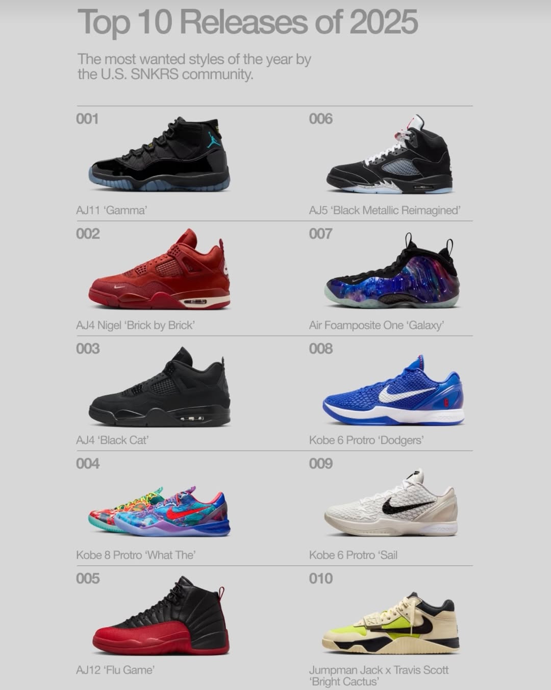 2026 年即将开启,Nike 官方近日揭晓了 2025 SNKRS 年度最受欢迎鞋款 Top 10 榜单。