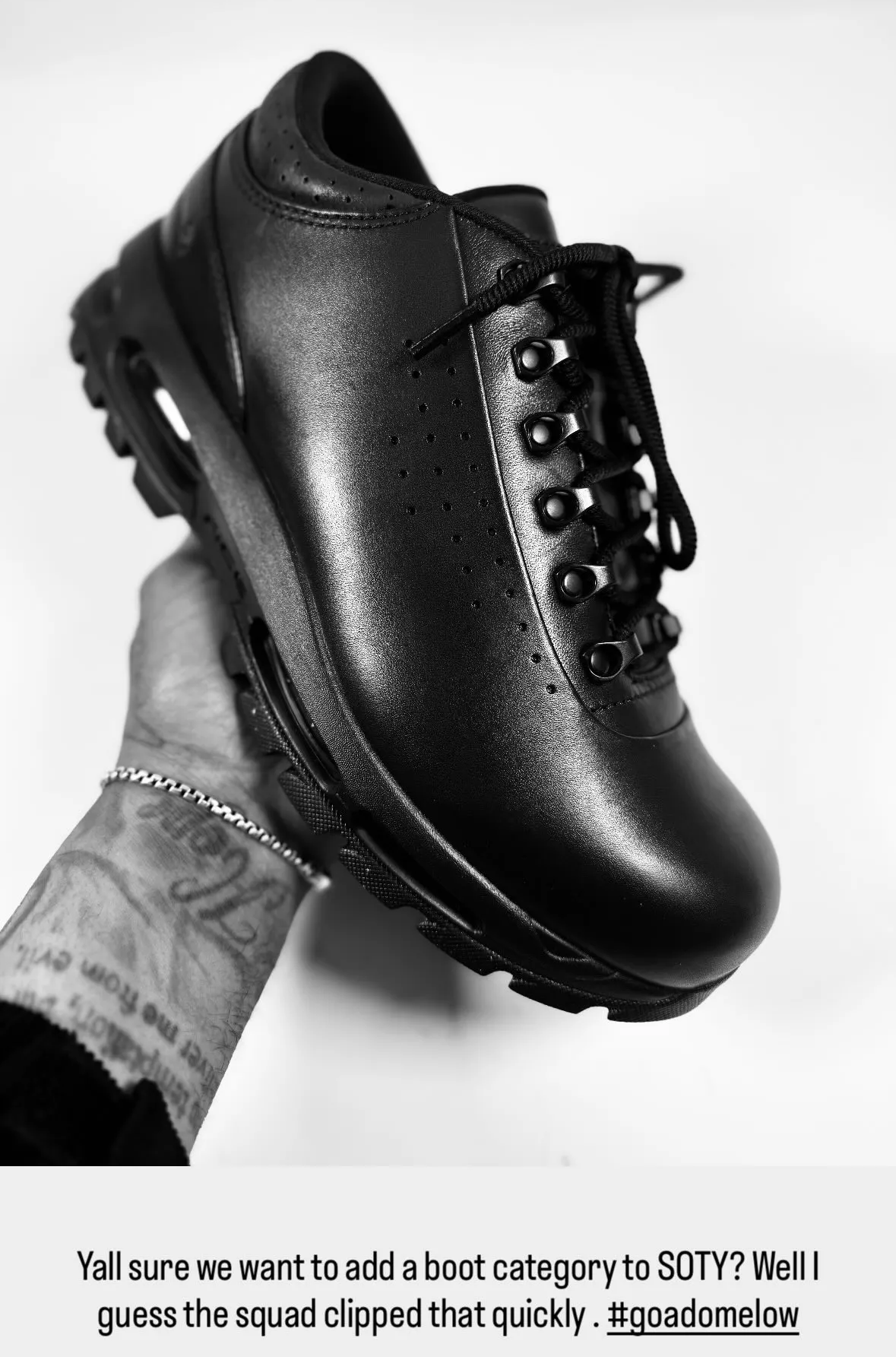 由众多 icon 接连上脚的 Air Max Goadome,凭借其强烈的街头归属感和耐人寻味的文化底蕴,逐渐成为一双「小众鞋王」。近日 Nike 资深设计师 Frank Cooke 在自己的社媒平台上发布了 Nike Air Max Goadome Low 的图片,并配文写道:「你们要在年度最佳球鞋评选中增加一个靴子奖项吗?」展现出他对这双低帮 Air Max Goadome 的喜爱和信心。