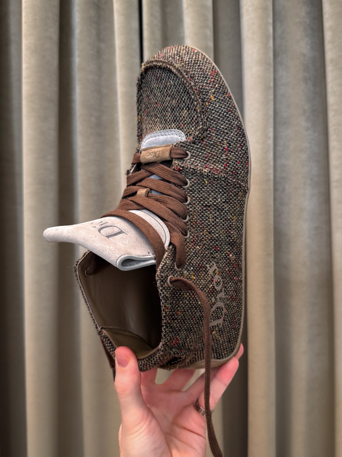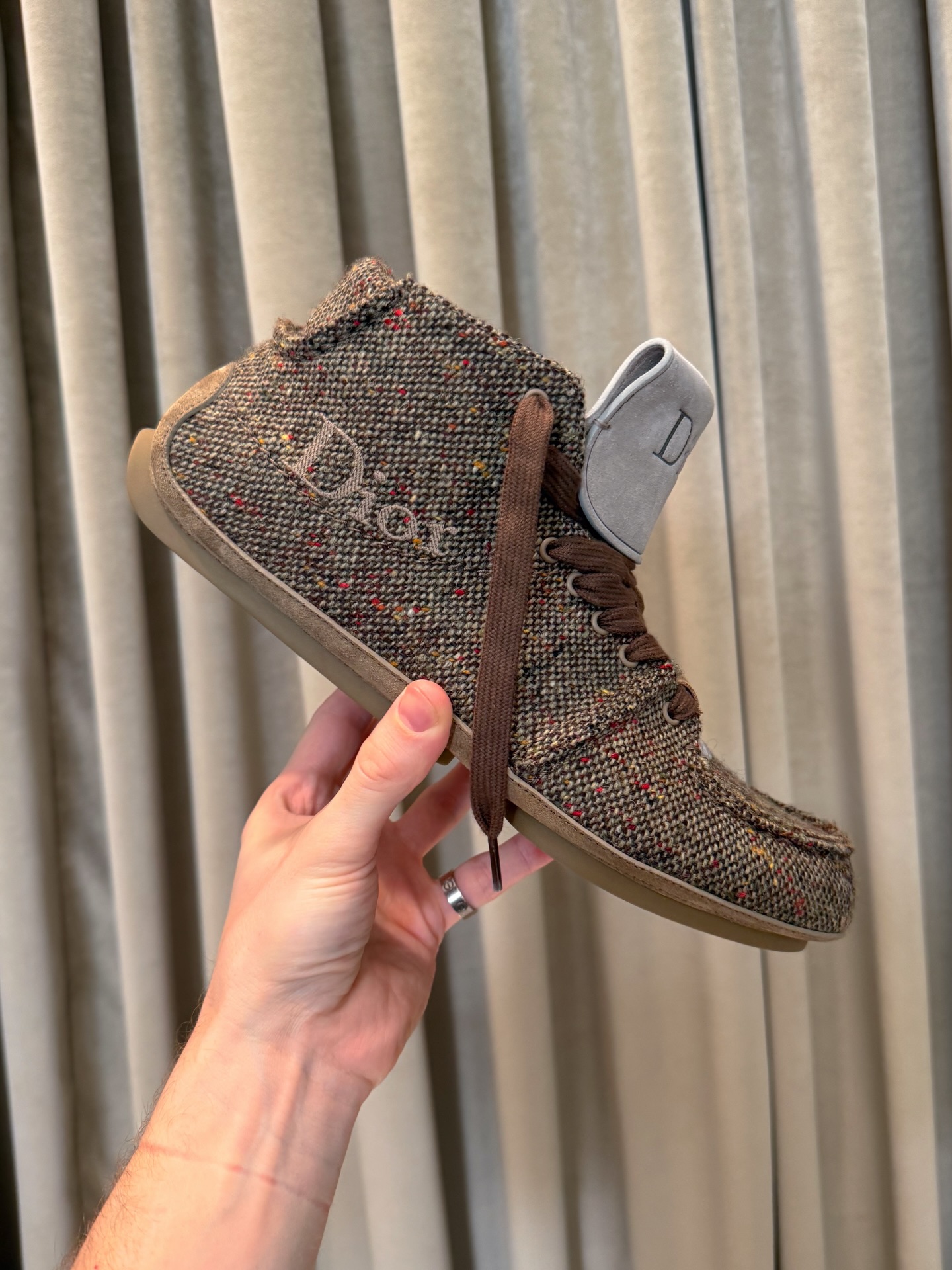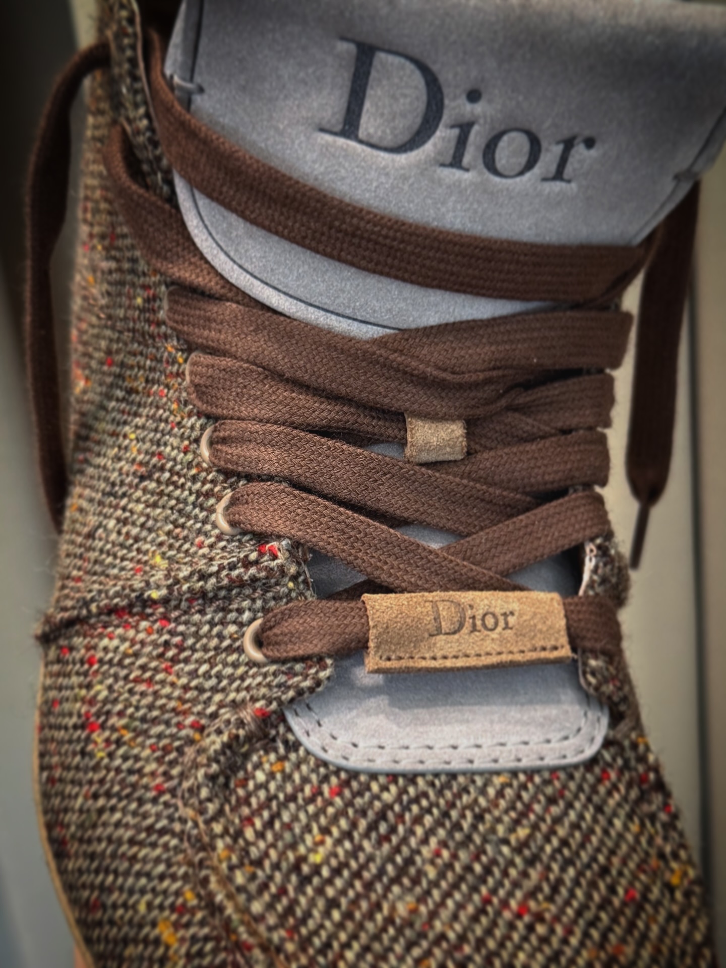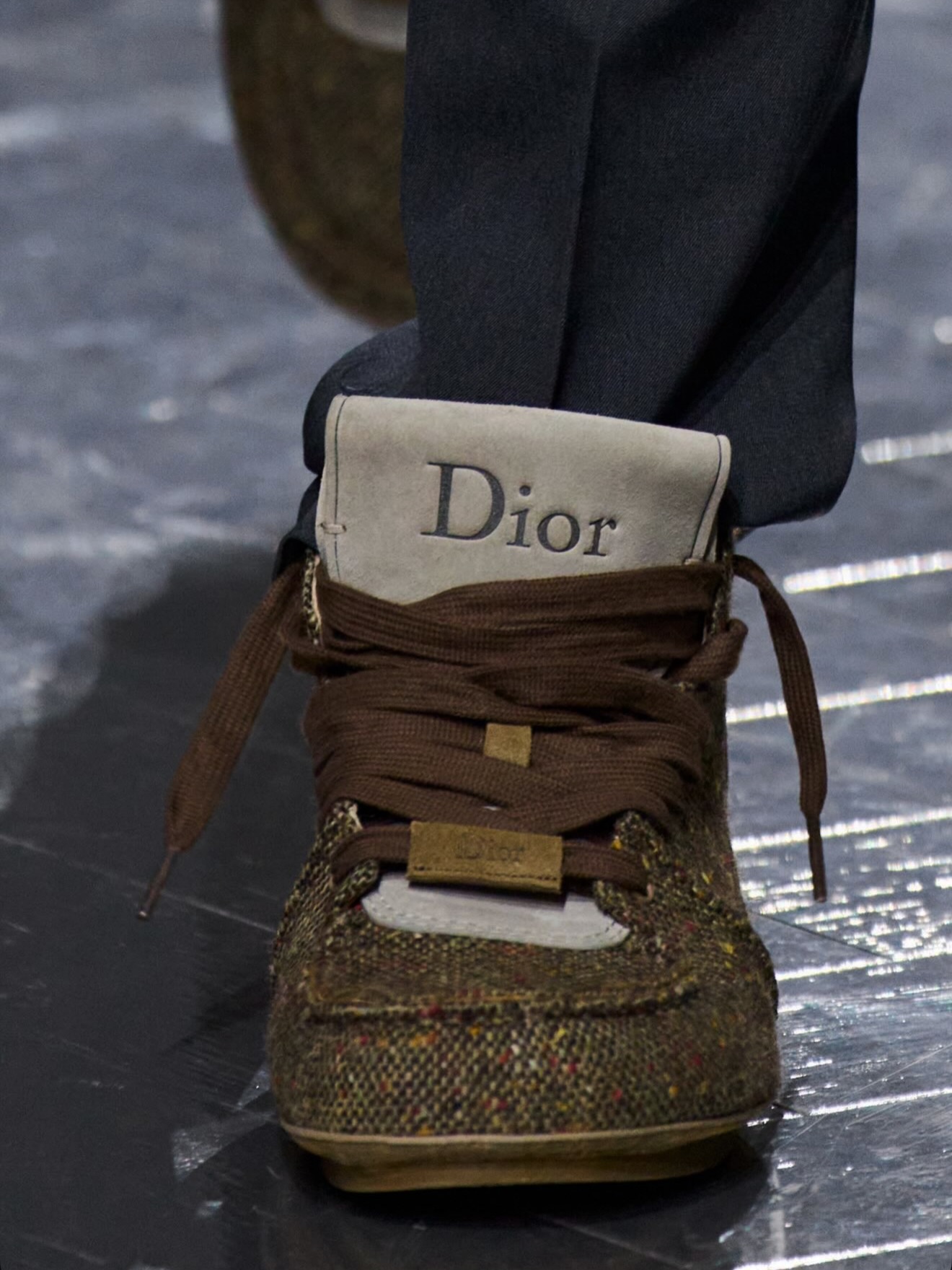 DIOR Roadie 是一款绑带靴式球鞋,夸张的鞋身比例搭配一体成形的圆筒状鞋底,勾勒出前卫而坚实的轮廓。首发版本以高级麂皮小牛皮与羊皮内里呈现,而此次曝光的后续款式则改用仿粗花呢质感鞋面,进一步强化材质表现力。这一变化亦呼应了 DIOR 先前提出「粗花呢将成为 2026 年关键趋势」的设计判断。