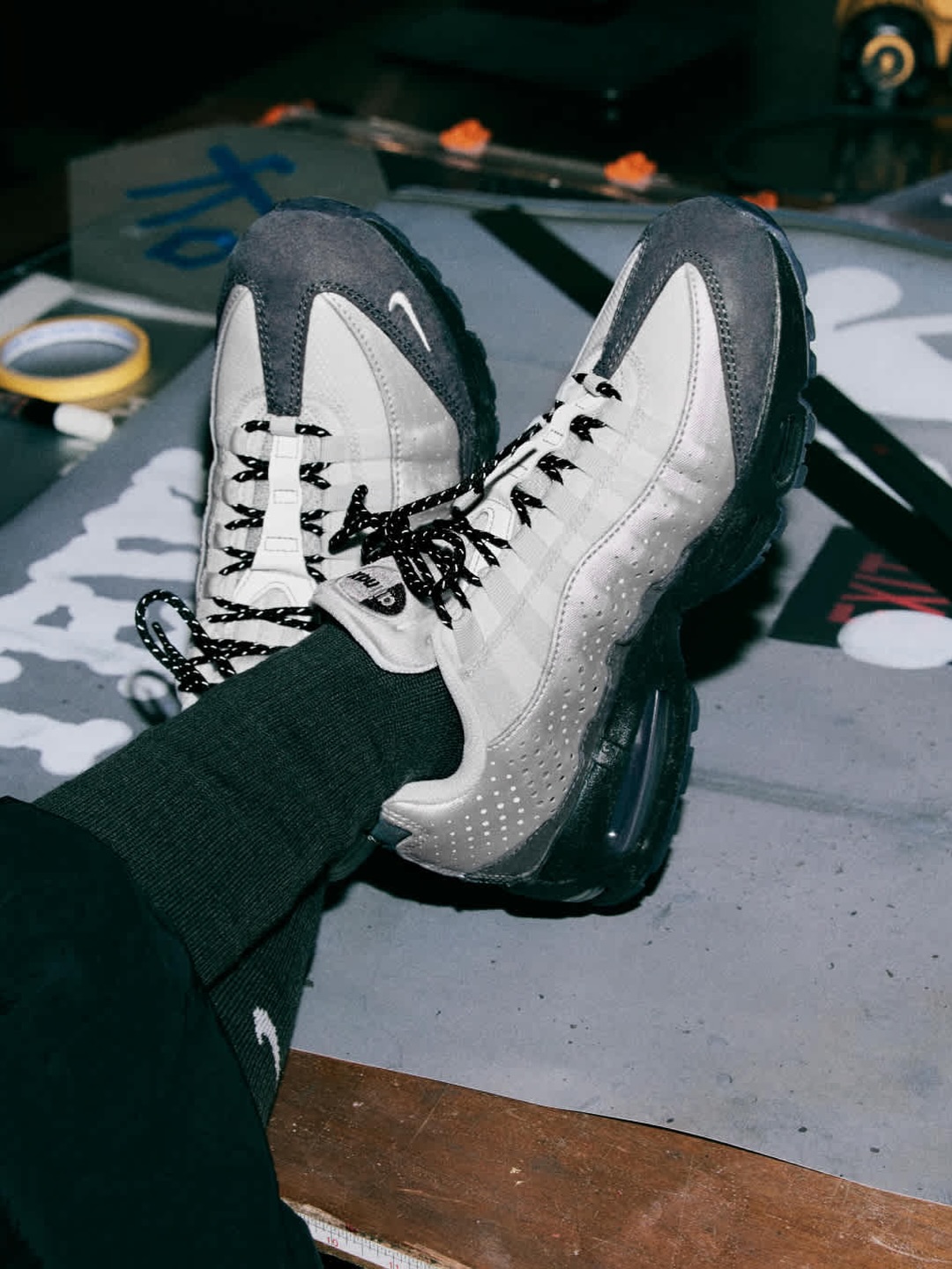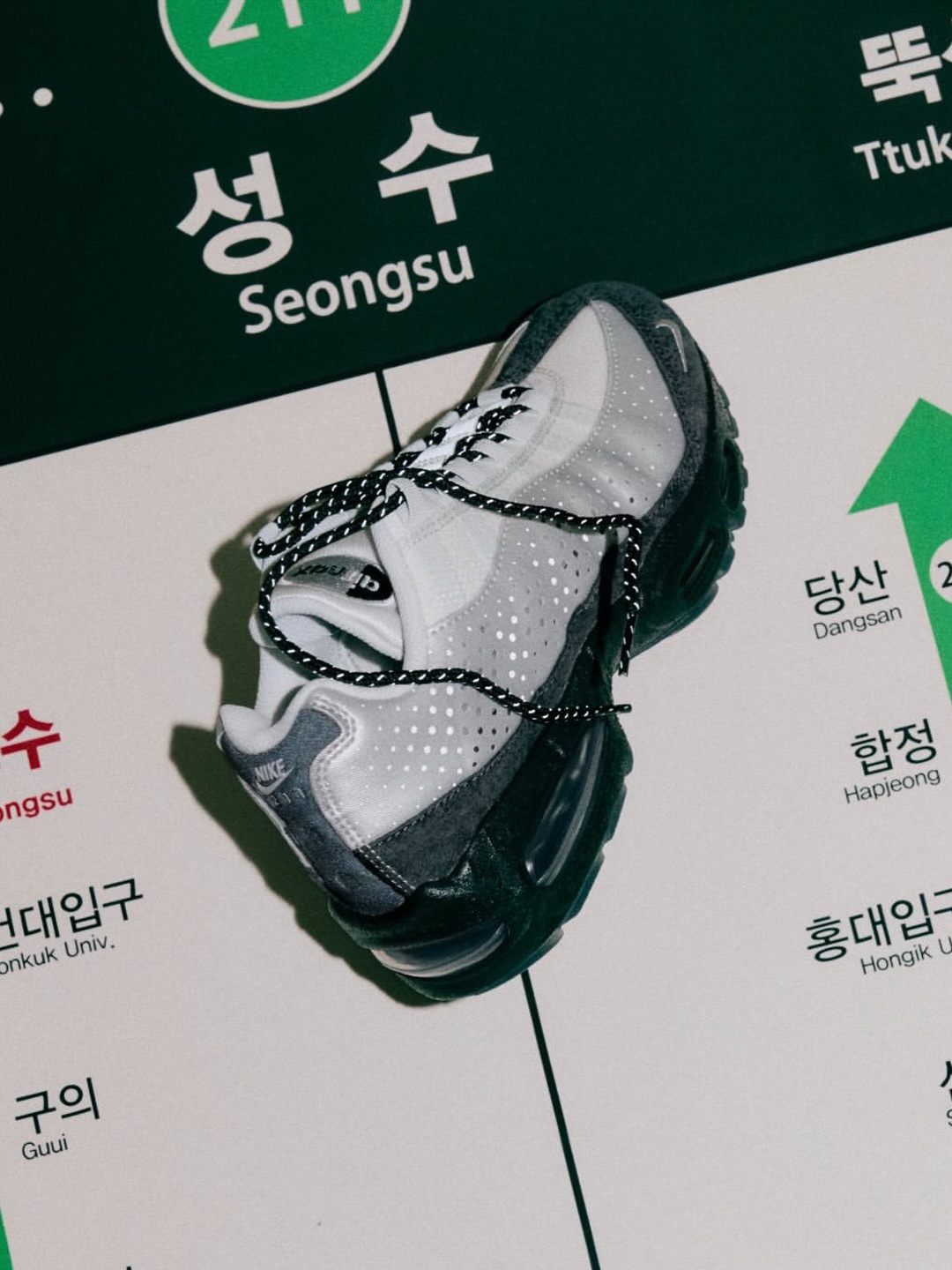 设计层面,这双 AM95 从圣水地区常见的工业建筑与材料中汲取灵感,呈现出粗粝而真实的质感;在尊重传统的同时,也展现出不断向前的当代韩国设计精神。细节上,鞋身融入了象征 首尔地铁圣水站编号「211」 的印花元素,进一步强化了地域属性与城市记忆。