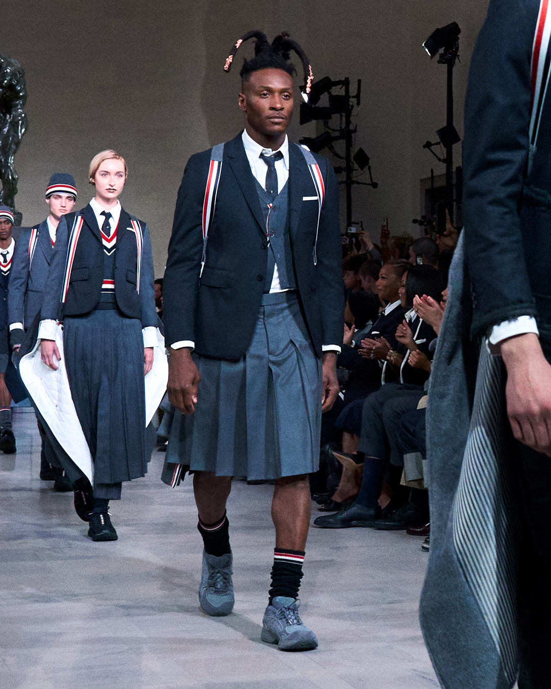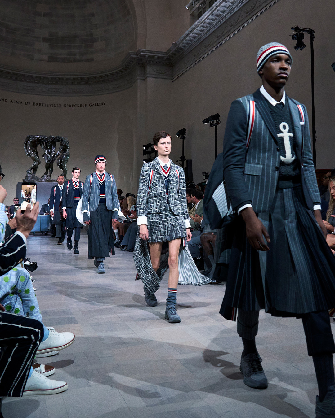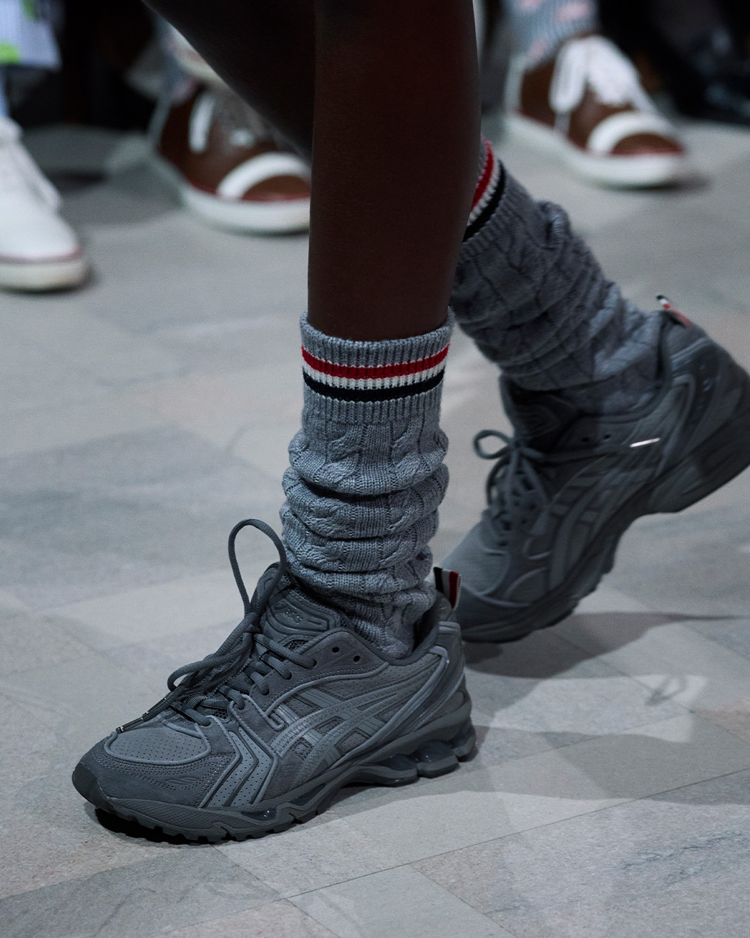 日前 Thom Browne 在旧金山地标建筑荣誉军团博物馆发布 2026 秋季系列,以一场极具戏剧张力的大秀,把古典艺术、美式橄榄球文化与高级时装巧妙地融合在同一叙事之中。秀场上最受瞩目的亮点之一,是模特脚下首次曝光的 Thom Browne x ASICS GEL-KAYANO 14 联名鞋款。这双人气复古跑鞋被注入品牌标志性的设计语言,以克制而精准的灰、黑、白配色重新演绎,呈现出兼具绅士气质与机能属性的全新面貌。据悉,该鞋款已确定将于 3 月 2 日 正式发售。