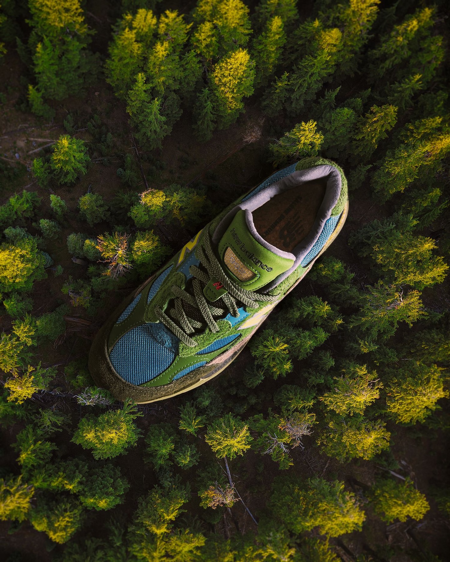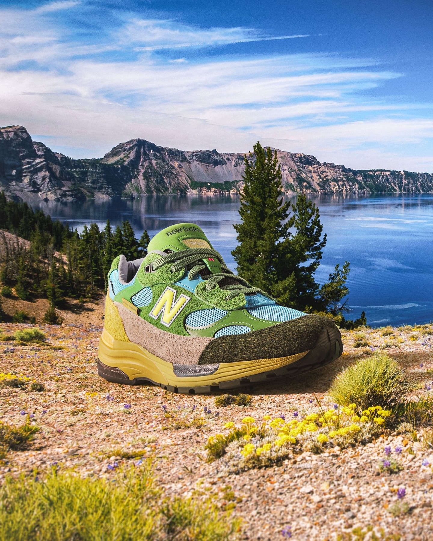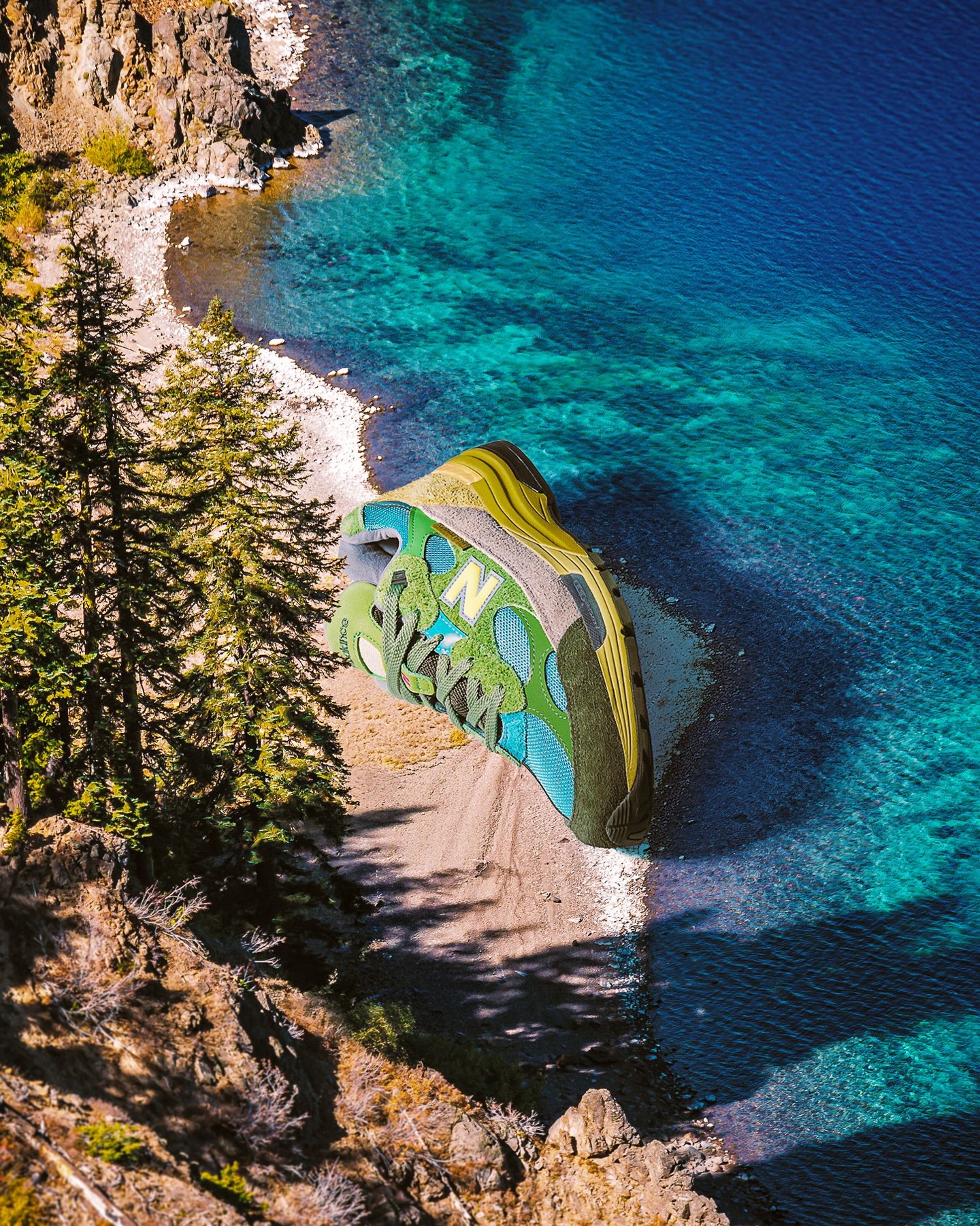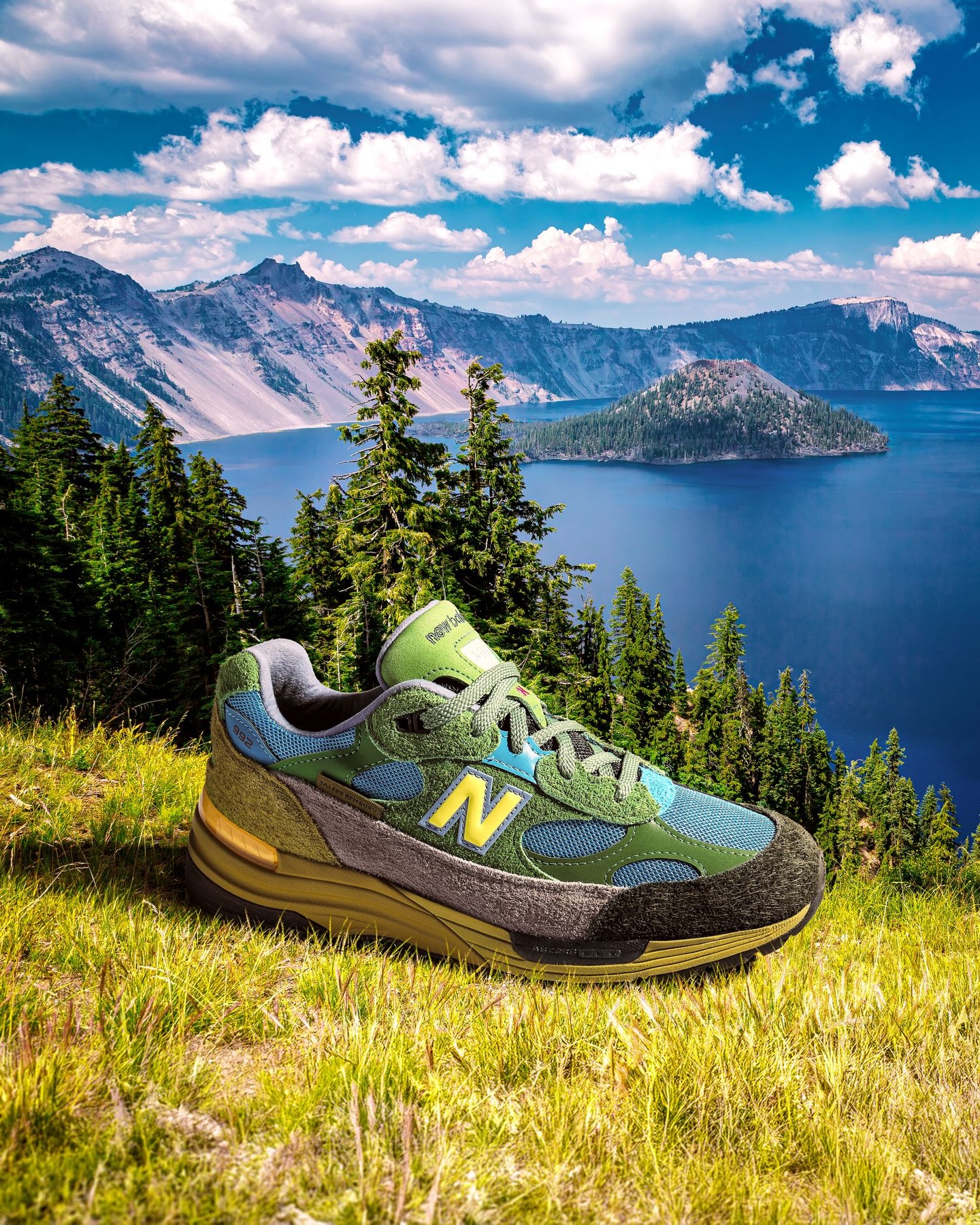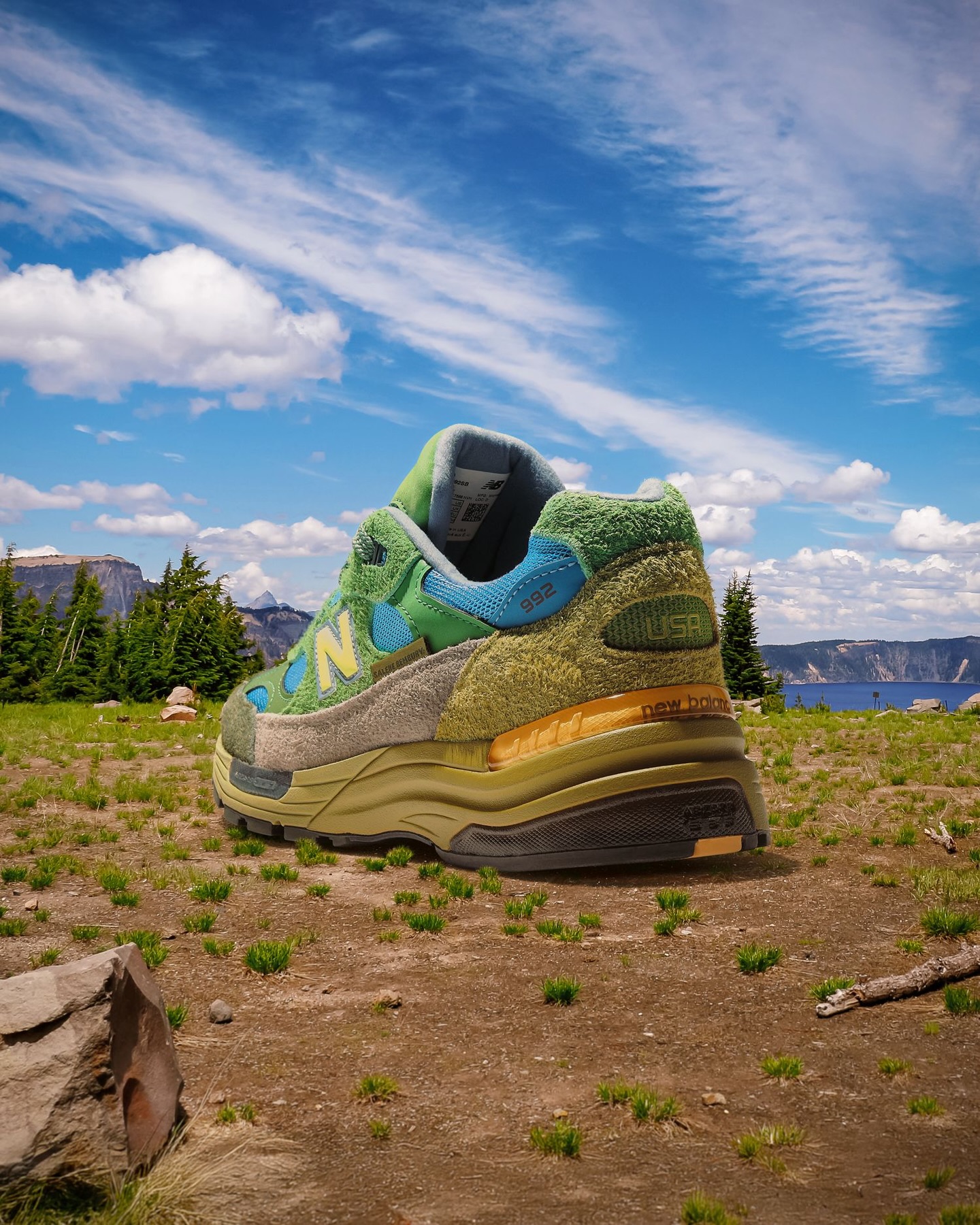 本次设计灵感源自美国太平洋西北部的冰川湖泊与周围常绿自然景观。清澈而深邃的蓝色水域、森林中的绿色与岩石般的灰色被转化为鞋身主调,并通过毛绒麂皮覆盖层与合成材质内层的对比运用,呈现多样地貌的质感变化。Salehe Bembury 标志性的自然观察视角与自由配色语言,使这双 992 在保留性能基因的同时,展现出鲜明的艺术气质。