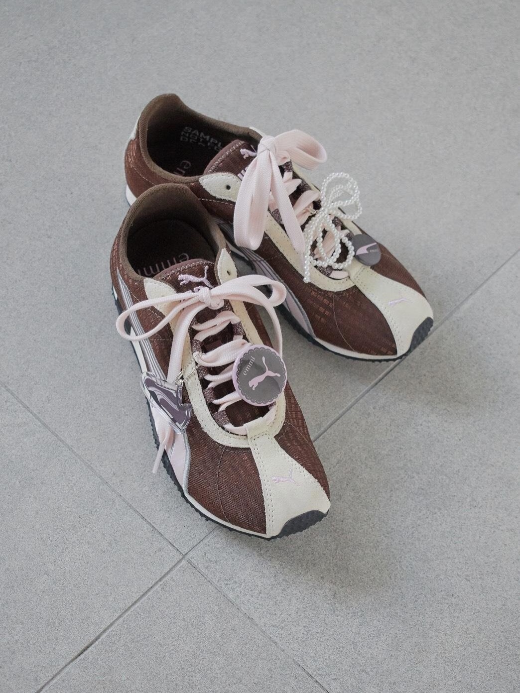 来自日本的 emmi 携手 PUMA 带来全新联名鞋款 H-Street,并将于 5 月 6 日正式发售。该鞋以千禧年代跑鞋 PUMA Harambee 为灵感原型,在经典轮廓基础上融入 emmi 一贯强调的健康生活方式与柔和女性气质。设计上以棕色与粉色为主调,搭配带有细腻光泽的网布与缎面质感材质,整体呈现出更轻盈且富有层次的视觉效果。同时,鞋带孔位置加入亮丝细节,为整体造型增添精致点缀。