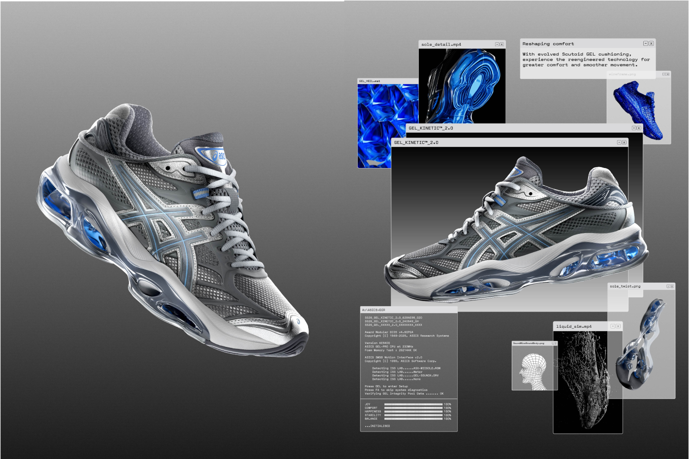 GEL-KINETIC 2.0 的整个研发过程,充分展现了 ASICS 亚瑟士人体工学研究所的强大科研实力,而这也在 ASICS 亚瑟士 ode of Comfort 企划中得到充分演绎。通过一种兼具复古风格与未来主义的美学视角,品牌主题影片再现 ASICS 亚瑟士人体工学研究所的场景,诠释出 ASICS 亚瑟士对运动科学和穿着体验的坚持。在实际研发过程中,研发人员通过对步态数据的精密解析,优化鞋款结构及其性能表现。