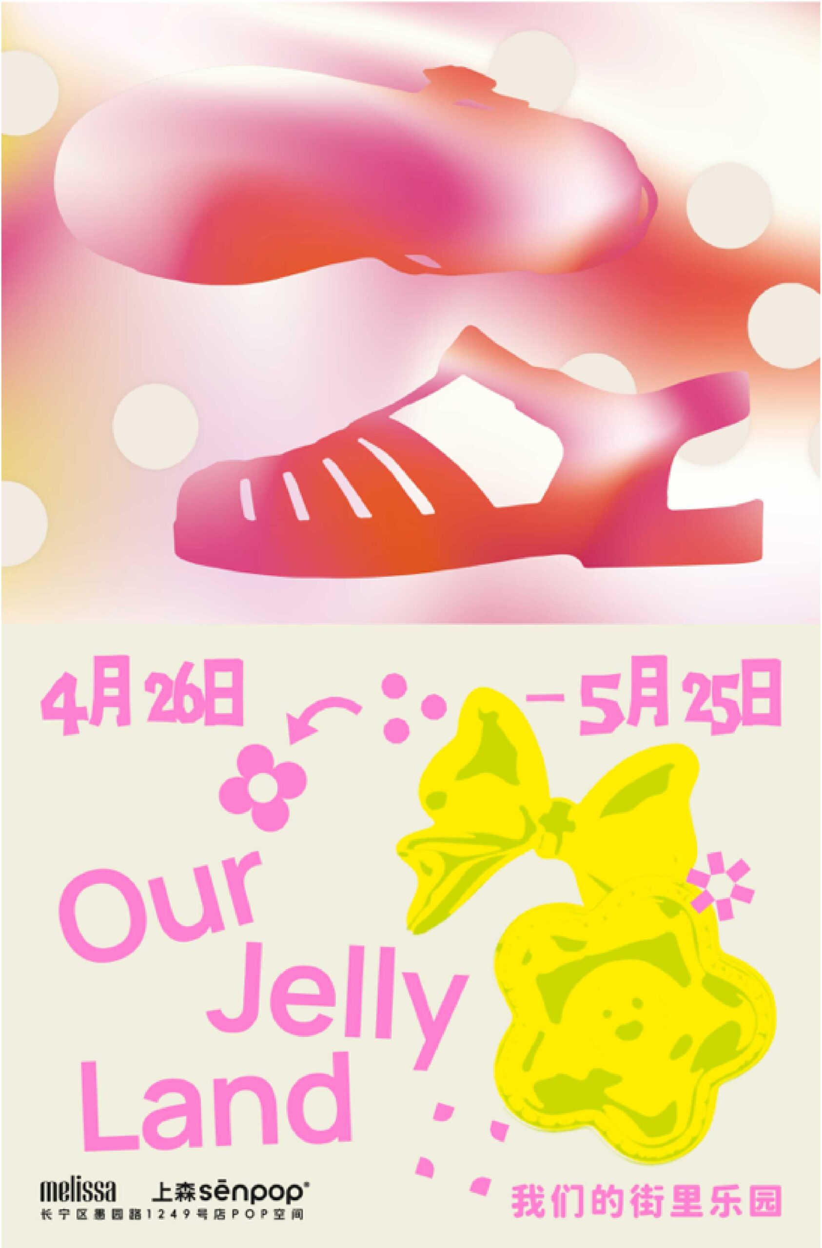 为了将「未来在 Jelly」的主题生动呈现,Melissa 携手上森s ēnpop,于愚园路打造联名展览「Jelly Land 街里乐园」,开启一场沉浸式感官漫游,穿梭于色彩与香味、材质与可持续、自我想象与生活社群之间。Melissa 经典罗马鞋与上森 sēnpop 不配对波点袜于此奇妙相遇,波点和花朵元素点缀其间,日常的柔软遇上色彩的多巴胺,共同触发一种灵活、轻盈、乐观的生活想象,鼓励人们接纳差异与自由的表达,以全新的视角踏足当下。