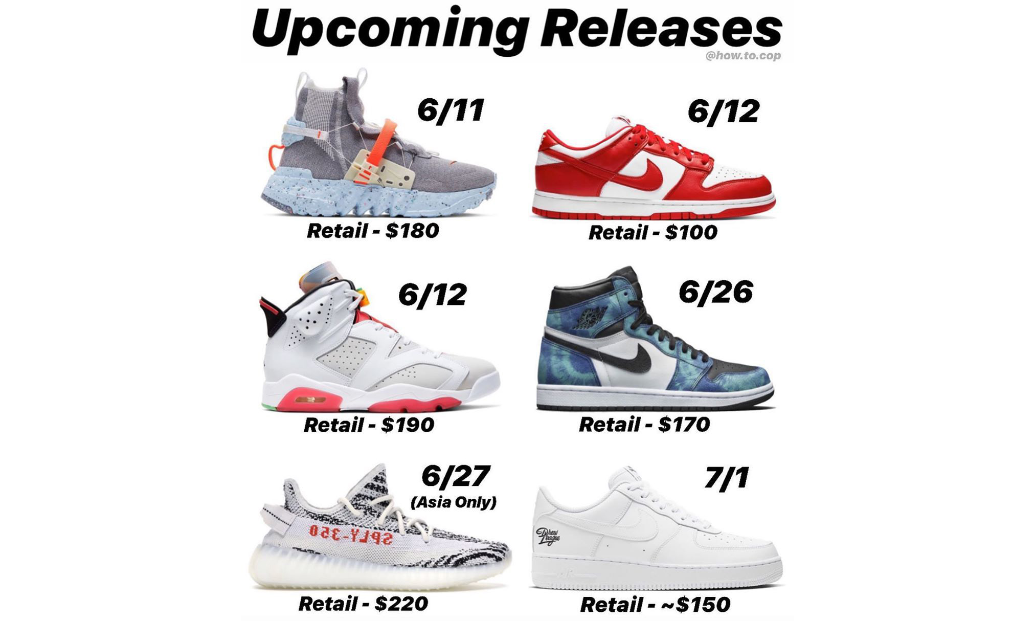 在接下来的一个月中,我们将会迎来 6 双重大鞋款的发售,其中包括有 6 月 11 日发售的 Space Hippie 系列、6 月 12 日发售的白红色 Nike Dunk Low 和 Air Jordan VI、6 月 26 日发售的扎染 Air Jordan I、6 月 27 日发售的亚洲限定 Yeezy Boost 350 V2「白斑马」以及 7 月 1 日发售的 Air Force 1「Drew League」。另外还有许多球鞋暂时没有确定具体发售日期,可能会随时突击发售,所以列表中仅为确定的鞋款。有哪双是你打算入手的?