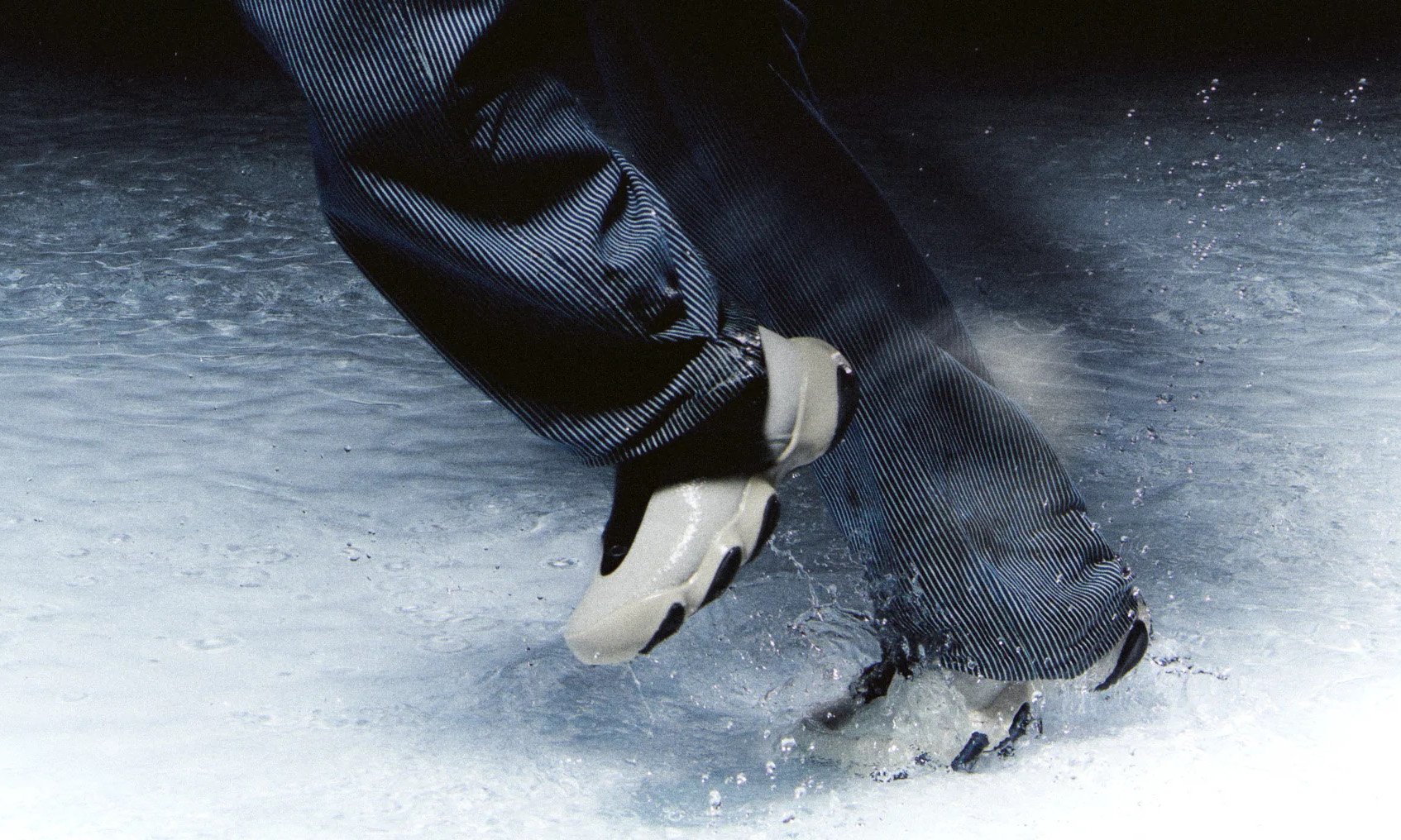 Flesh 将运动鞋的性能与拖鞋的舒适结合在一起,把脚包裹在绒面革、氯丁橡胶制成的鞋面之中,开孔与缝合则利用数字控制技术(CNC)进行加工,再配合上 laceless 式的设计,看起来思路与后来流行的袜套式鞋款是有些相似之处。此外,有着夸张造型的鞋底则是由 3D 数字渲染制作而成,造型上看起来非常科幻。