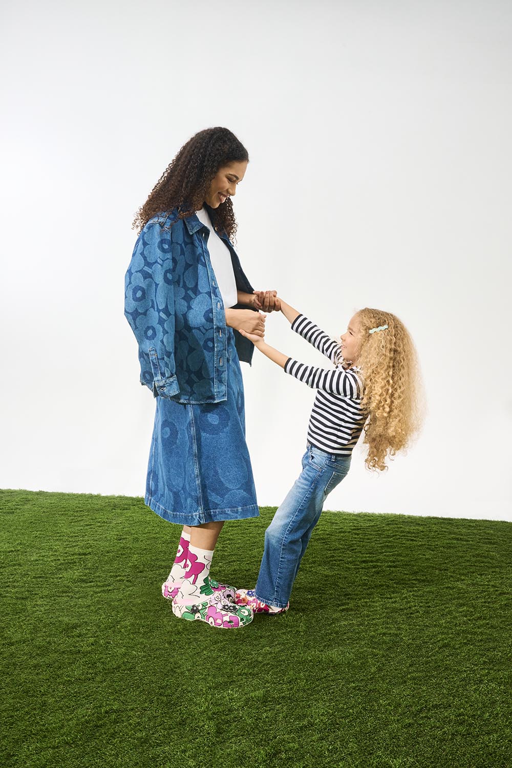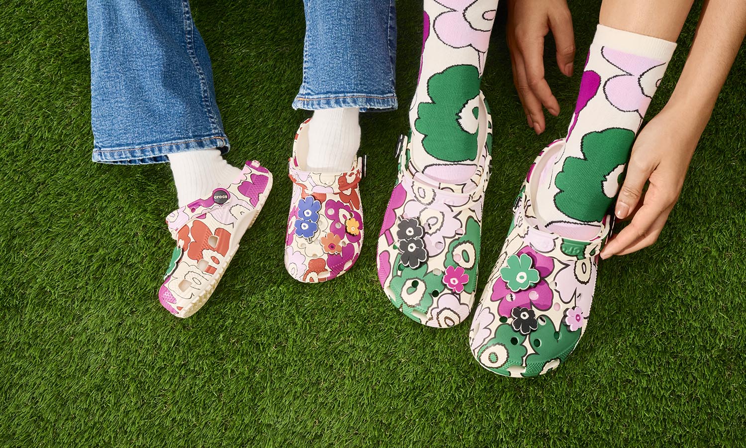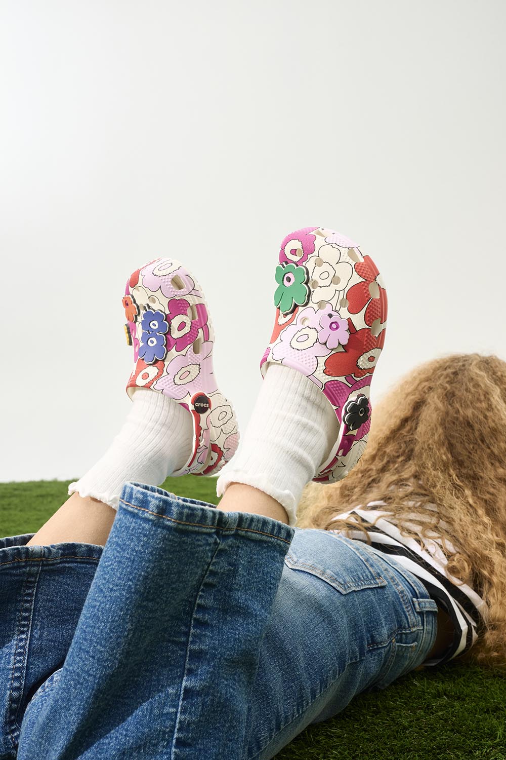 Crocs 首次携手芬兰品牌 Marimekko 推出以乐观与玩趣为主题的合作系列鞋款。该系列灵感源自两大品牌共有的乐观精神与玩趣基因,将 Marimekko 的印花艺术与 Crocs 标志性休闲鞋款相结合,打造出极具视觉张力的春日鞋履与配饰。