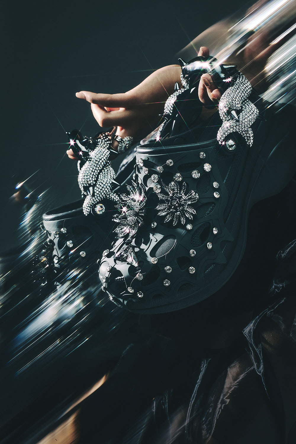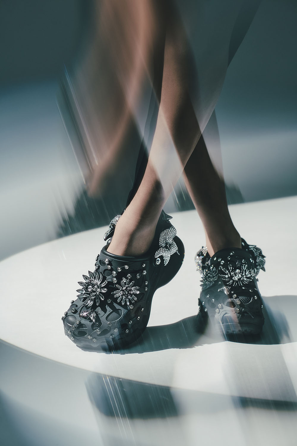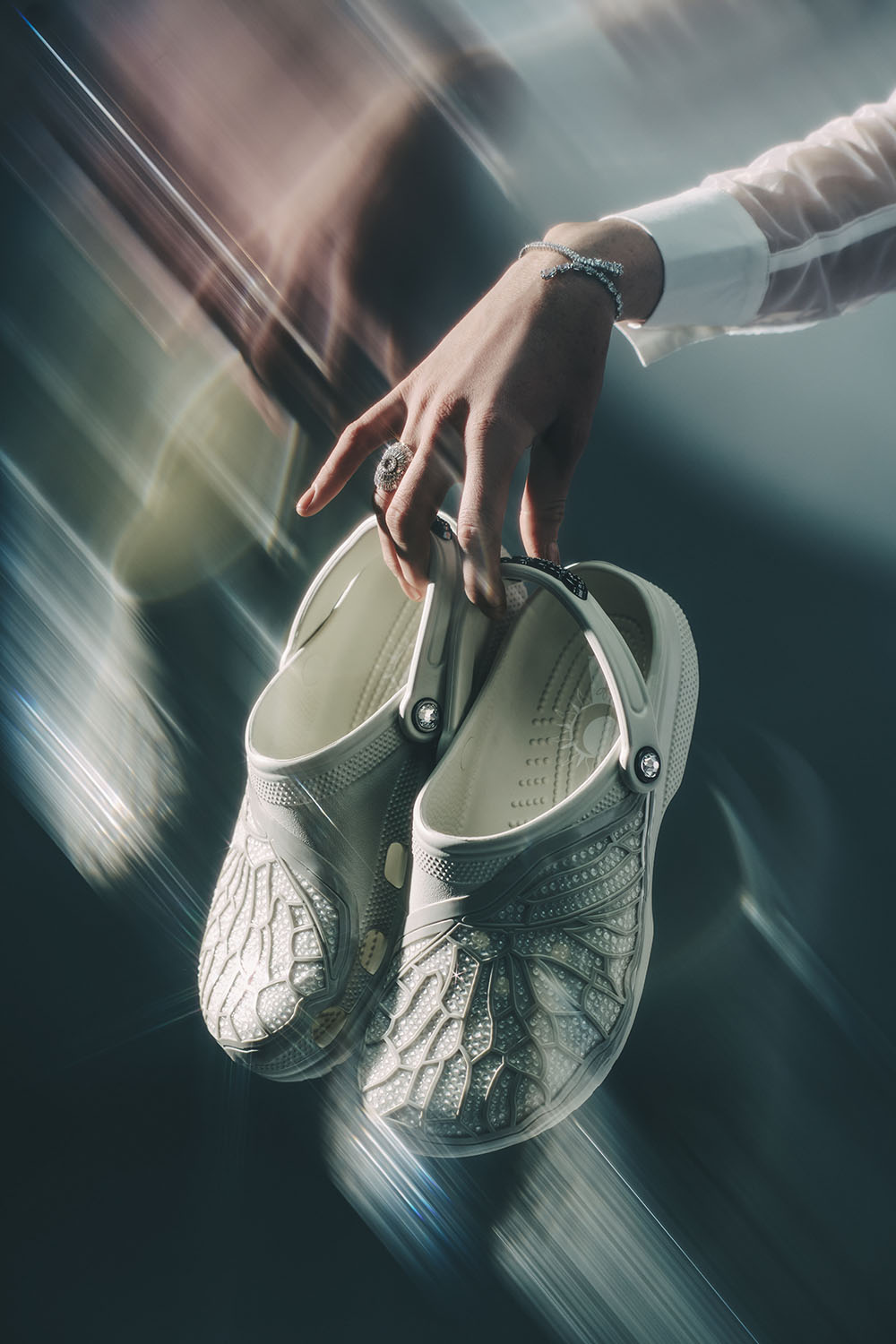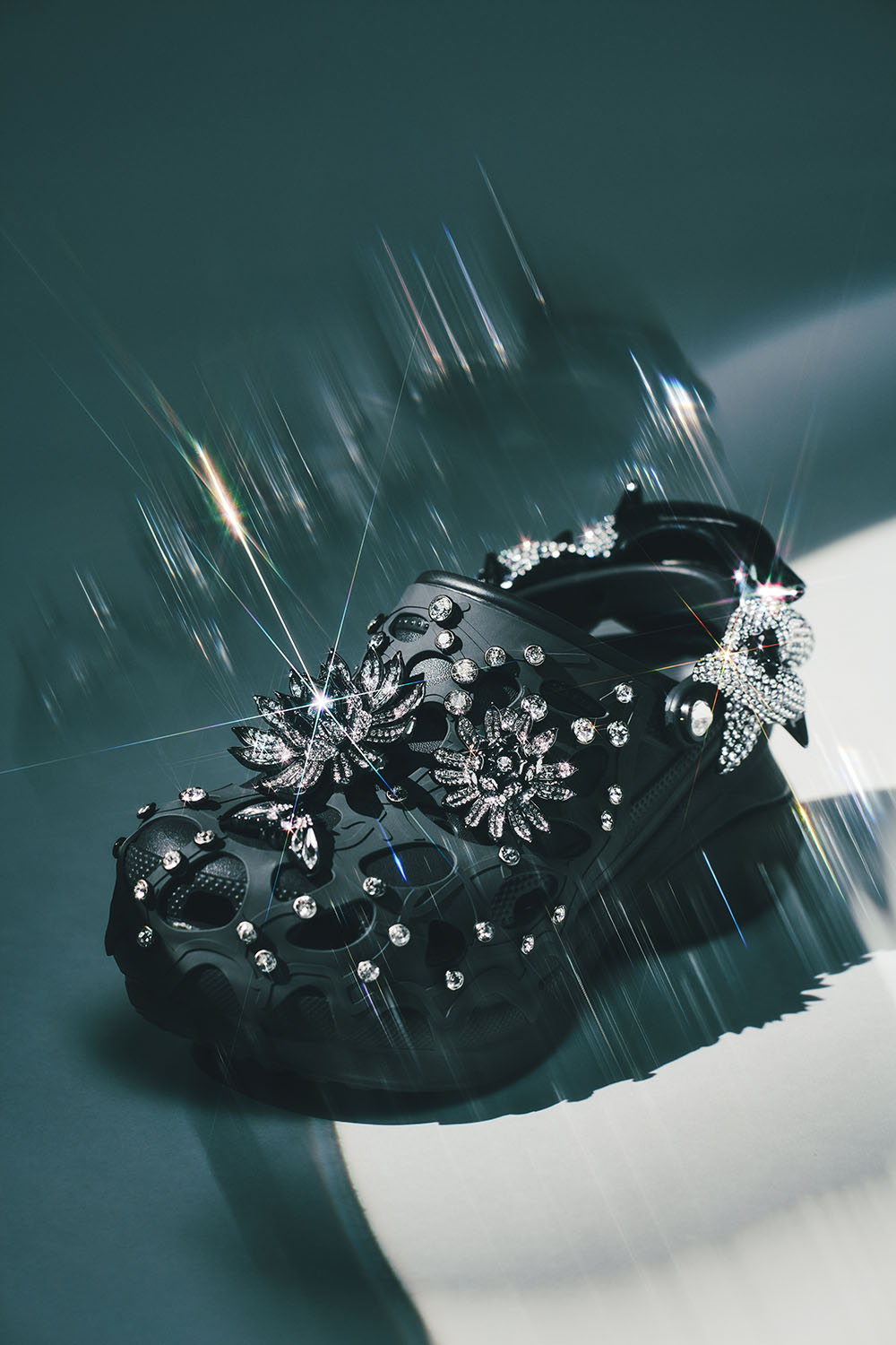 Crocs 携手奥地利百年水晶品牌 Swarovski® 推出全新高定系列。该系列将品牌标志性鞋款通过水晶光影变化与结构重塑,设计灵感源自自然之美。