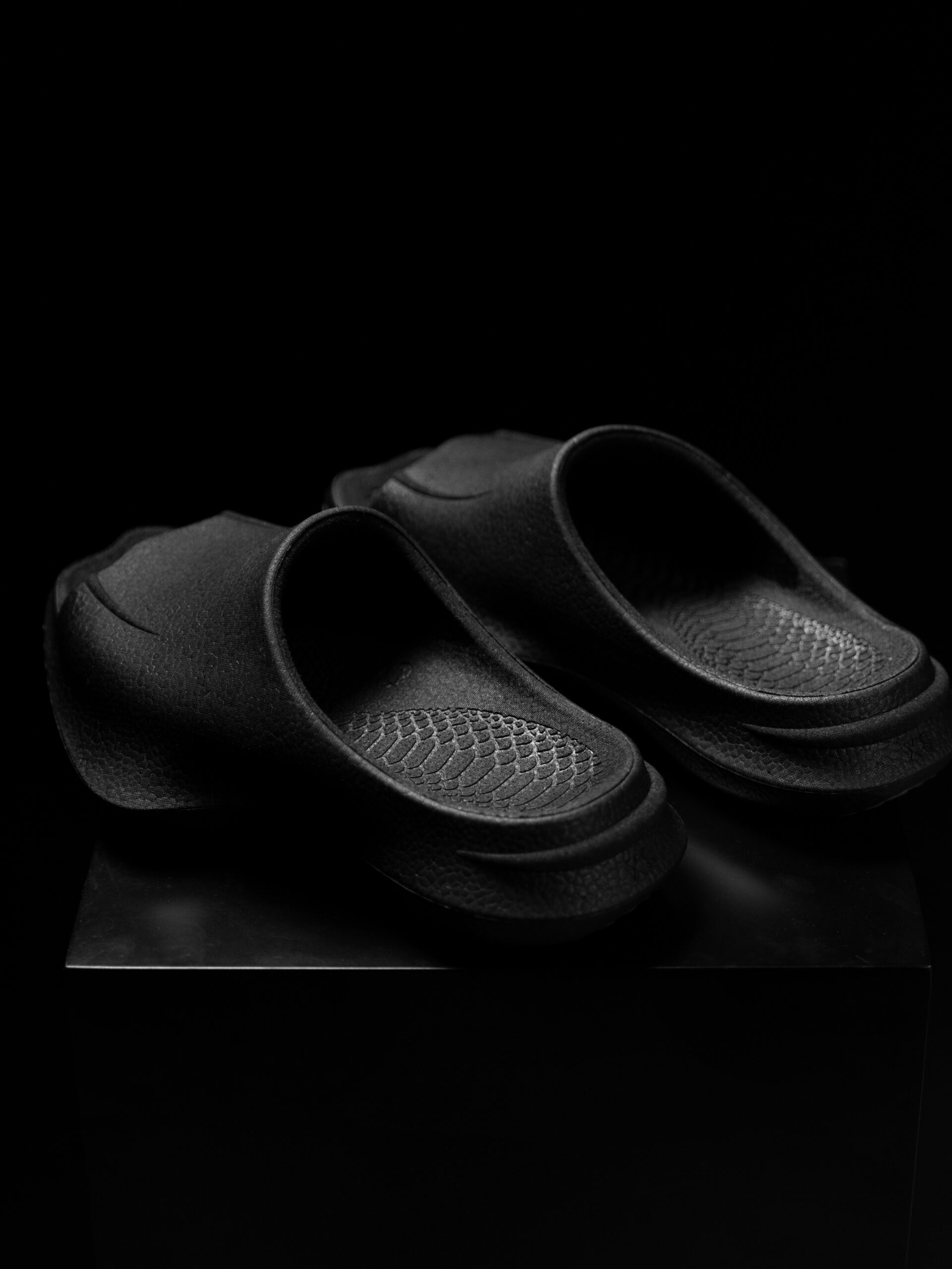 作为蛇年限定款,Boom Manba 将生物仿生学融入设计细节。鞋面蛇牙状立体切割,搭配激光蚀刻鳞纹,动态光变效果随角度变化;鞋底波浪纹路灵感来自蛇腹,在湿滑地面上防滑系数高出 EVA 拖鞋 30%,保障不同受用群体在不同的使用环境下的稳定穿着,鞋底部明确标识有 Xsneaker 品牌图腾。