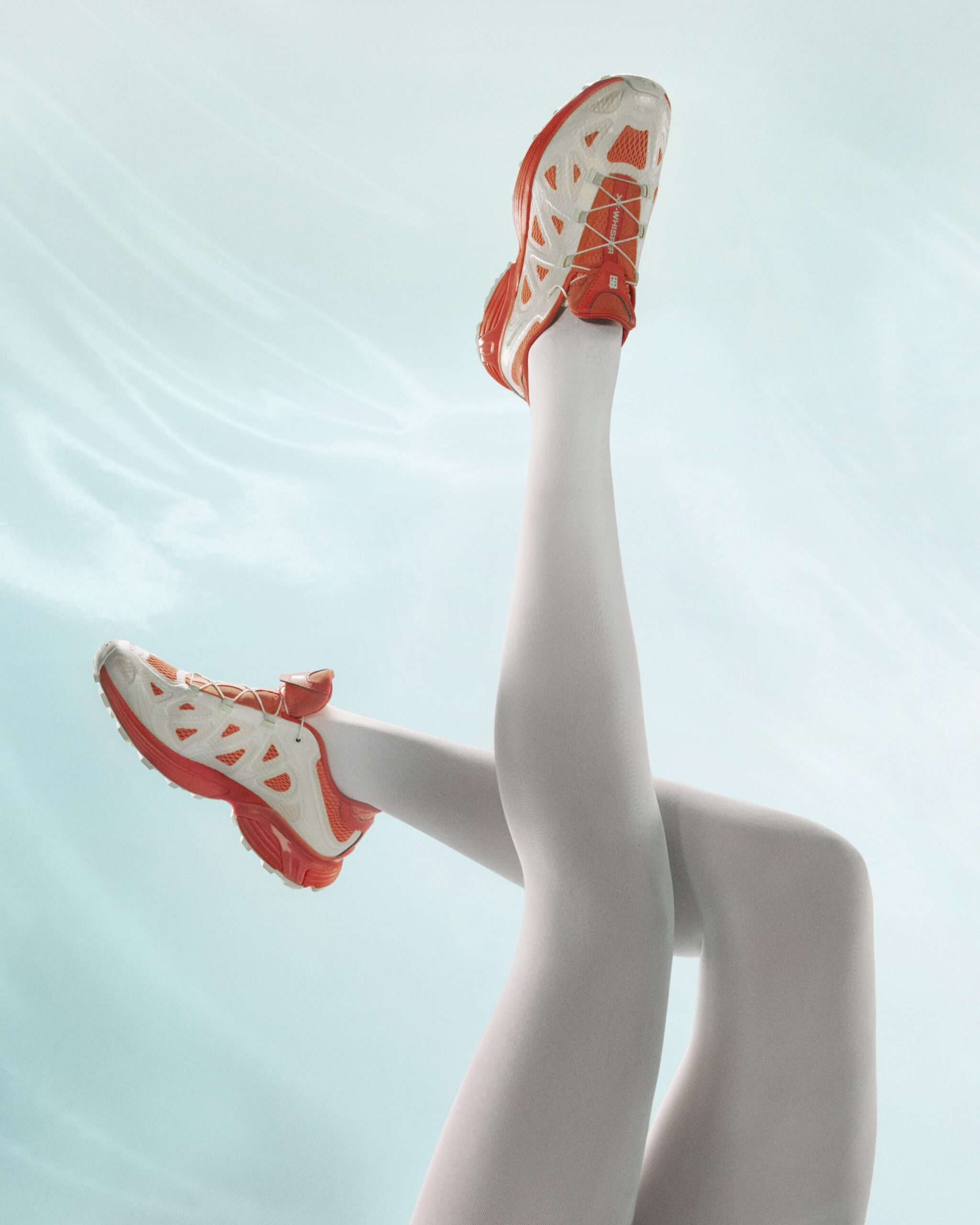 XT-WHISPER VOID AMA 鞋身以三种富含深意的配色呈现:鞋面网眼材质选择了象征热烈生命力的的珊瑚橙,原生而生动;网面之上,覆盖着象征静谧中孕育的珍宝的珍珠白色;最终以来源于水下随潮流摇曳的植物的海藻绿色点缀于鞋面细节,象征生命在流动中生长。