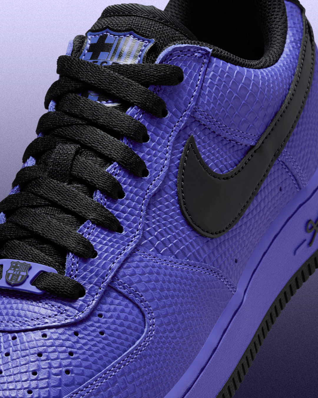 Nike 近日正式释出 Kobe Bryant x Nike Air Force 1 Low Protro 系列的最新配色——以西甲豪门巴塞罗那为灵感打造的特别款式。这款球鞋采用紫罗兰蛇纹鞋面,搭配黑色亮面 Swoosh,并在后跟、鞋带和外底处融入 Kobe 标志性 Logo,细节呼应设计主旨。鞋带扣、鞋舌以及 ReactX 鞋垫上还特别加入了 FC Barcelona 队徽,展现致敬意味。预计将于 2025 年秋季正式发售,球迷们不妨提前关注。
