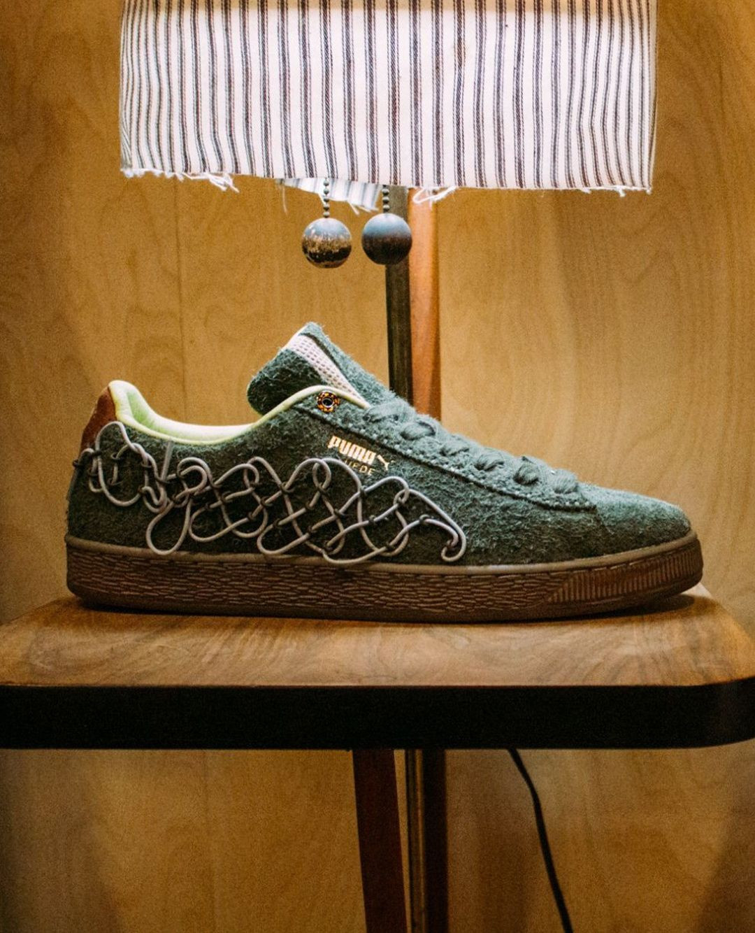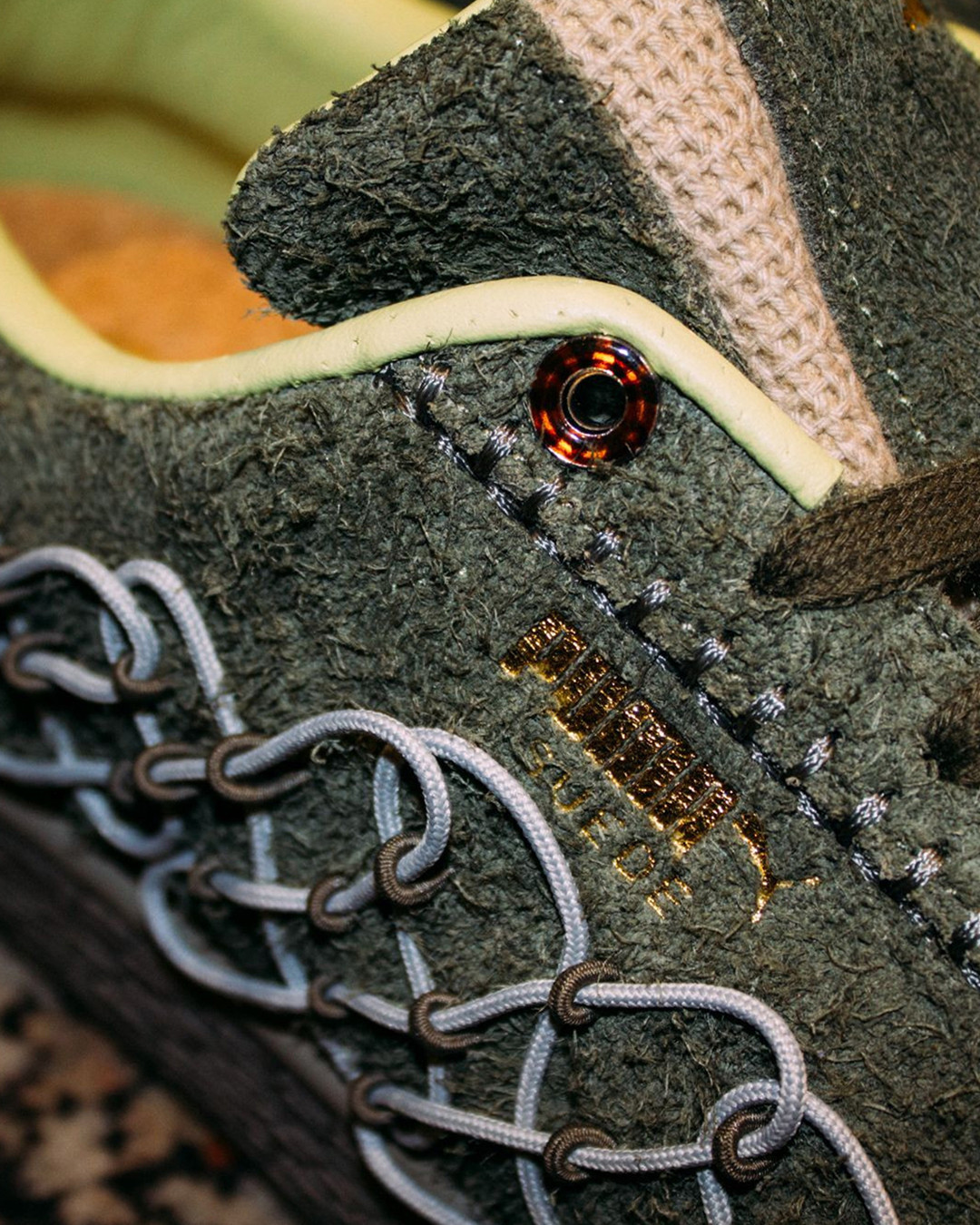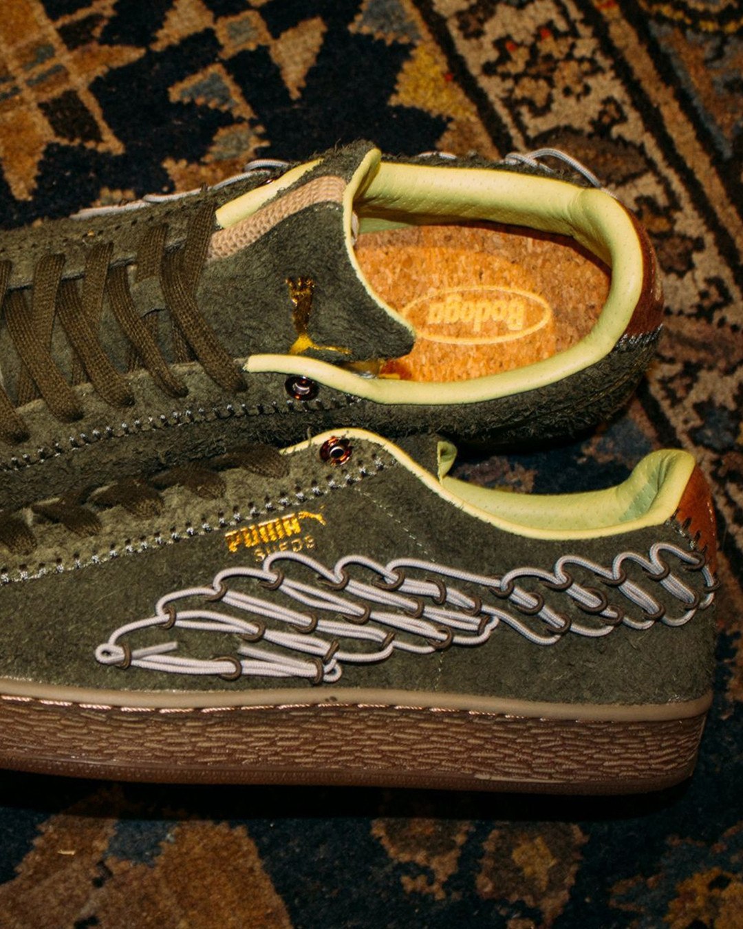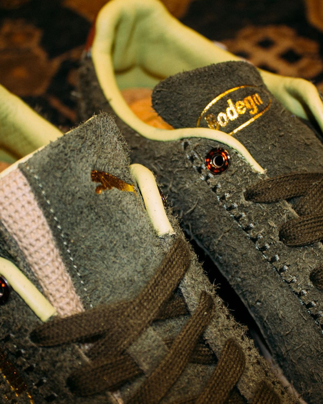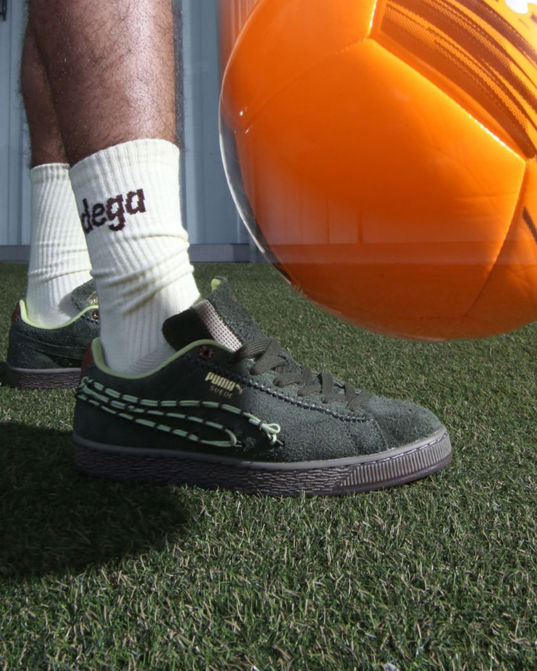 来自波士顿的潮流名所 Bodega 此次以「Engineered for Expression」为灵感,重新演绎 PUMA 经典的 Suede 鞋型。这款联名鞋采用粗犷质感的森林绿色麂皮鞋面,搭配棕色中底和荧光绿内衬,营造出强烈的视觉对比。鞋侧的 PUMA 标志则通过绳索结构进行全新诠释,呈现更具个性化的造型语言。