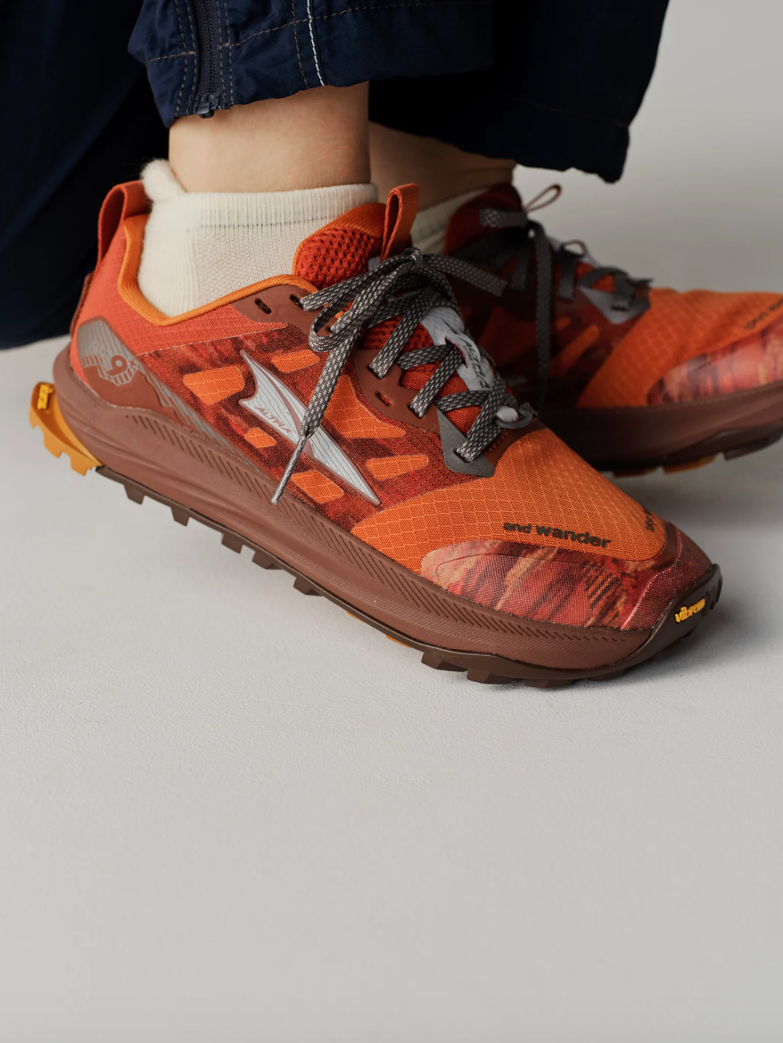 and wander 与来自美国犹他州的跑鞋品牌 Altra 再度推出了联名鞋款——Altra x and wander Lone Peak 9+。 该鞋采用原创配色,融合了 Altra 畅销鞋型 Lone Peak 与 and wander 的图案印花。这也是 Altra 首次在 Lone Peak 系列中加入图案,使其性能与设计感兼备。鞋的外底以高性能橡胶复合材料 Vibram® Megagrip 制成——即使在潮湿或不平坦地形上也能提供出色的抓地力。独特的 Altra FootShape™ 鞋型允许脚趾自由伸展,而 Zero Drop™ 平台则保持了从脚跟到脚趾处的均匀厚度,增强了脚部灵活性。