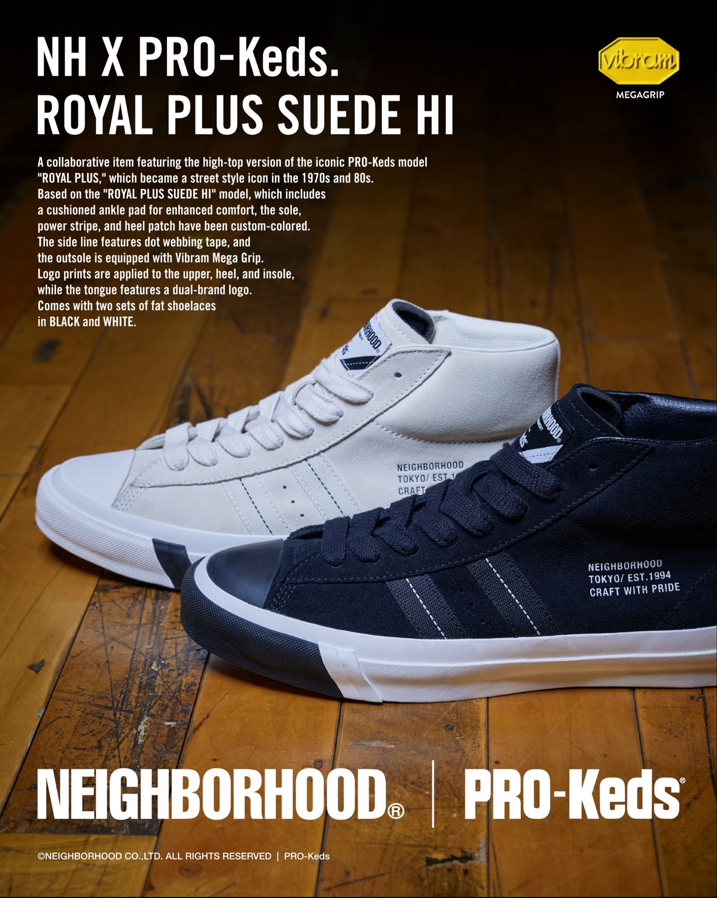 2025 秋冬,NEIGHBORHOOD 携手 PRO-KEDS 推出联名鞋款 ROYAL PLUS SUEDE HI。本次合作以 70-80 年代街头经典高帮鞋型为基底,采用定制配色鞋底、强力条纹与后跟贴片,侧边点缀标志性点状织带细节。鞋面采用麂皮材质并搭配双品牌联名标识,搭载 Vibram Mega Grip 防滑外底与增强缓震脚踝衬垫。随鞋附赠黑白色粗鞋带各一副,完美诠释复古街头美学与硬核工艺的融合。据悉该鞋款将于 8 月 23 日正式发售,感兴趣的朋友不要错过了。
