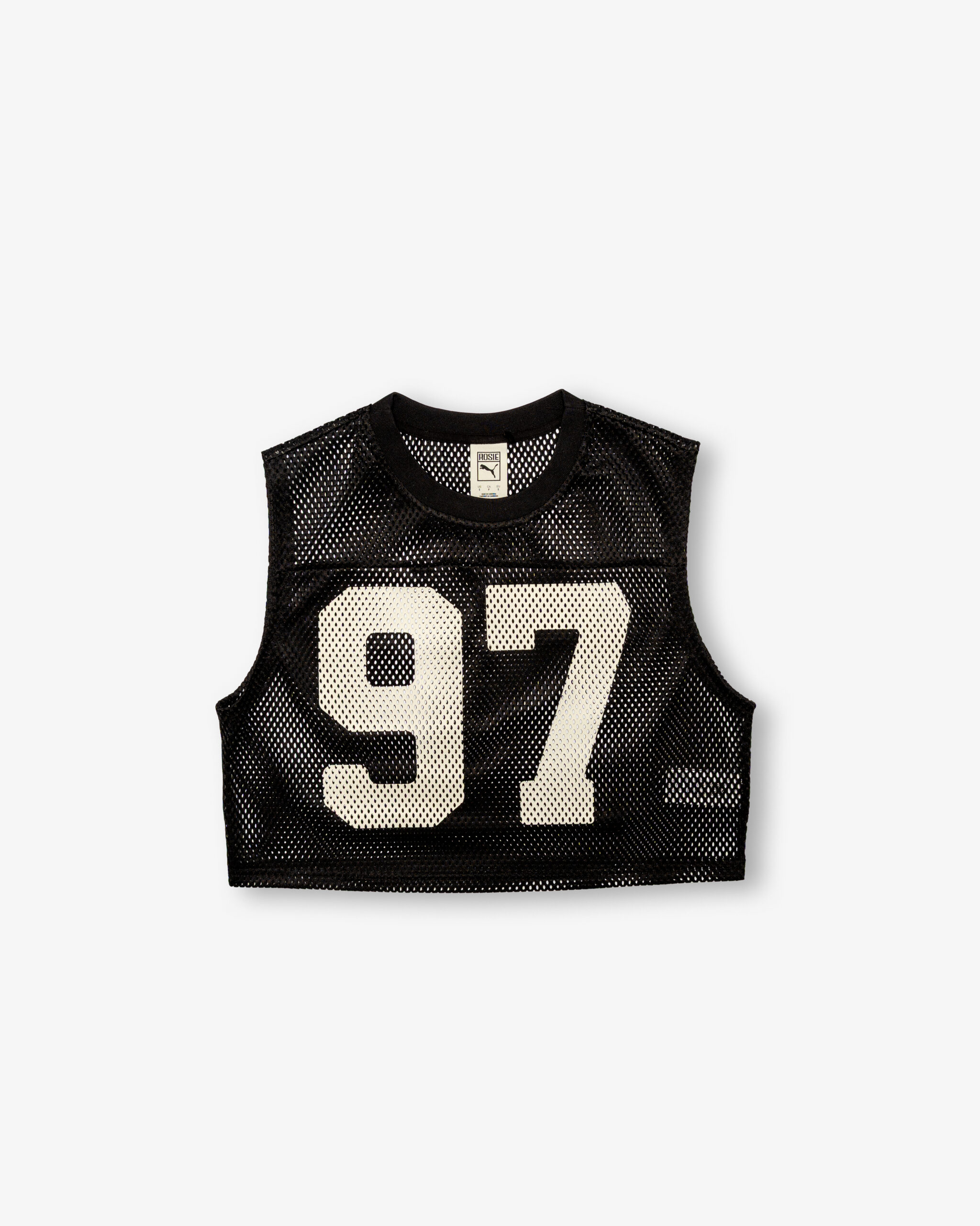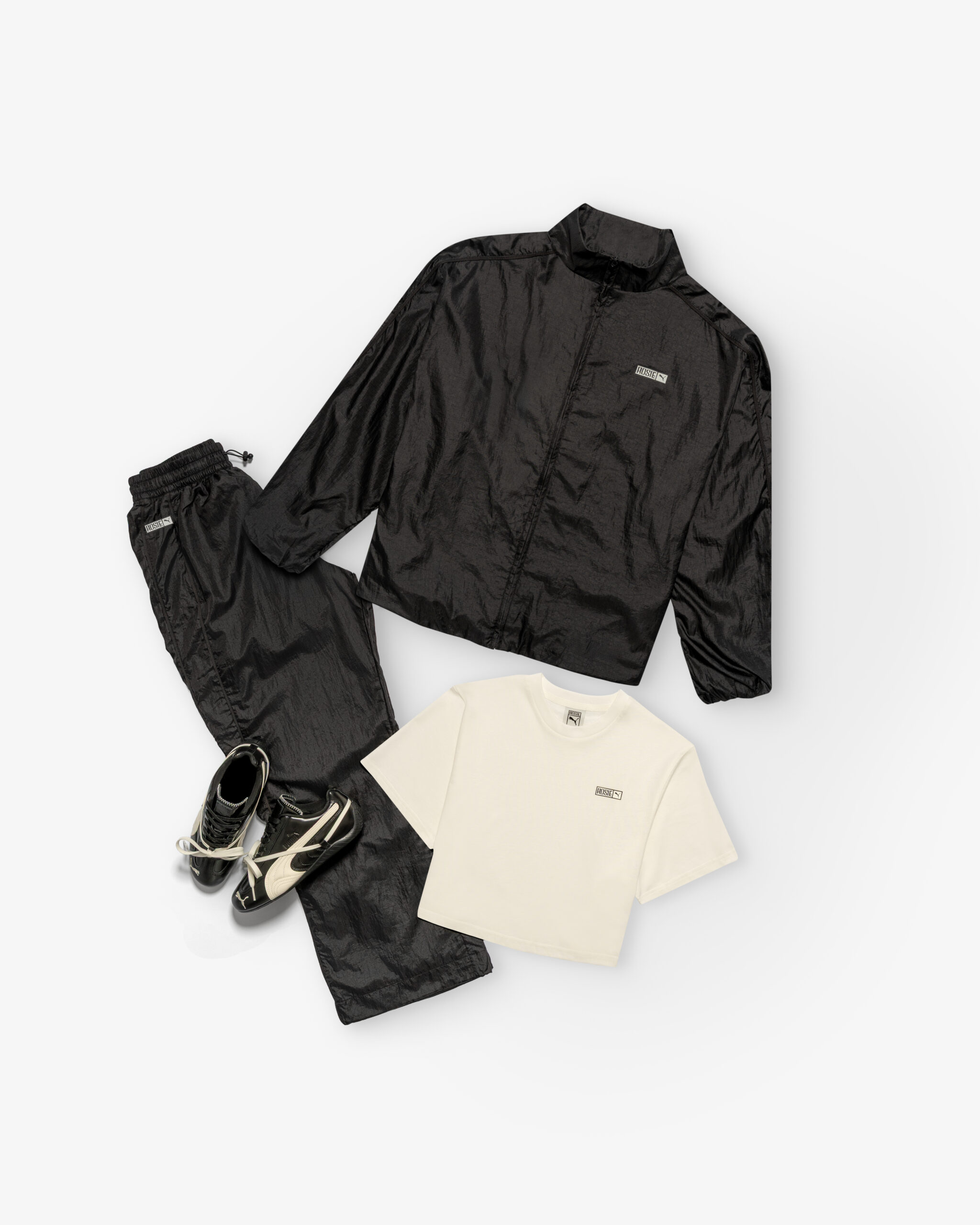 在服装方面,合作系列的设计理念传达了 Rosé 对运动和街头风格的诠释。通过对 PUMA 标志性运动套装的重新演绎,系列中的宽松运动夹克和休闲运动裤为经典款式注入了现代气息。休闲舒适的运动服灵感款式还包括半拉链夹克和全拉链卫衣,以及背后印有大胆「ROSIE」字样图案的网面上衣。系列中的 X-Small Duffle 包和 Micro Grip 包作为有趣的视觉亮点,以迷你尺寸为整体增添了个性和比例感。