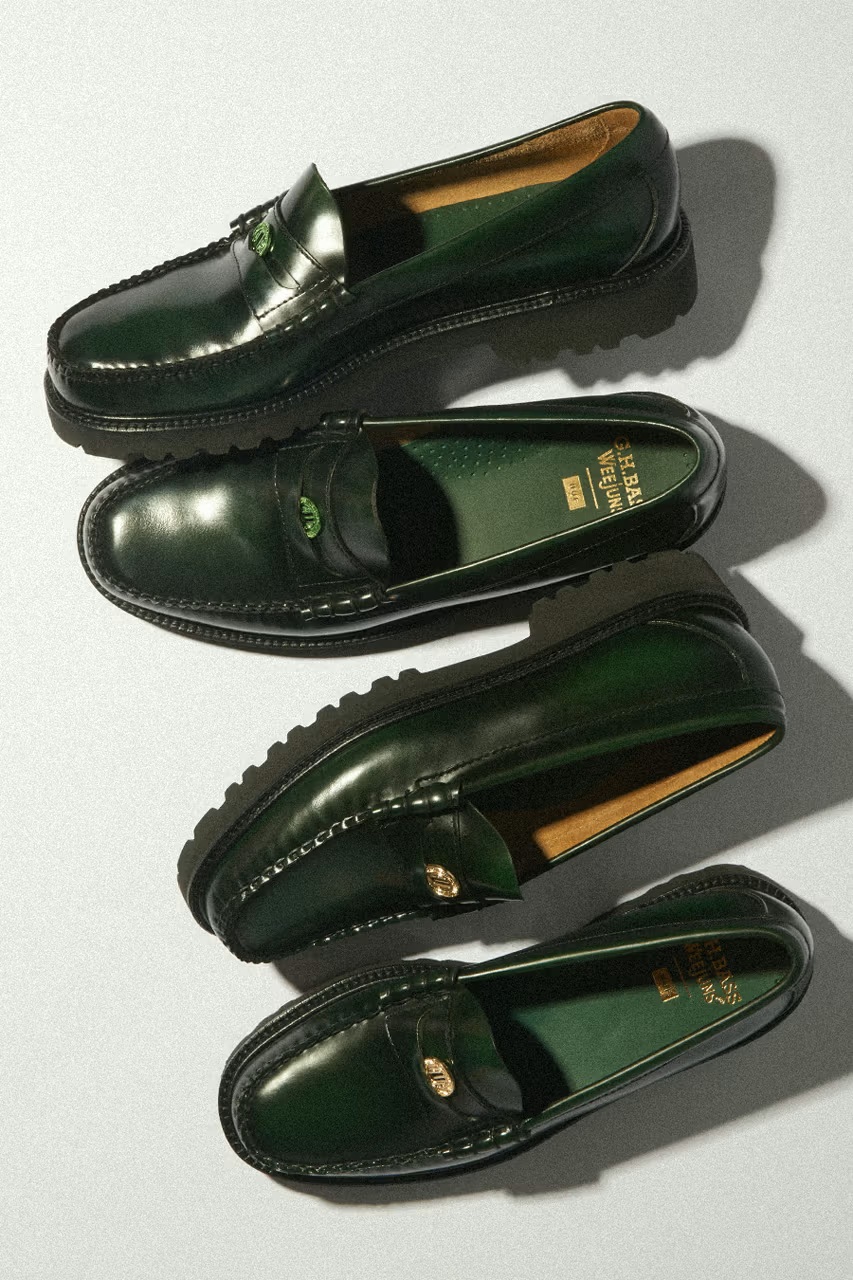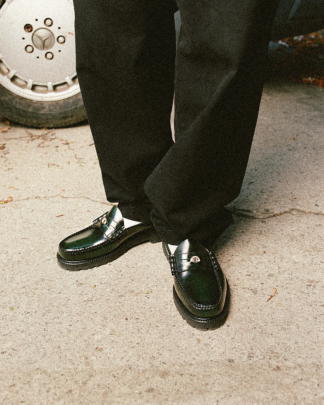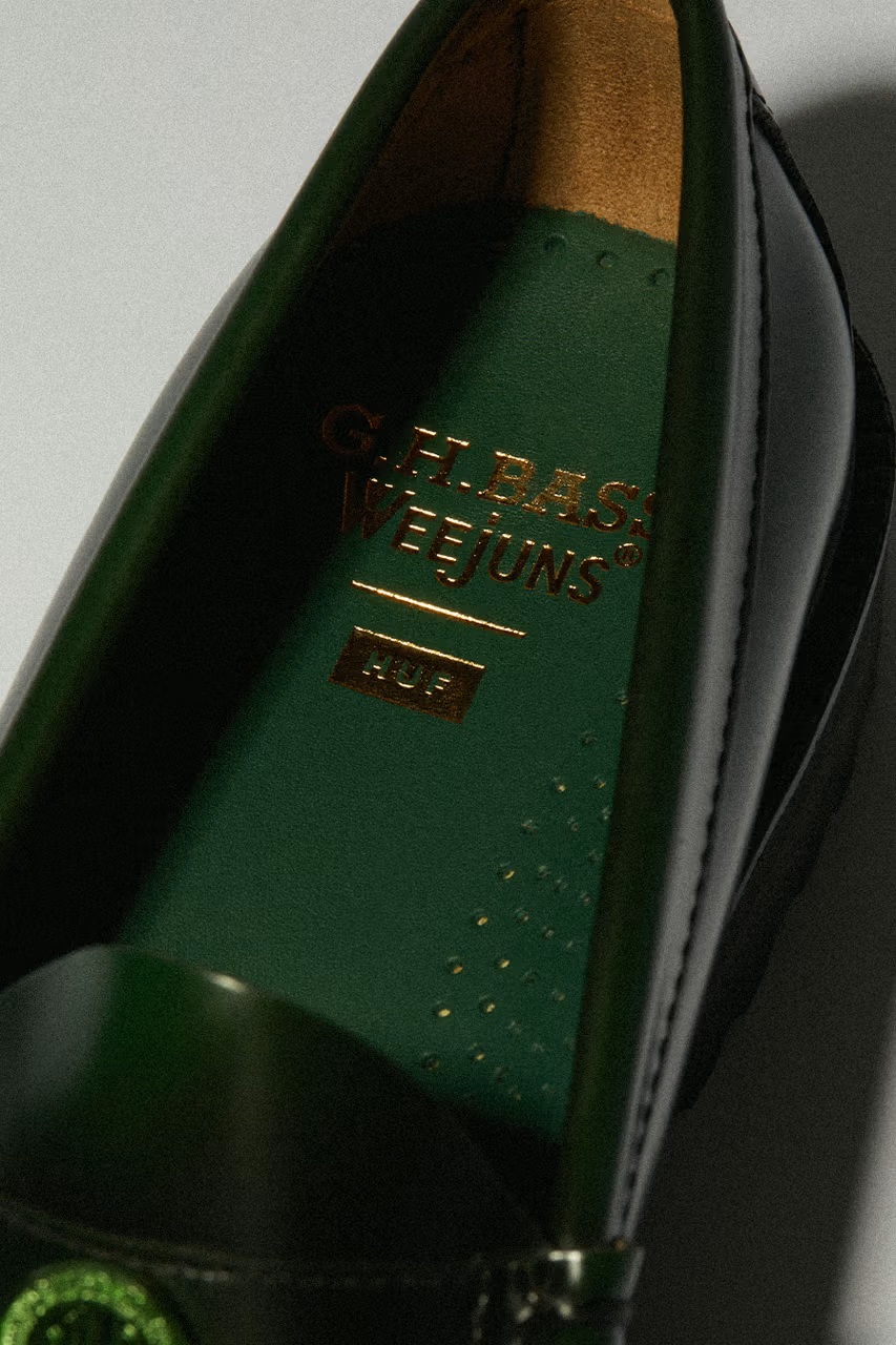 HUF 与美国知名鞋履品牌 G.H. BASS 合作推出了一款 Larson 乐福鞋,采用了创新的 chamelon(变色)皮革,随着时间推移,皮革的颜色会由黑色逐渐变成深绿色,这种特殊皮革由 G.H. BASS 独家生产。