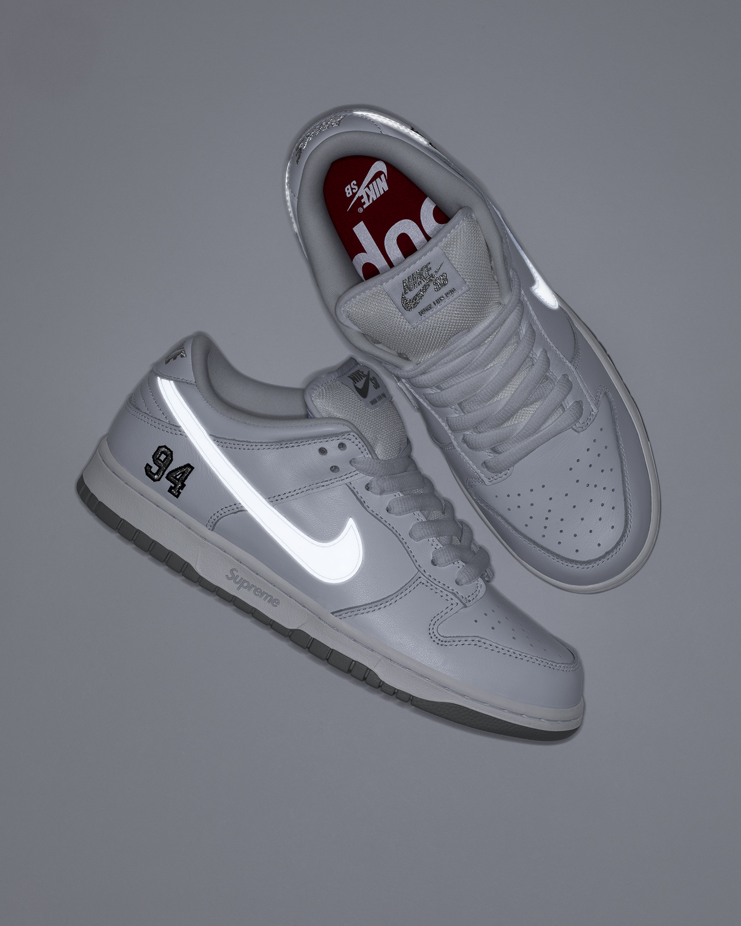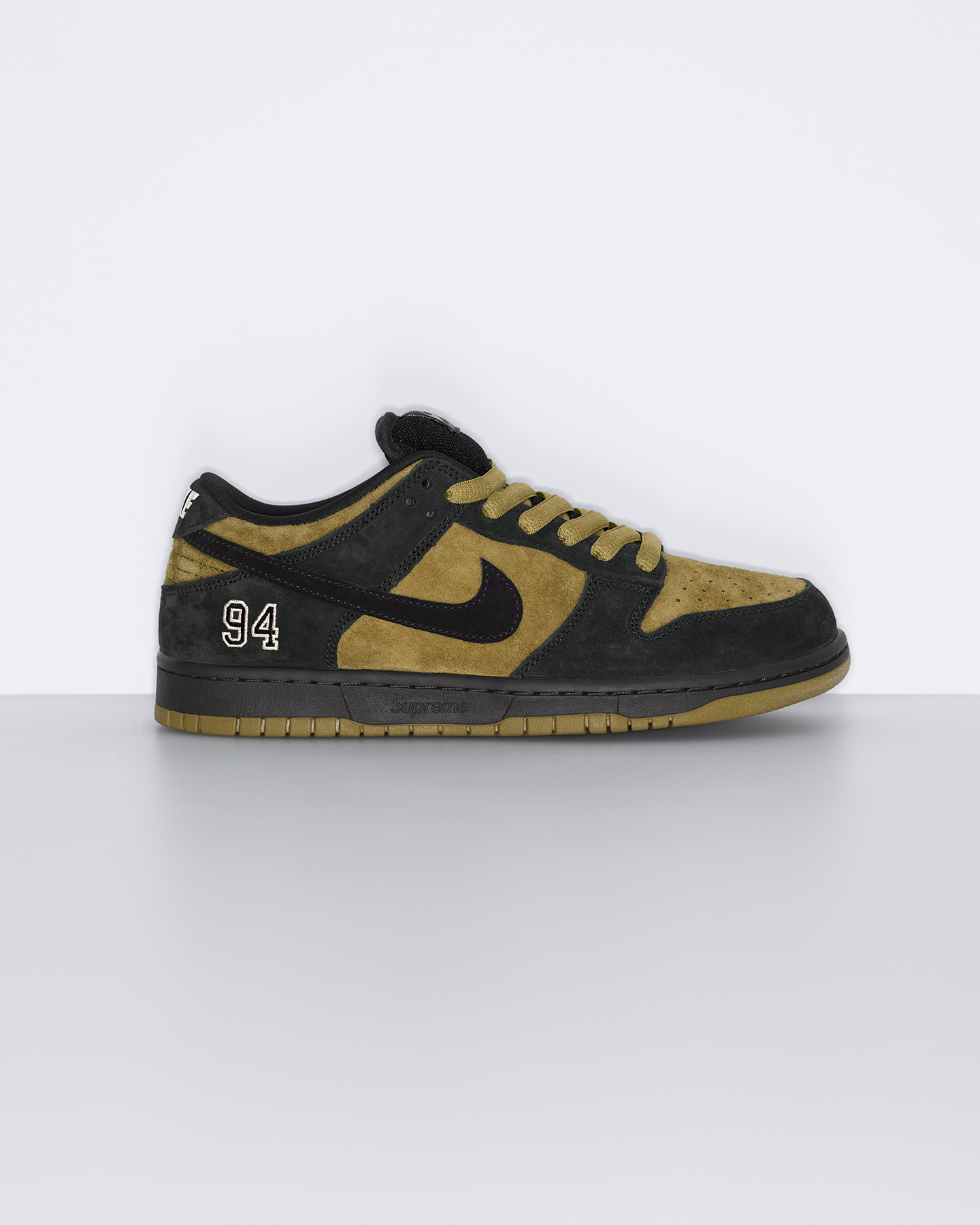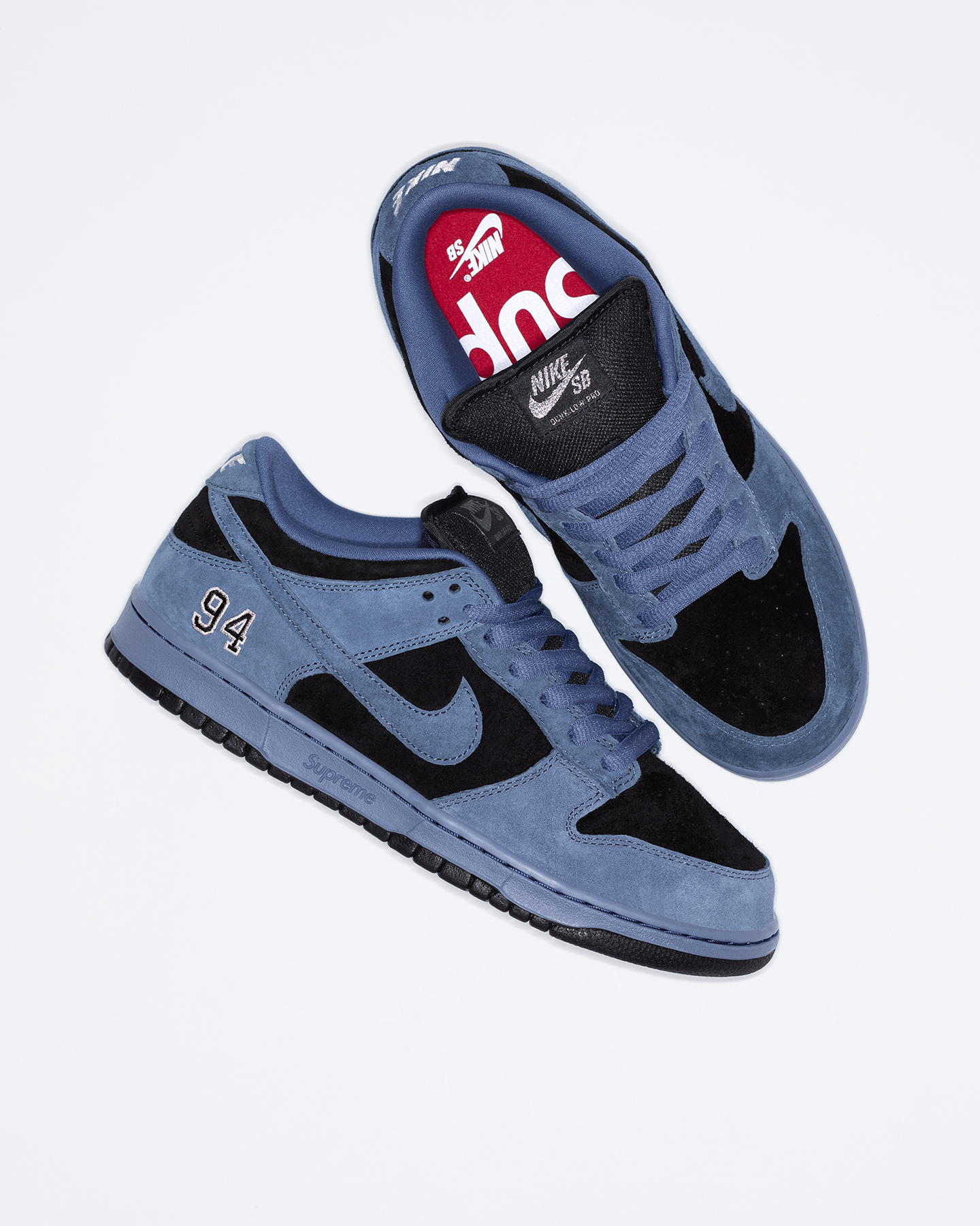 2025 年秋季,Supreme 与 Nike SB 合作推出全新 Dunk Low 鞋款。所有 Dunk Low 均配备橡胶外底、后跟有 Zoom Air 气垫、加厚网眼鞋舌、联名鞋垫,鞋领及鞋舌为网眼衬里,鞋舌饰有金属质地编织徽标标签,中底带压印徽标,鞋身侧面和鞋跟处有金属质地刺绣图案。
