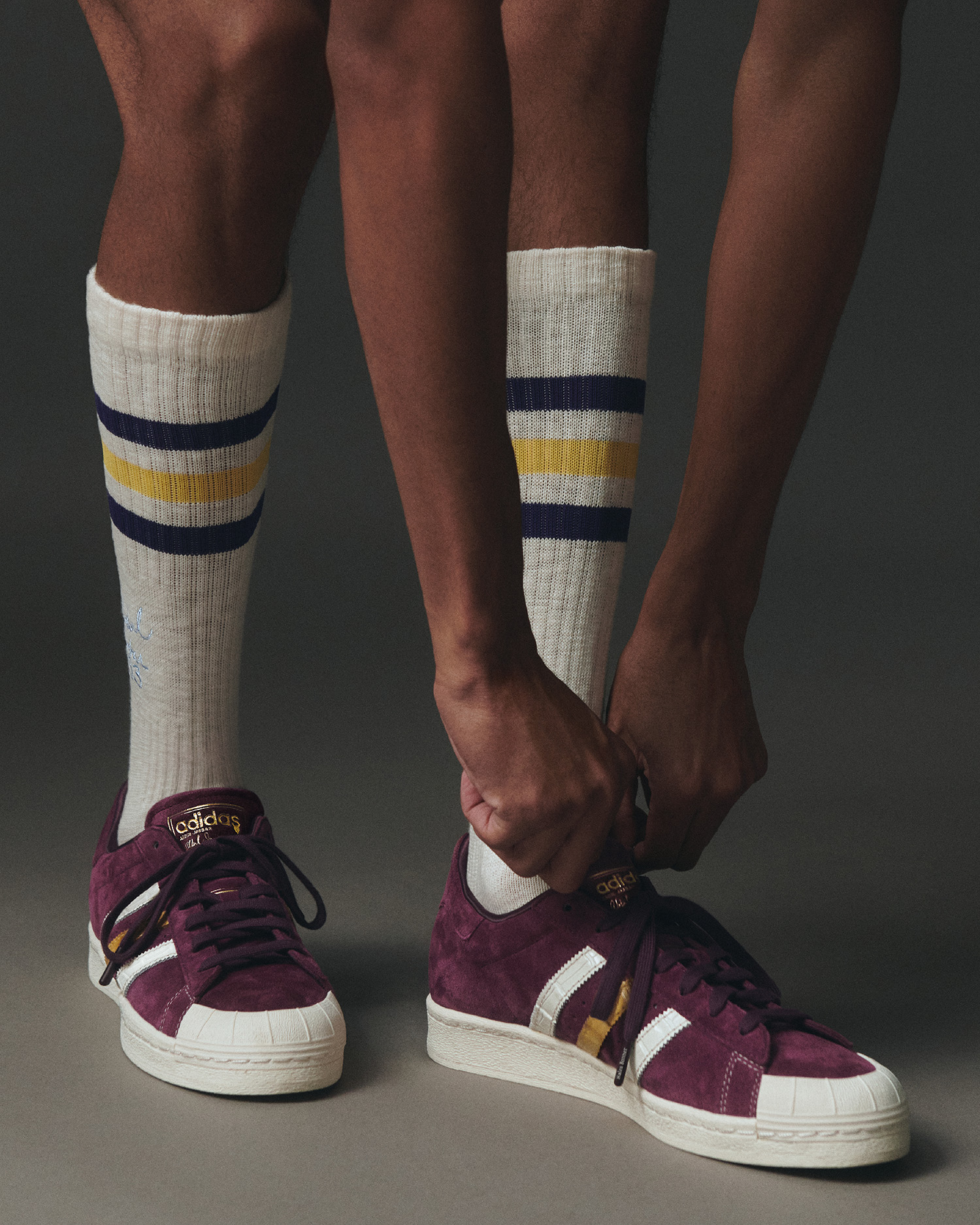 鞋履方面,Wales Bonner 重新演绎了经典的 adidas Jabbar 鞋型,并以能够代表 Jabbar 运动与艺术生涯的配色与细节呈现设计。其中 WB Jabbar Lo 以麂皮材质鞋面打造,配有双色交替的三条纹细节,以及鞋舌上的金色天勾印花,为这双 70 年代的经典球鞋赋予了当代时尚氛围。