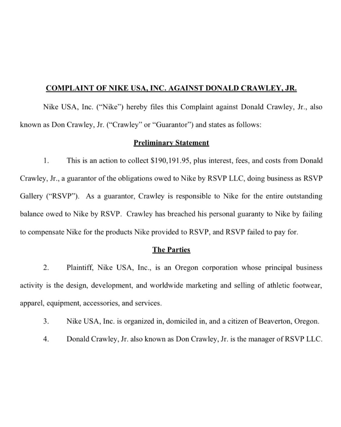 Nike 对 Don C 和 Virgil Abloh 共同创立的芝加哥精品店 RSVP Gallery 提起诉讼,要求 RSVP 支付其在 2023 年 9 月至 2024 年 3 月期间供应给 RSVP 的商品相关的 190,191.95 美元未付款项。Don Crawley Jr.(又名 Don C)在诉讼中被列为该商店债务的担保人。Nike 声称,RSVP 未能支付款项,违反了与该公司签订的协议。