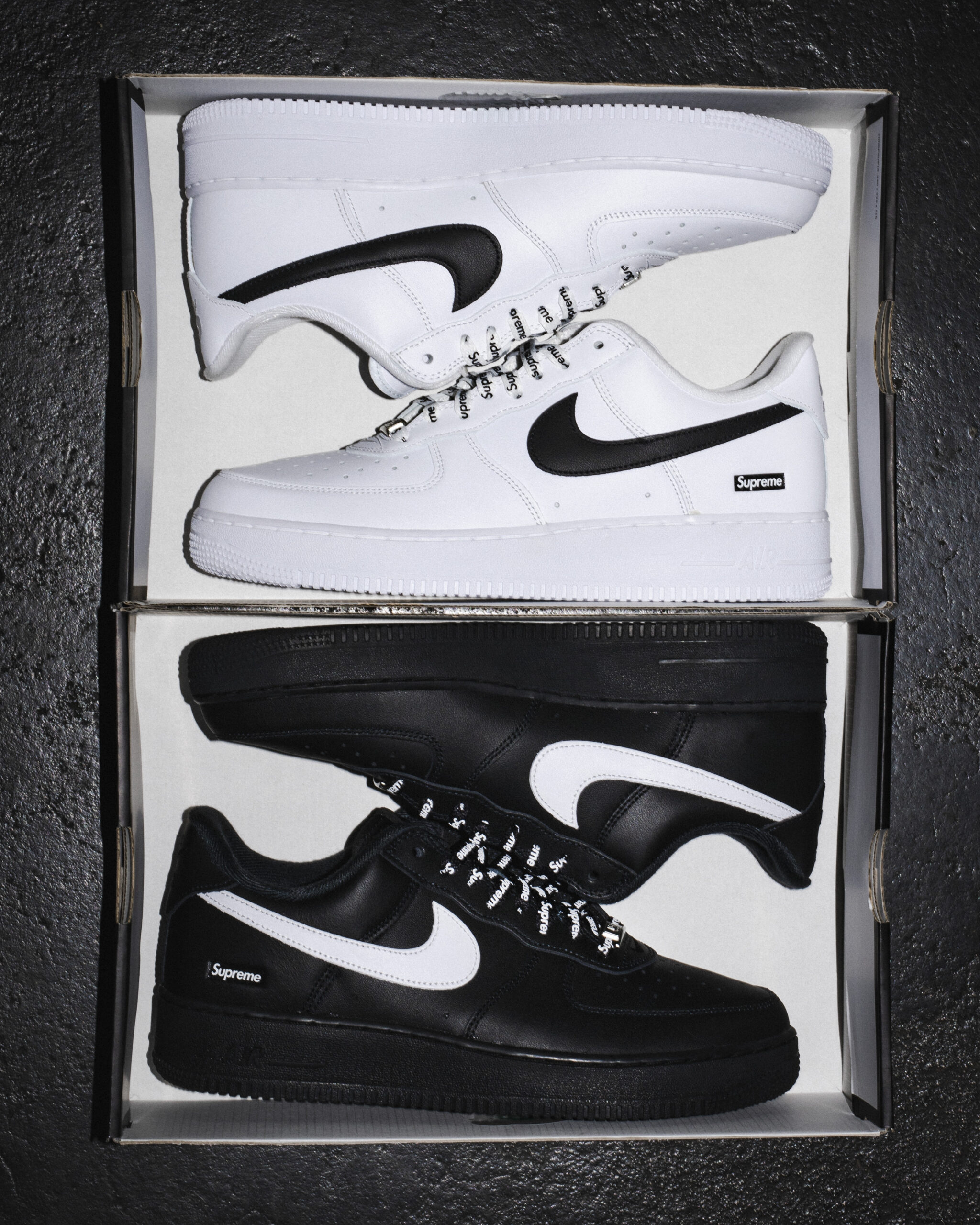 Supreme 再度携手 Nike 合作推出定制款 Air Force 1 Low。该鞋款专为 Supreme 打造,该鞋款采用全粒面皮革鞋面,带穿孔皮革鞋头和 DURAPLUSH 衬里。联名鞋垫、鞋带扣和鞋舌标签。鞋眼和鞋跟处有刺绣徽标,侧面有压纹印花徽标,将推出黑白两款配色。据悉,Supreme x Nike Air Force 1 Low 将于 9 月 20 日仅在上海店铺,亚太其他店铺及 Supreme 官网发售,微信小程序不参与本次发售。