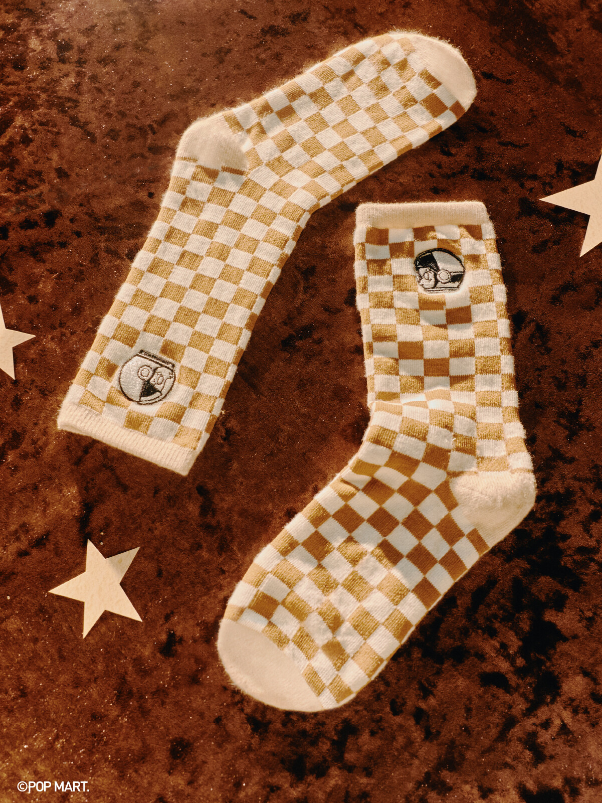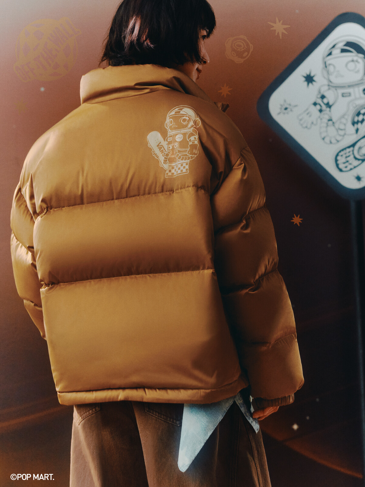 此外,联名服饰系列以大地色调打造五款秋冬必备单品。宽松版型的套头衫以蘑菇灰与黑色毛圈布勾勒温暖质感,胸前与背后的图案相互呼应,并与同款针织裤搭配,呈现松弛自在的气息。棕色和南瓜色羽绒服在背部融入大胆设计,呈现鲜明的个性风格。短款羽绒服以俏皮贴布细节丰富层次感。米色与棕色短款连帽衫通过植绒工艺营造立体肌理,为冬日叠搭注入活力。在配饰方面,棋盘格袜子与印花迷你手袋则为整体造型点下轻快一笔,将 SPACE MOLLY 的创意魅力自然延展至日常穿搭。