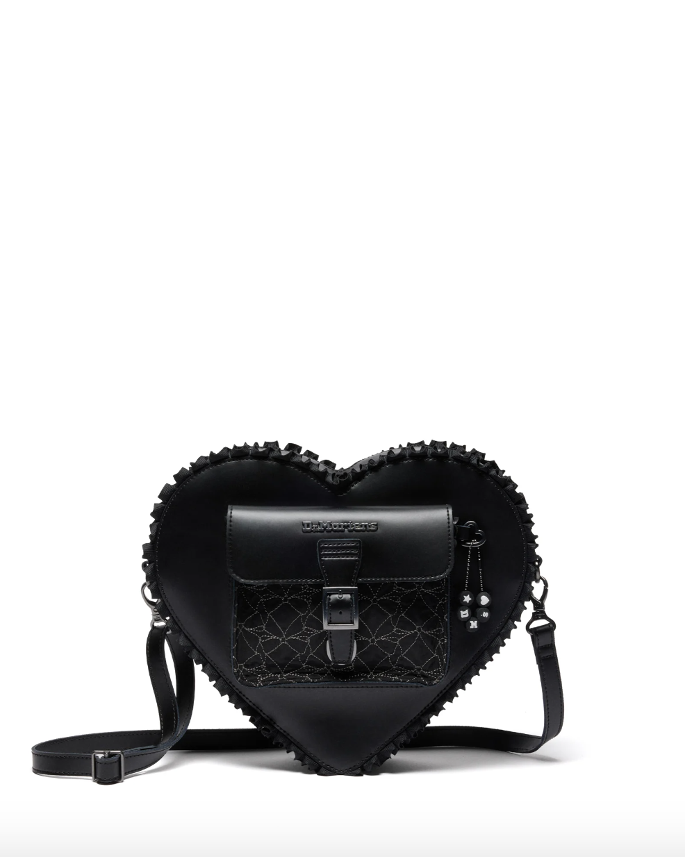 此次推出的单品共包括四种鞋子和一款包:1460 Frill 8 Eye Boot 鞋款的鞋带孔两侧饰有褶边;Jadon Frill 8 Eye Boot 在长鞋带中心的两侧饰有褶边;Elphie II Frill Lace Up Shoe 采用了系带设计,两侧饰有褶边;Elphie MJ Frill Mary Jane Shoe 则在开口处饰有褶边。另外,心形包袋以耐用的基辅皮革制成,包身饰有缎面荷叶边,中央的绗缝口袋饰有刺绣缎带图案,并饰有串珠饰物和金属配件。整个胶囊系列即将在 Dr. Martens 日本门店和官网发售,敬请期待。