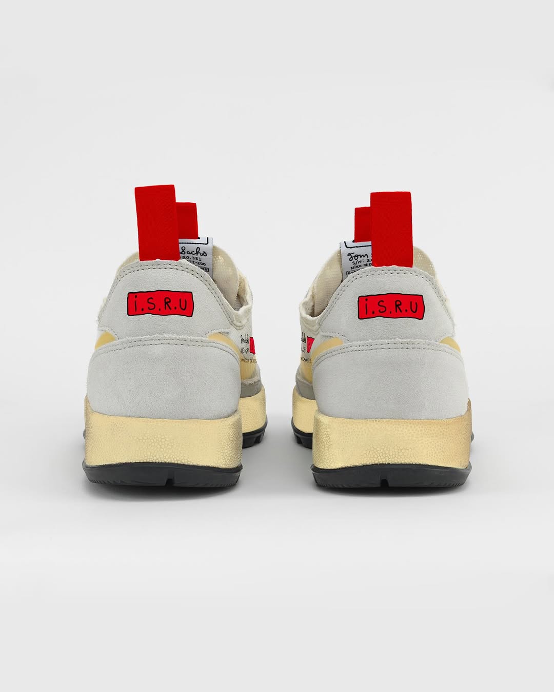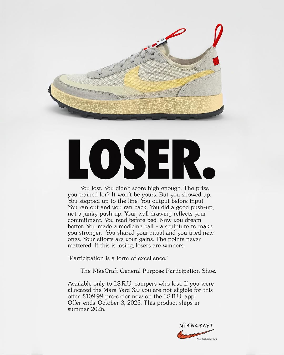 根据最新消息,凡是曾参与 I.S.R.U. Camp 却未能抽中 Mars Yard 3.0 的参与者,将收到一份特别的「安慰奖」。这份纪念礼物是一双全新配色的 General Purpose Sneaker,鞋身由灰色麂皮与网眼材质拼接,搭配米白色 Swoosh 与红色点缀。细节上,鞋跟与内侧印有 I.S.R.U. 徽章、Tom Sachs 签名及独立编号,彰显稀有属性。该鞋款仅限 Take the L 的玩家预订,登记通道已开启,将于 10 月 3 日截止,并预计在 2026 年夏季正式交付。