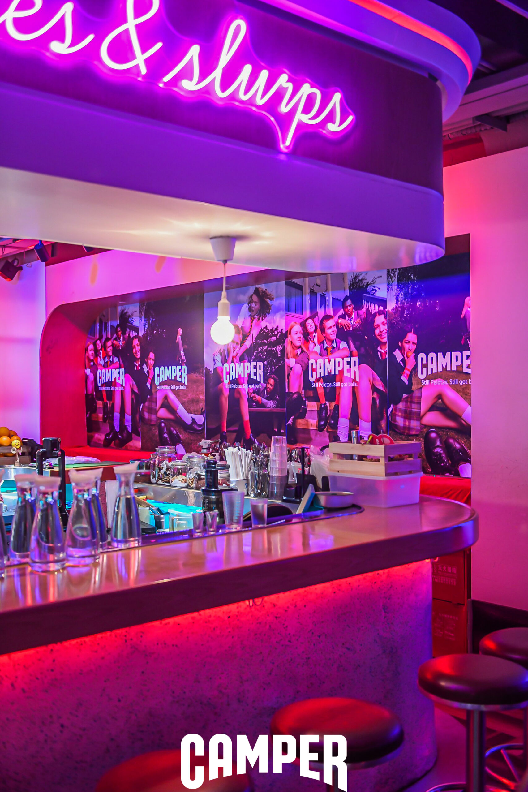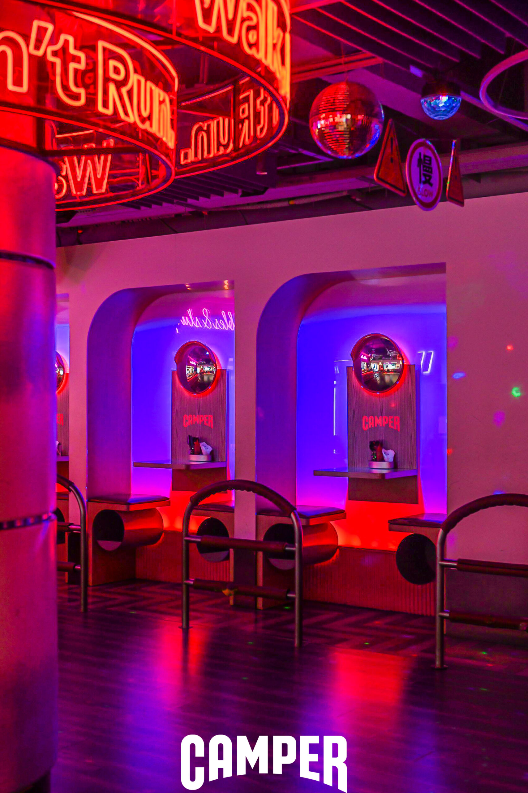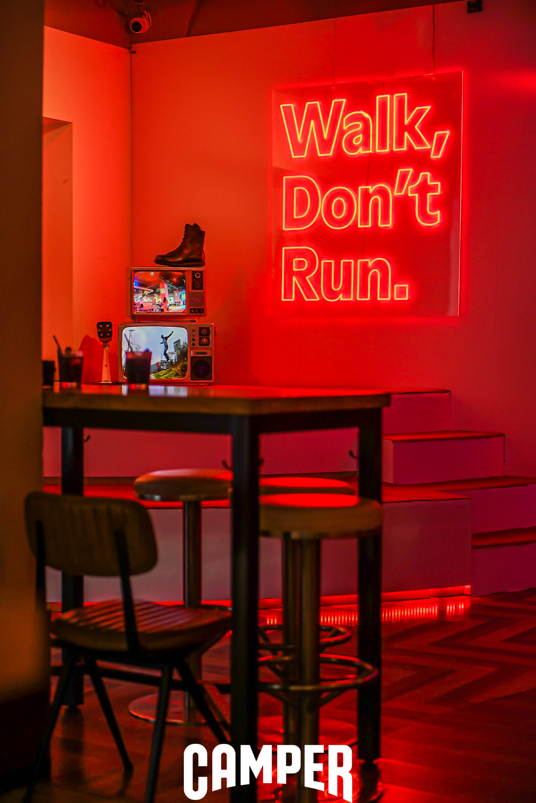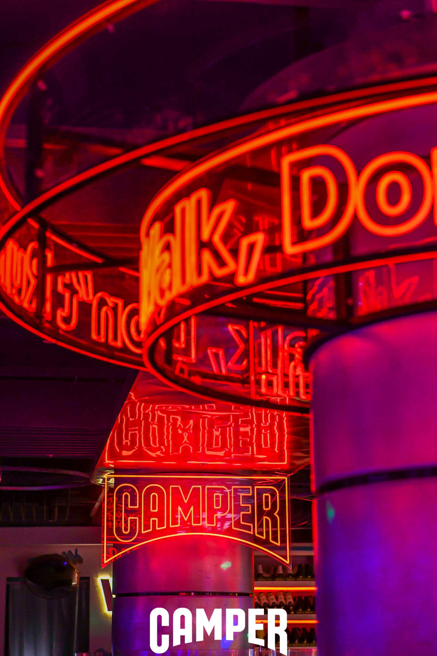 巨型霓虹灯桥形 CAMPER 标志率先映入眼帘,与门头复古设计相得益彰,在秋日夜色中点亮视觉焦点,一场摩登复古派对就此拉开序幕;入口处,墙面霓虹灯「Walk, Don’t Run.」标语渲染派对复古炙热氛围;活动周边复古方巾,通过刺绣机现场打造个性化定制荧光标识,玩转灵感,点亮独一无二的创意配饰。