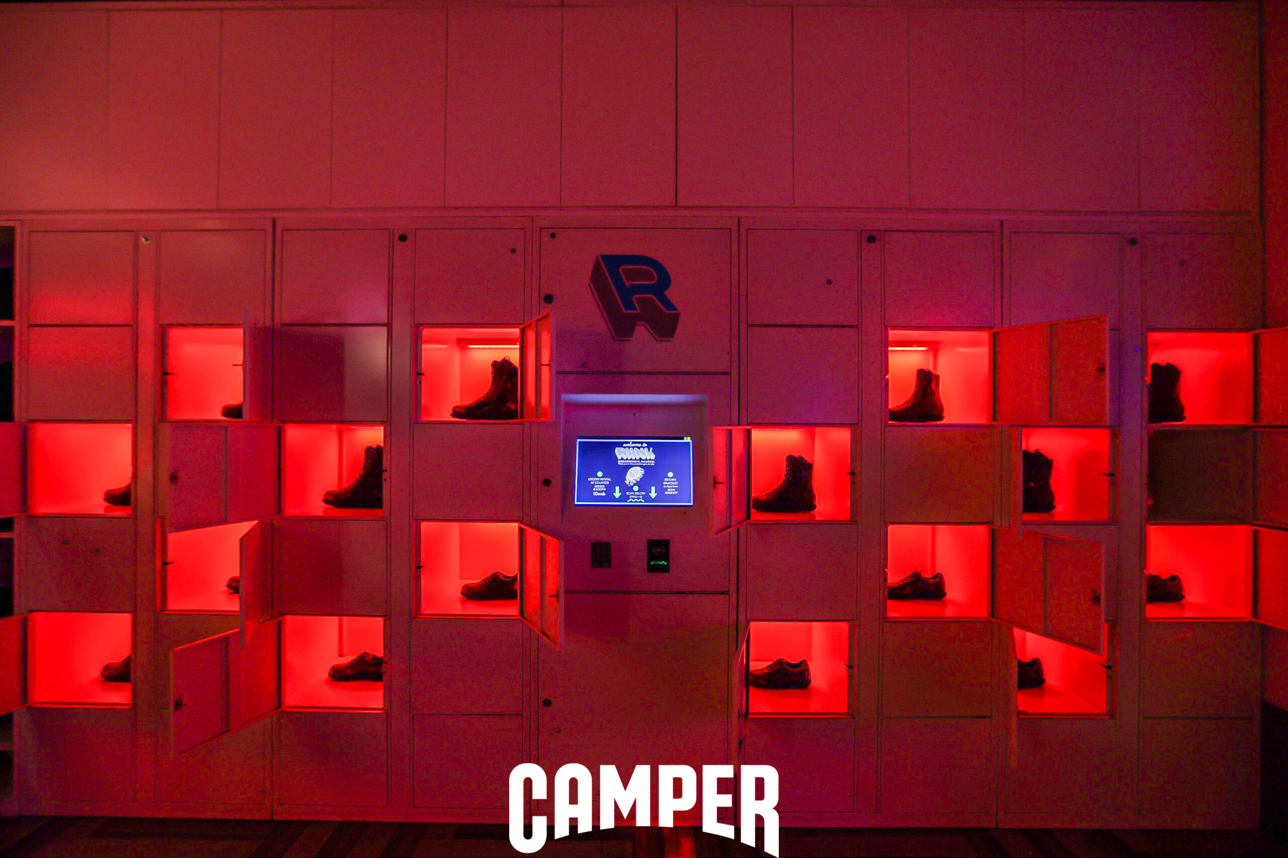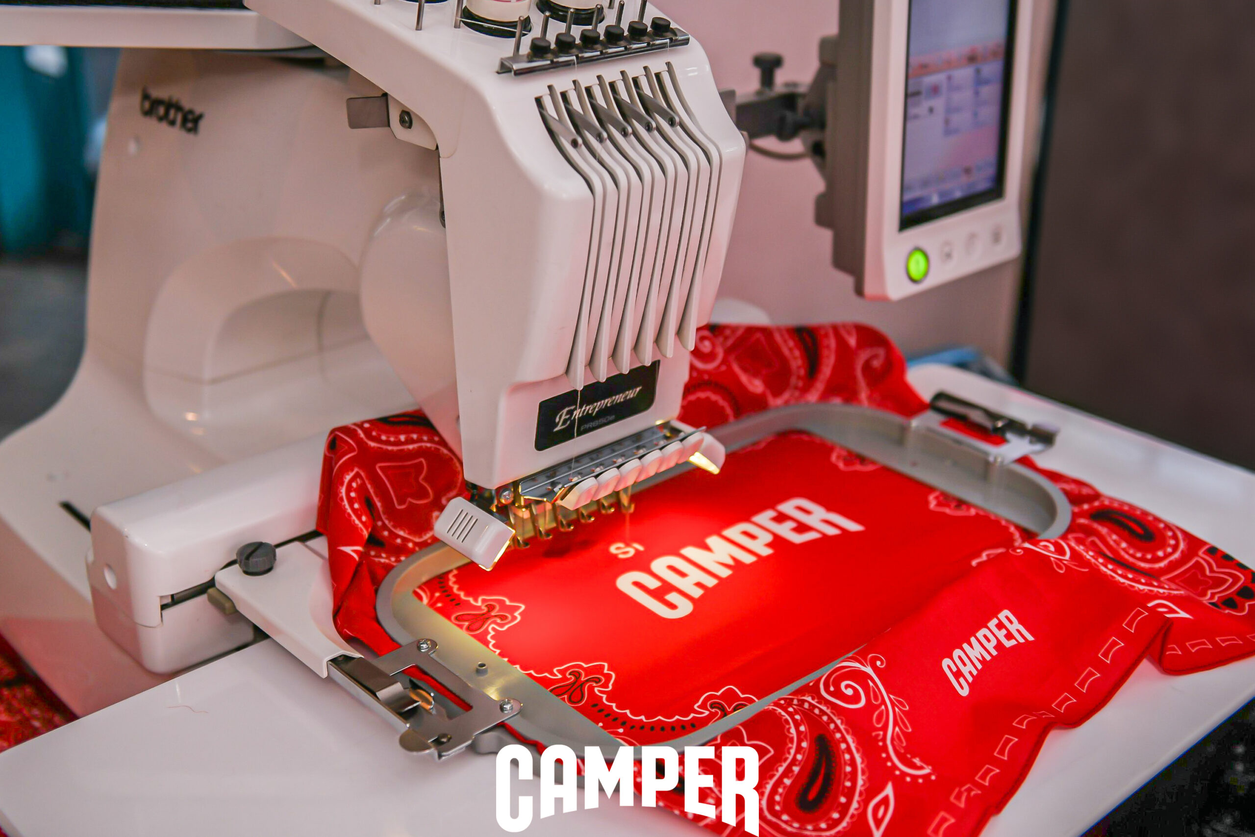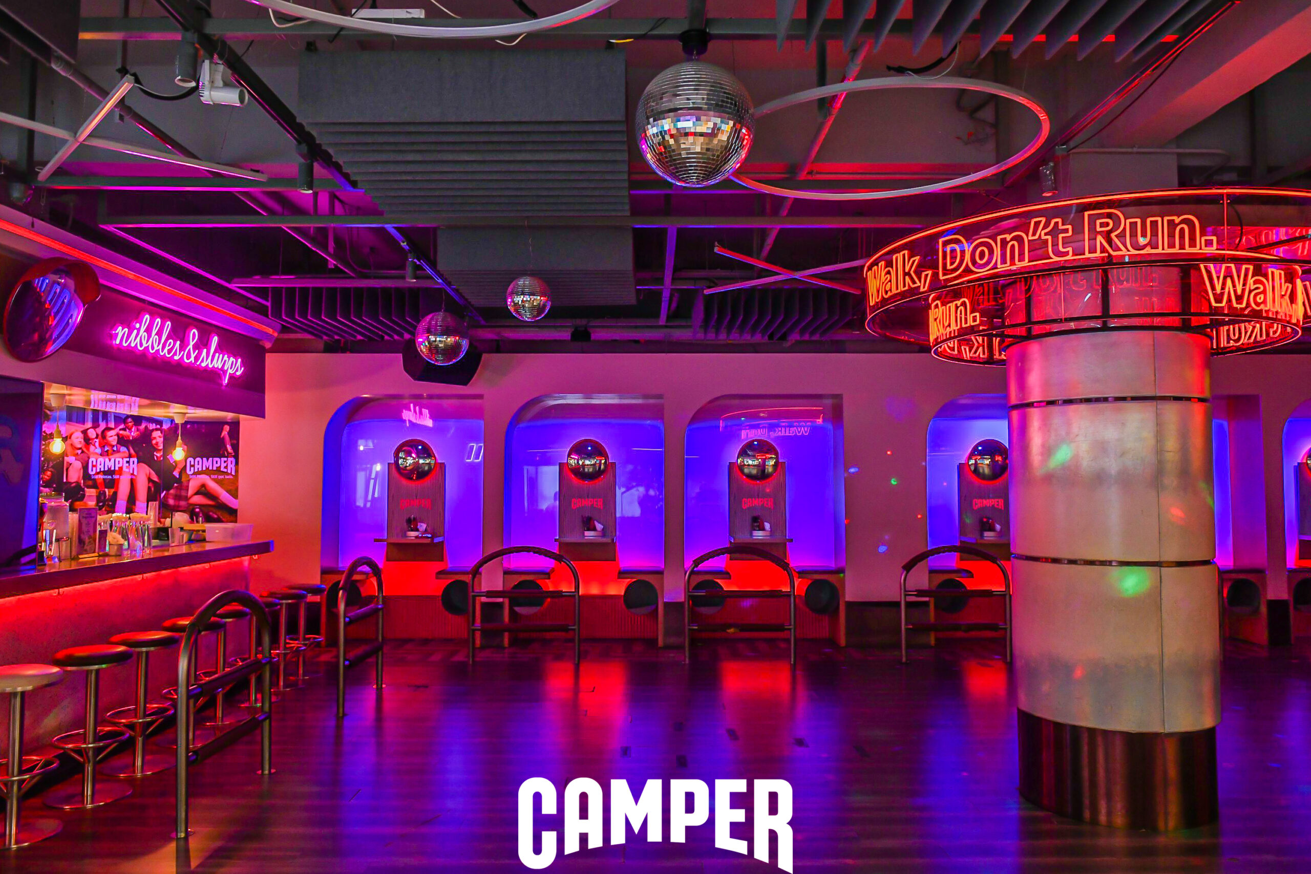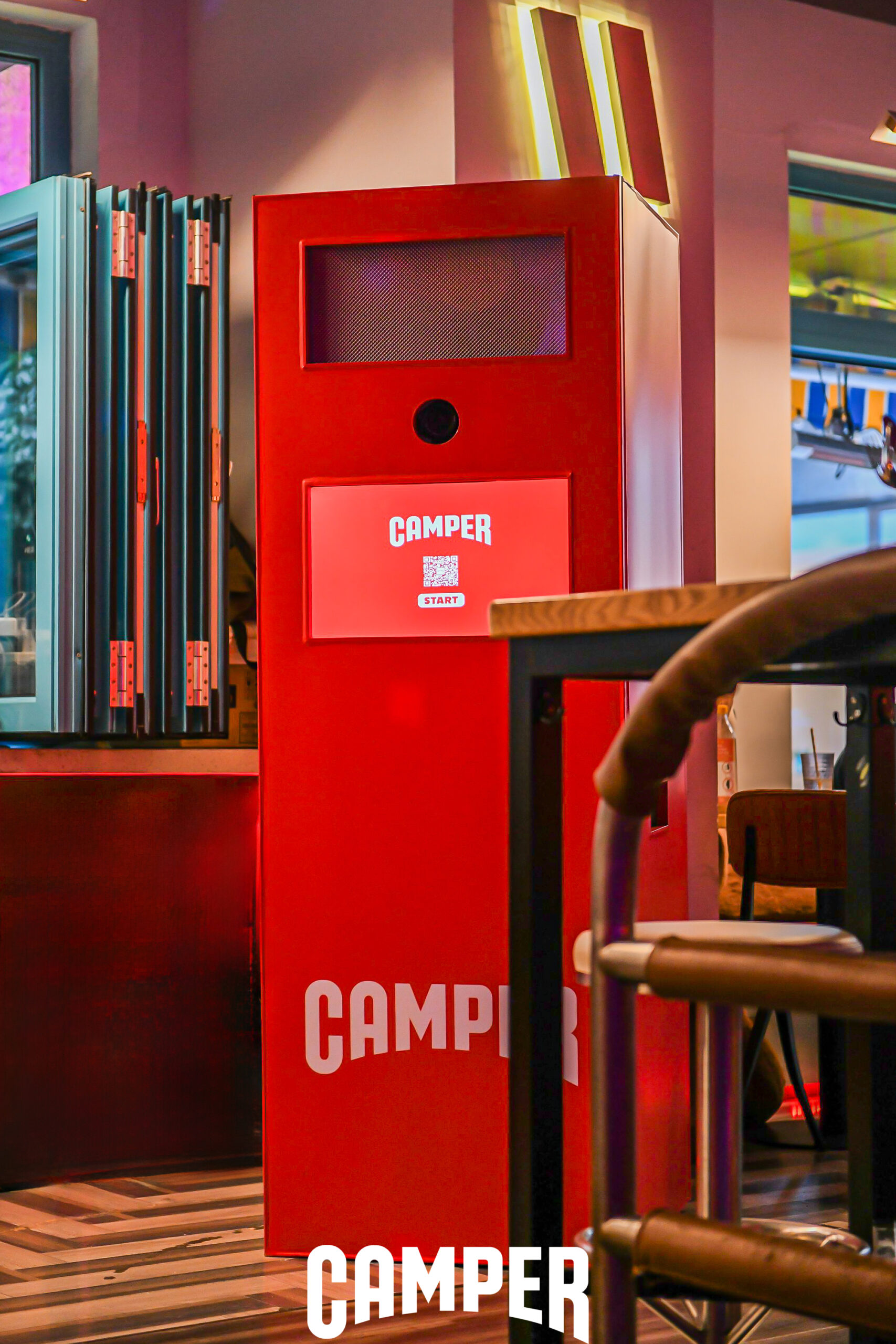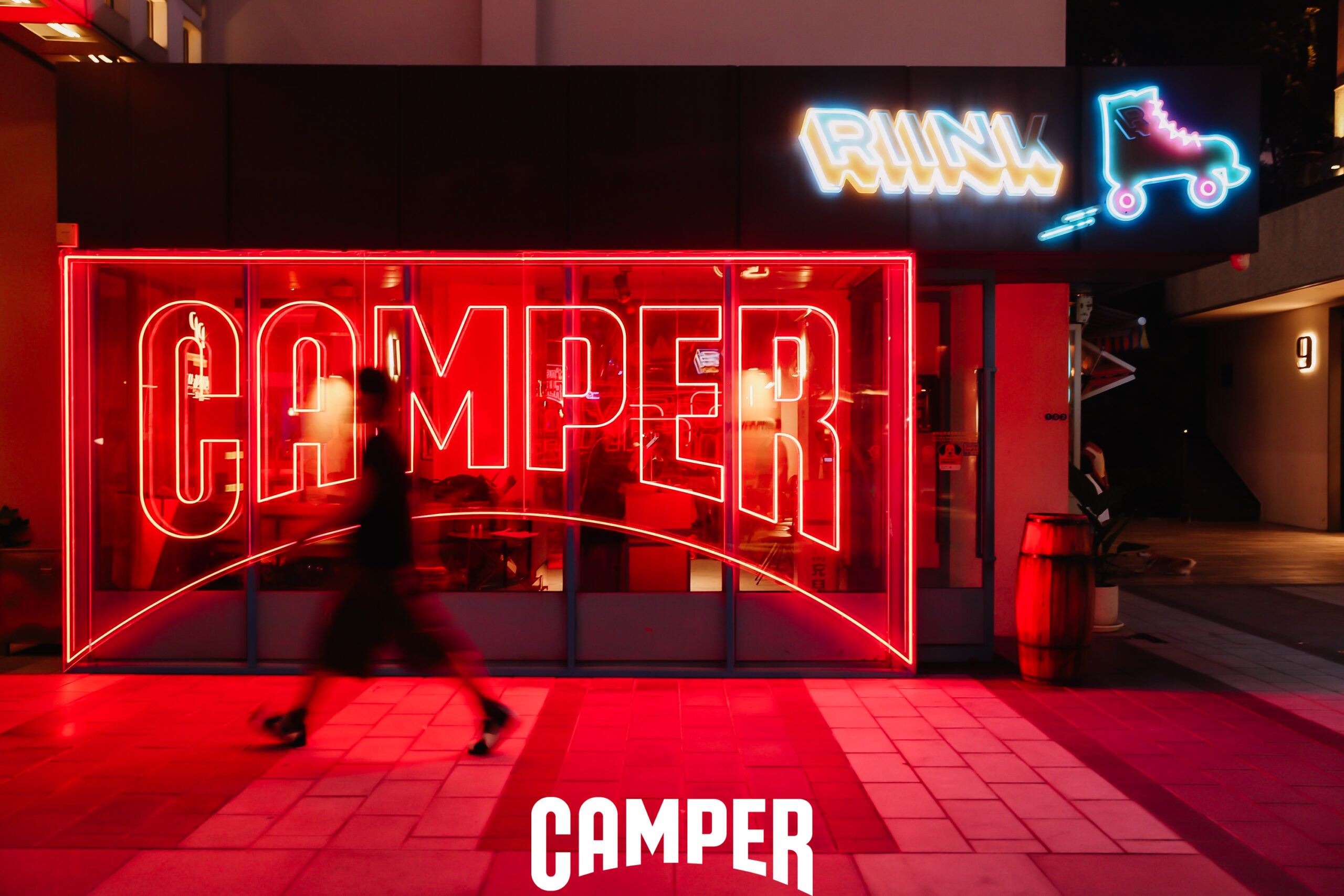 巨型霓虹灯桥形 CAMPER 标志率先映入眼帘,与门头复古设计相得益彰,在秋日夜色中点亮视觉焦点,一场摩登复古派对就此拉开序幕;入口处,墙面霓虹灯「Walk, Don’t Run.」标语渲染派对复古炙热氛围;活动周边复古方巾,通过刺绣机现场打造个性化定制荧光标识,玩转灵感,点亮独一无二的创意配饰。