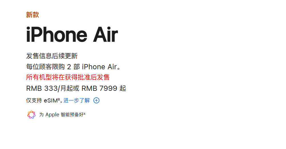 自发布会后,新机型 iPhone Air 得到了许多消费者的关注,但是 Apple 中国更新了 iPhone Air 的发售日期,由原先的「9 月 12 日预售」更改为「发售信息后续更新」和「所有机型将在获得批准后发售」。Apple 声明称「我们正与监管机构紧密合作,力争尽快在中国推出。」iPhone Air 仅支持 eSIM 不支持实体 SIM 卡,而国内的运营商目前暂时只有中国联通提供 eSIM 服务,故而不少人猜测 iPhone Air 的延迟发售的原因跟运营商服务有关。