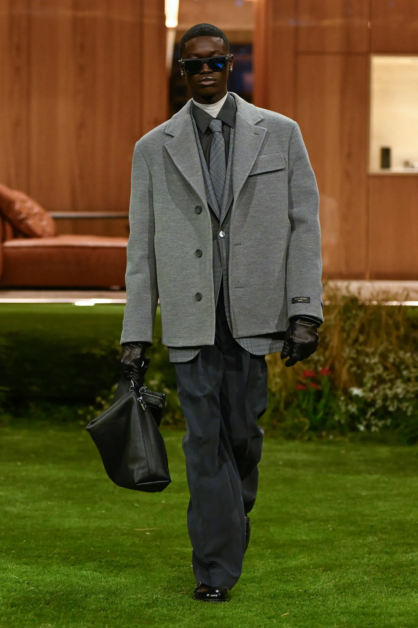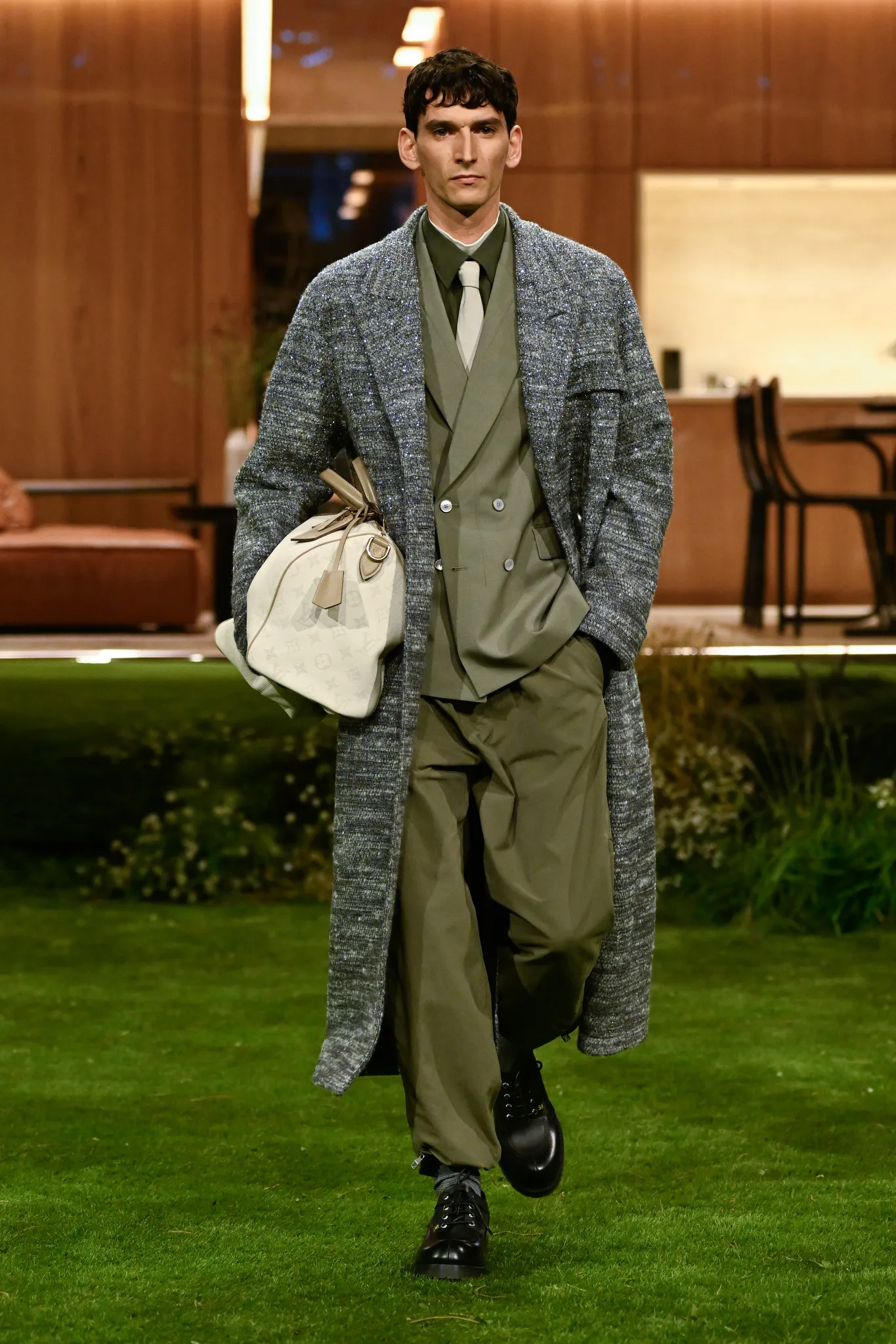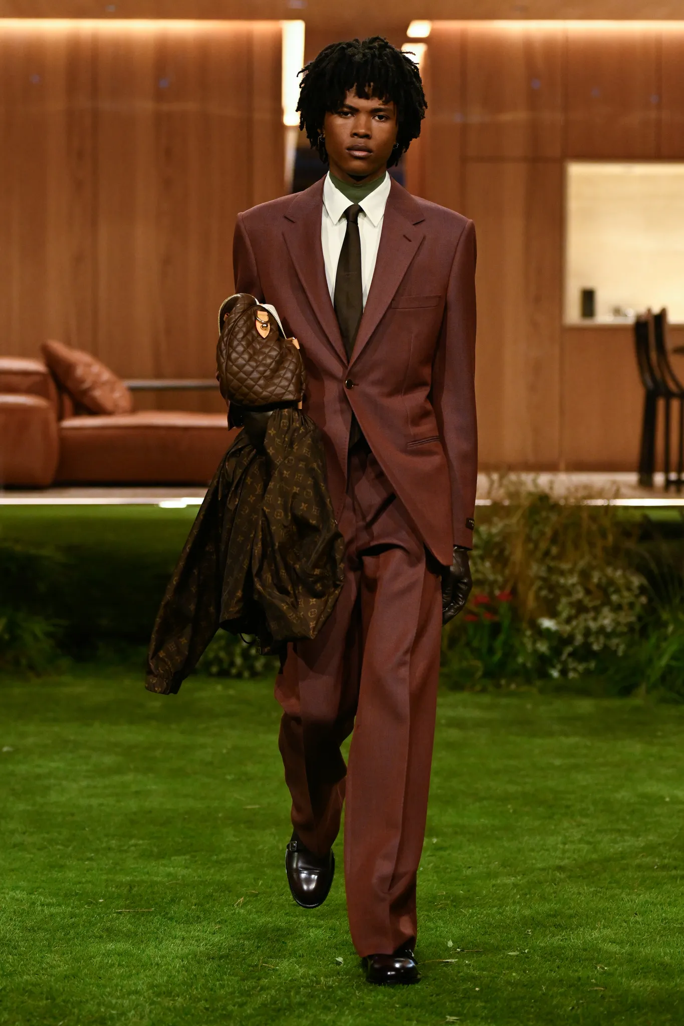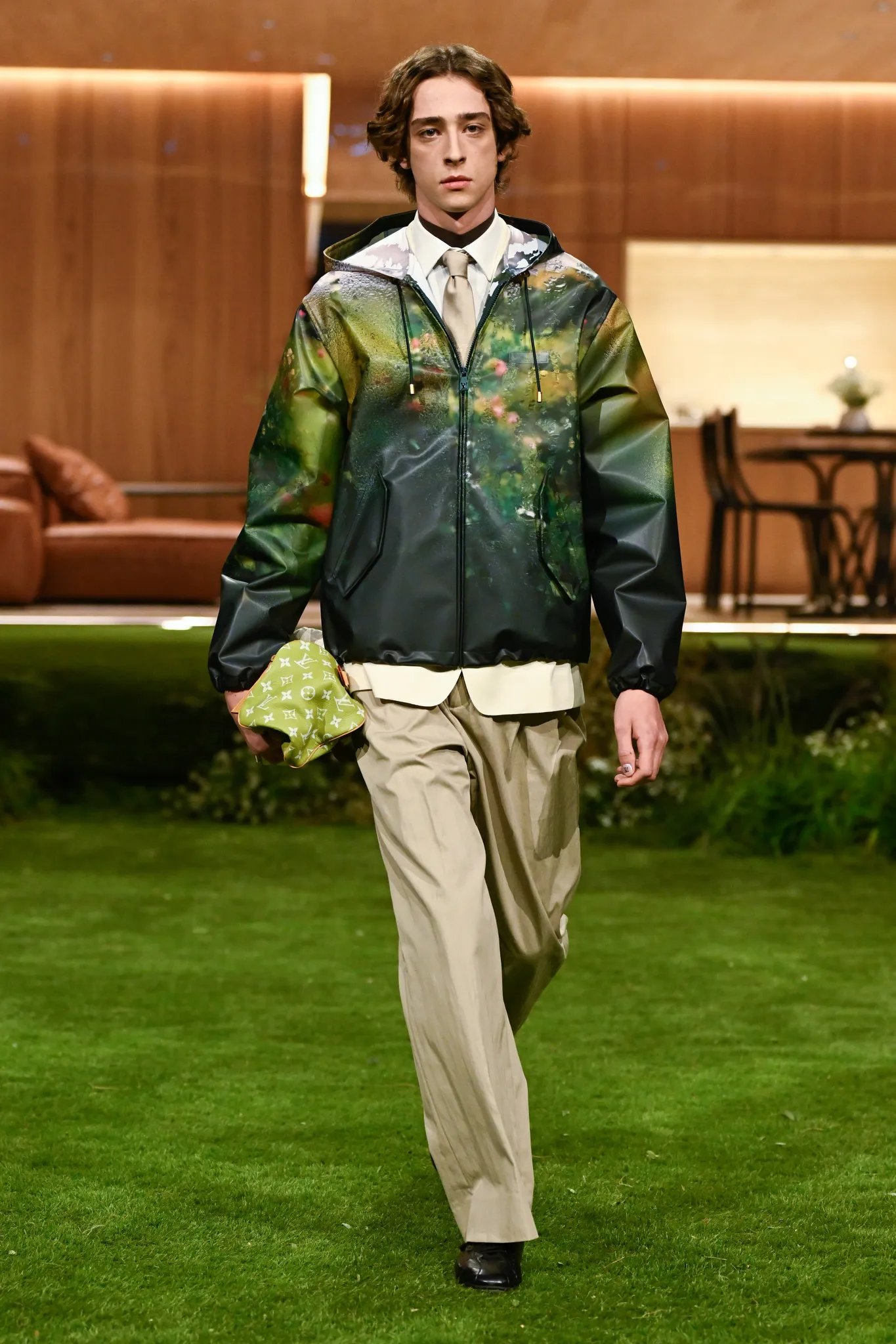 本季服装,Pharrell 重新定义了现代男士制服,将 80 年代怀旧元素融入设计:经典西装与裁剪外套与色彩丰富的运动服、创新配件同台登场。系列强调性能与耐久性——千鸟格、鱼骨纹与格子西装面料在灯光下呈现微妙反光效果,丝质派克大衣结合防水膜,皱褶 Harrington 夹克加入铝丝织物。整体色彩以棕褐、深绿和卡其等自然色调为主,剪裁非正式且适合日常穿着,包括双排扣西装、皮革西装外套及奢华鳄鱼皮飞行员夹克,从厚重牛仔布转向精裁裤装与亮眼外套,呈现高端剪裁与技术感融合的实用奢华风格。