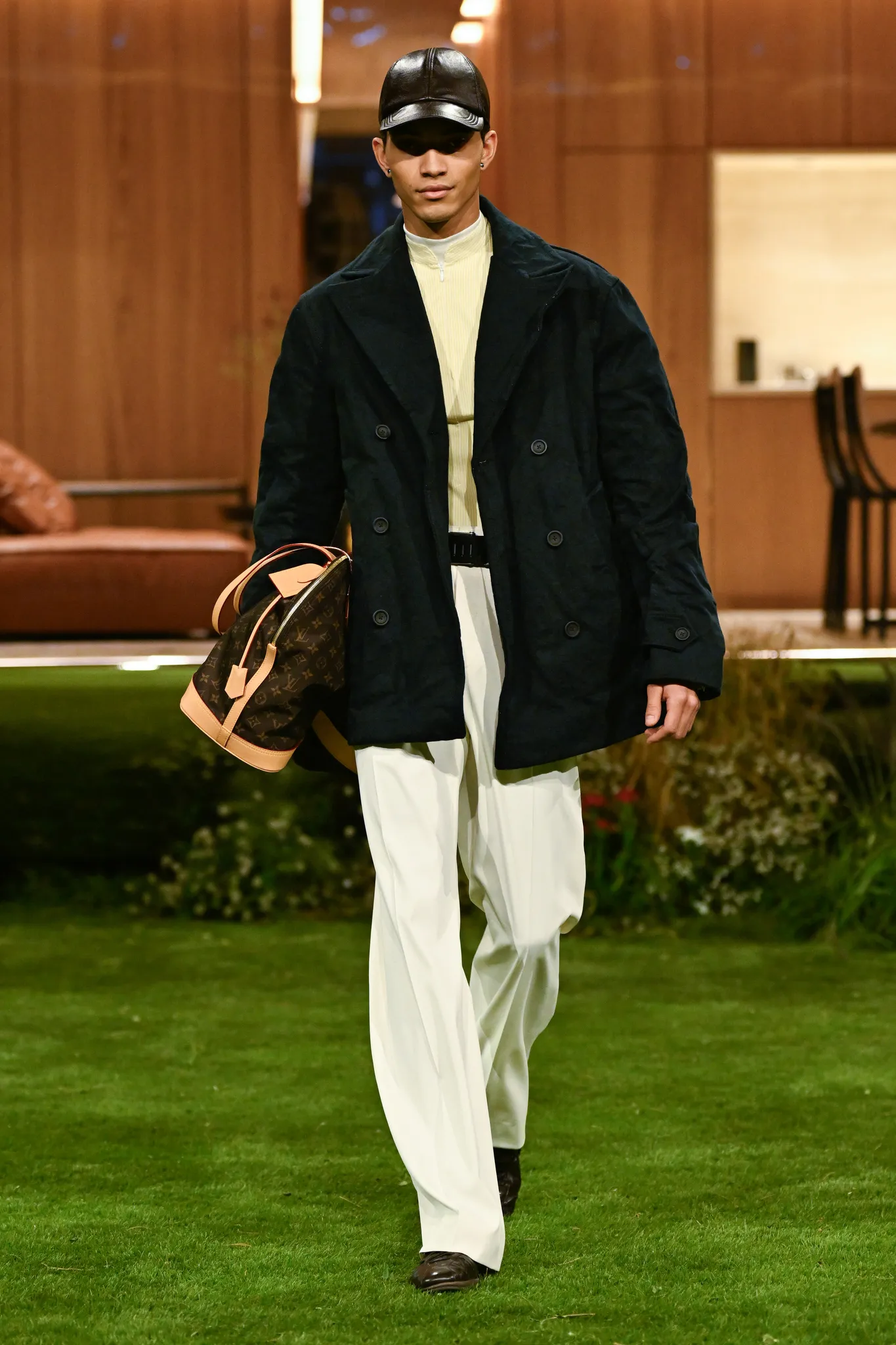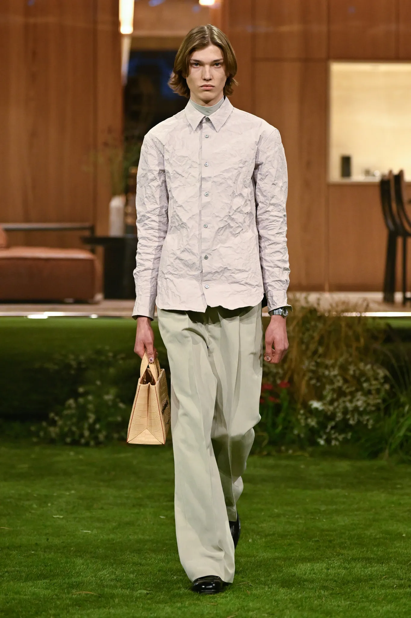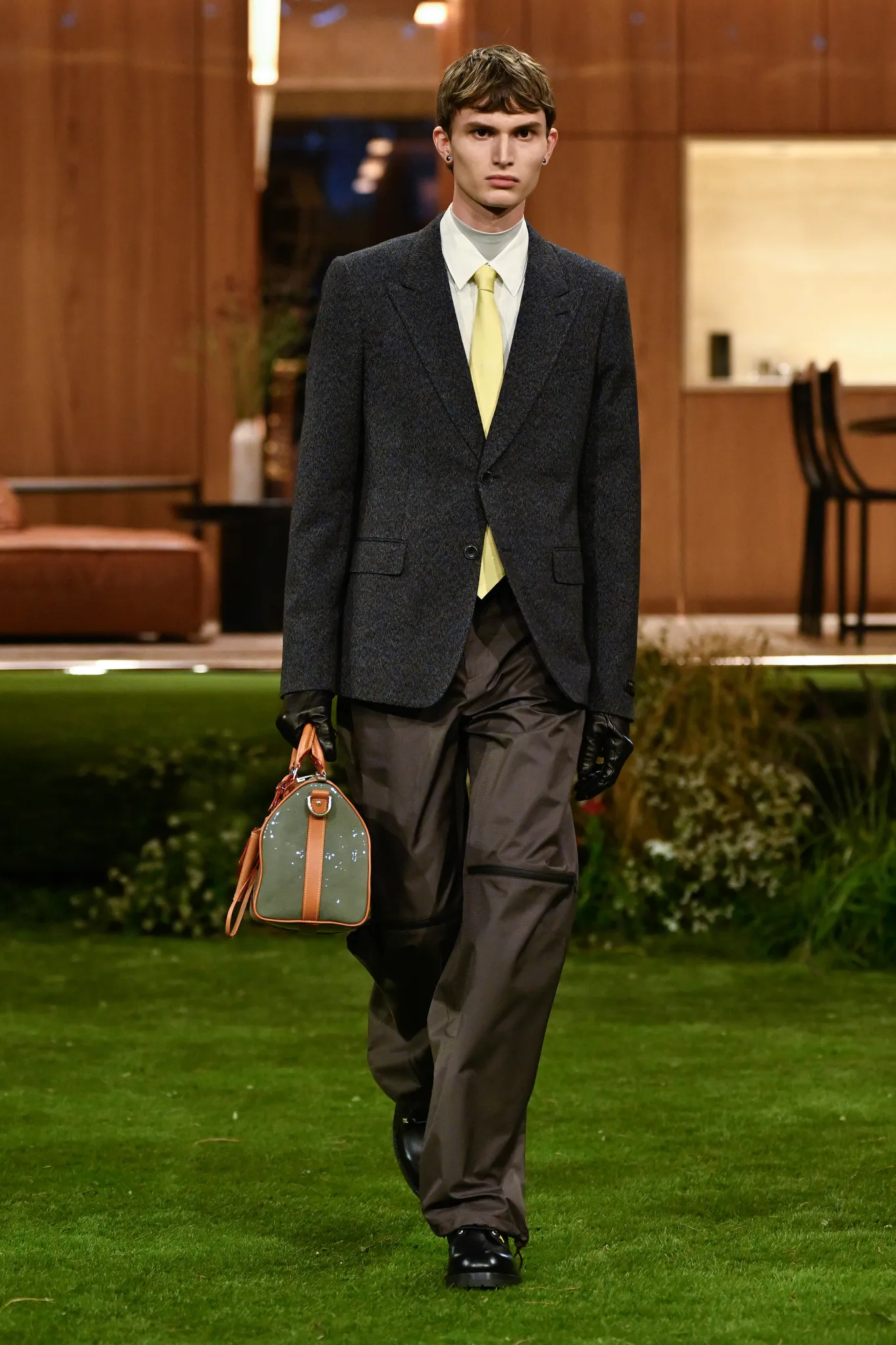 本季服装,Pharrell 重新定义了现代男士制服,将 80 年代怀旧元素融入设计:经典西装与裁剪外套与色彩丰富的运动服、创新配件同台登场。系列强调性能与耐久性——千鸟格、鱼骨纹与格子西装面料在灯光下呈现微妙反光效果,丝质派克大衣结合防水膜,皱褶 Harrington 夹克加入铝丝织物。整体色彩以棕褐、深绿和卡其等自然色调为主,剪裁非正式且适合日常穿着,包括双排扣西装、皮革西装外套及奢华鳄鱼皮飞行员夹克,从厚重牛仔布转向精裁裤装与亮眼外套,呈现高端剪裁与技术感融合的实用奢华风格。