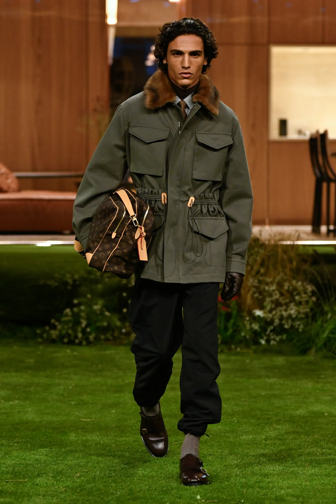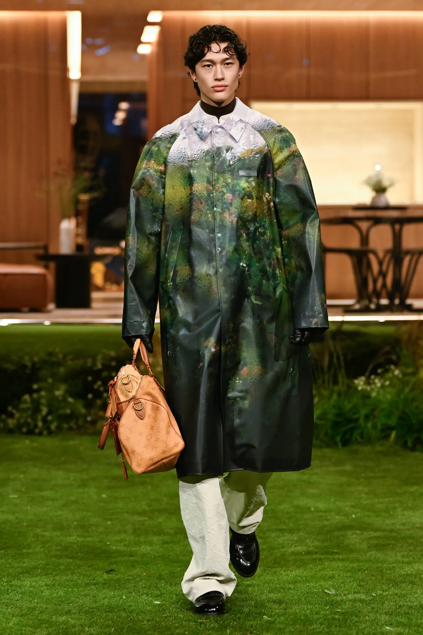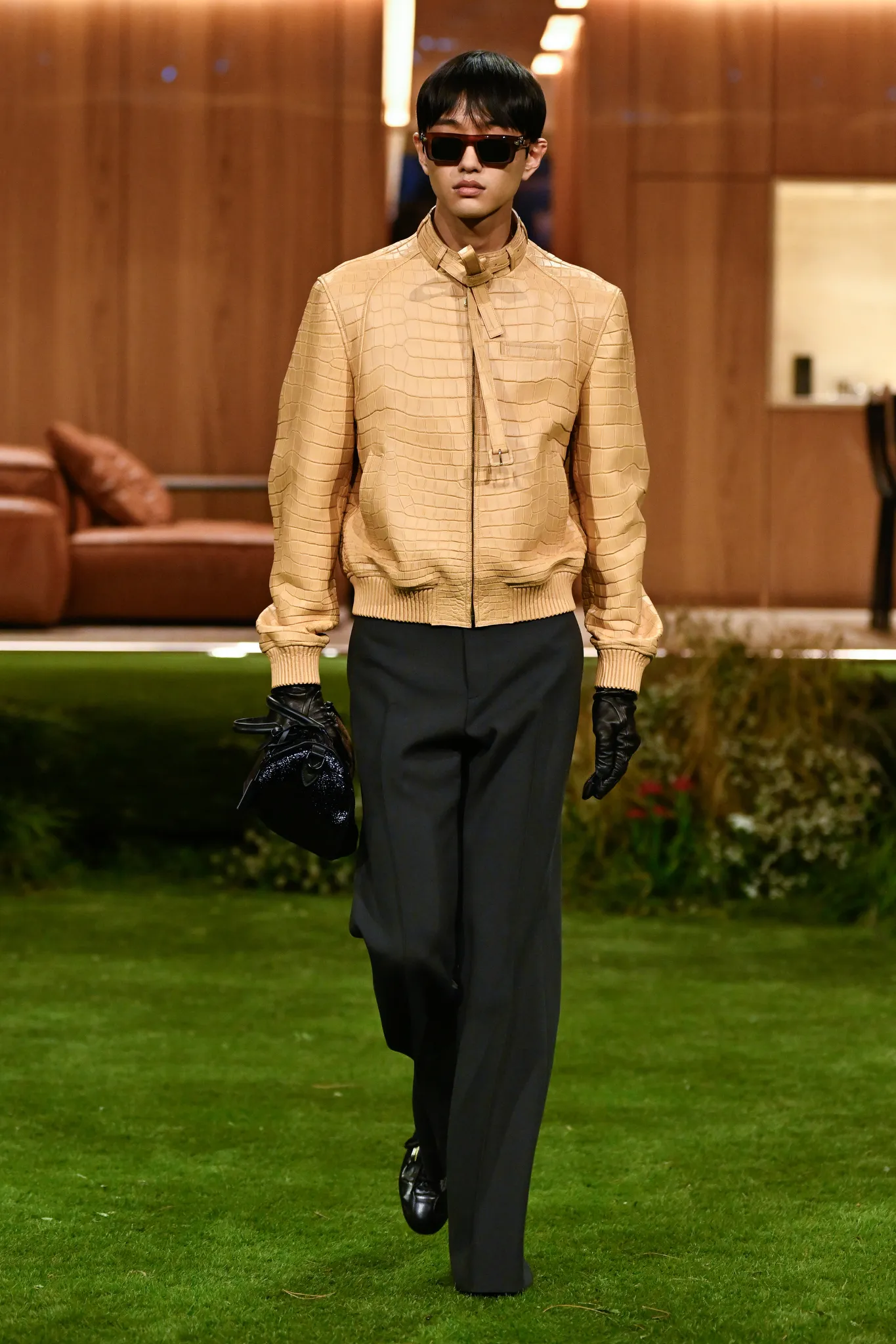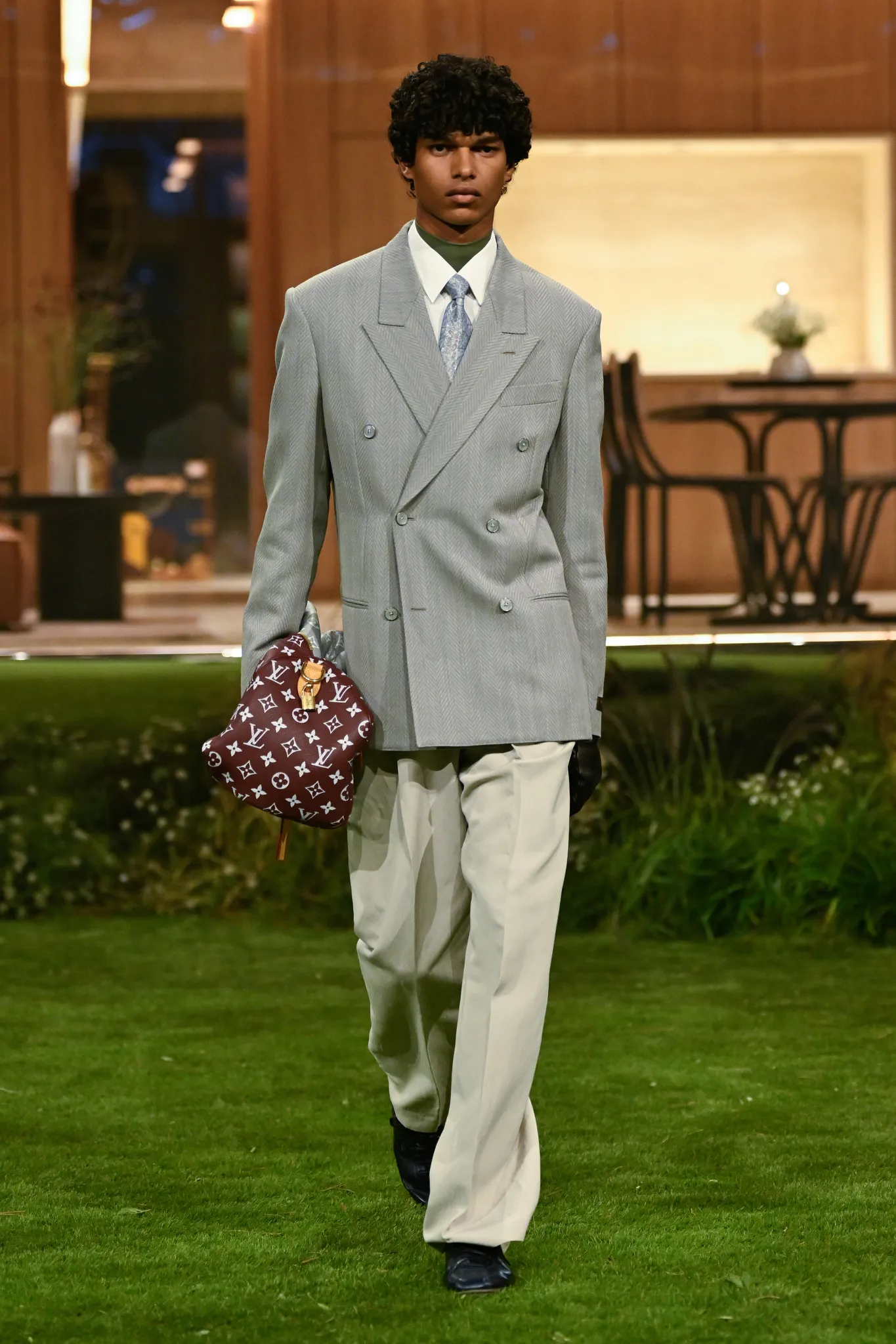 本季服装,Pharrell 重新定义了现代男士制服,将 80 年代怀旧元素融入设计:经典西装与裁剪外套与色彩丰富的运动服、创新配件同台登场。系列强调性能与耐久性——千鸟格、鱼骨纹与格子西装面料在灯光下呈现微妙反光效果,丝质派克大衣结合防水膜,皱褶 Harrington 夹克加入铝丝织物。整体色彩以棕褐、深绿和卡其等自然色调为主,剪裁非正式且适合日常穿着,包括双排扣西装、皮革西装外套及奢华鳄鱼皮飞行员夹克,从厚重牛仔布转向精裁裤装与亮眼外套,呈现高端剪裁与技术感融合的实用奢华风格。